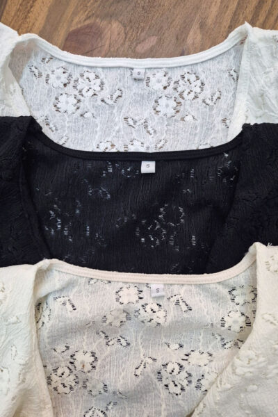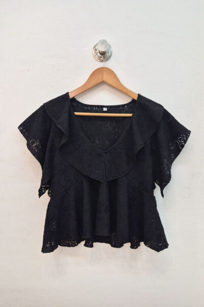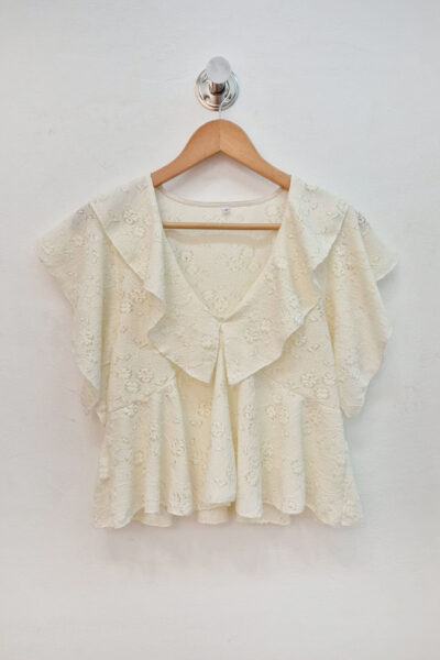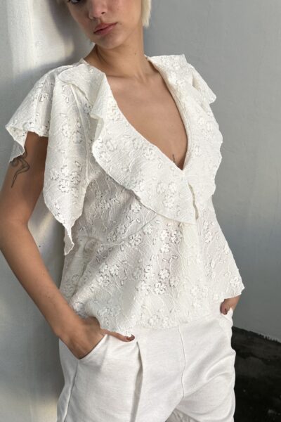 Blusa confeccionada en seda broderie con lycra. Presenta volados delicados y mangas abiertas que aportan movimiento y frescura al diseño.