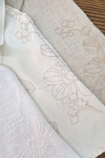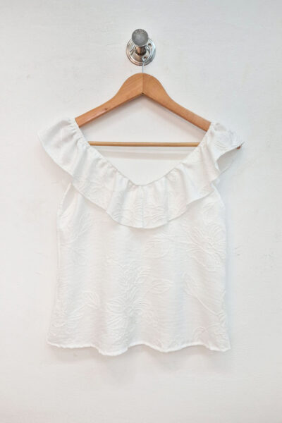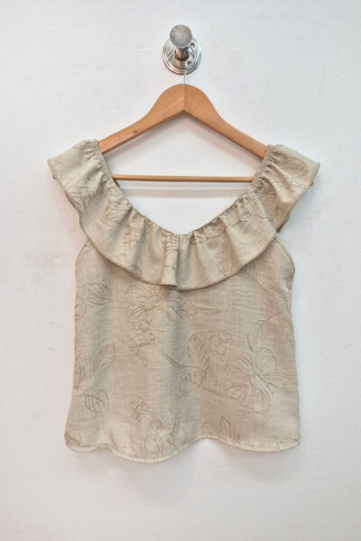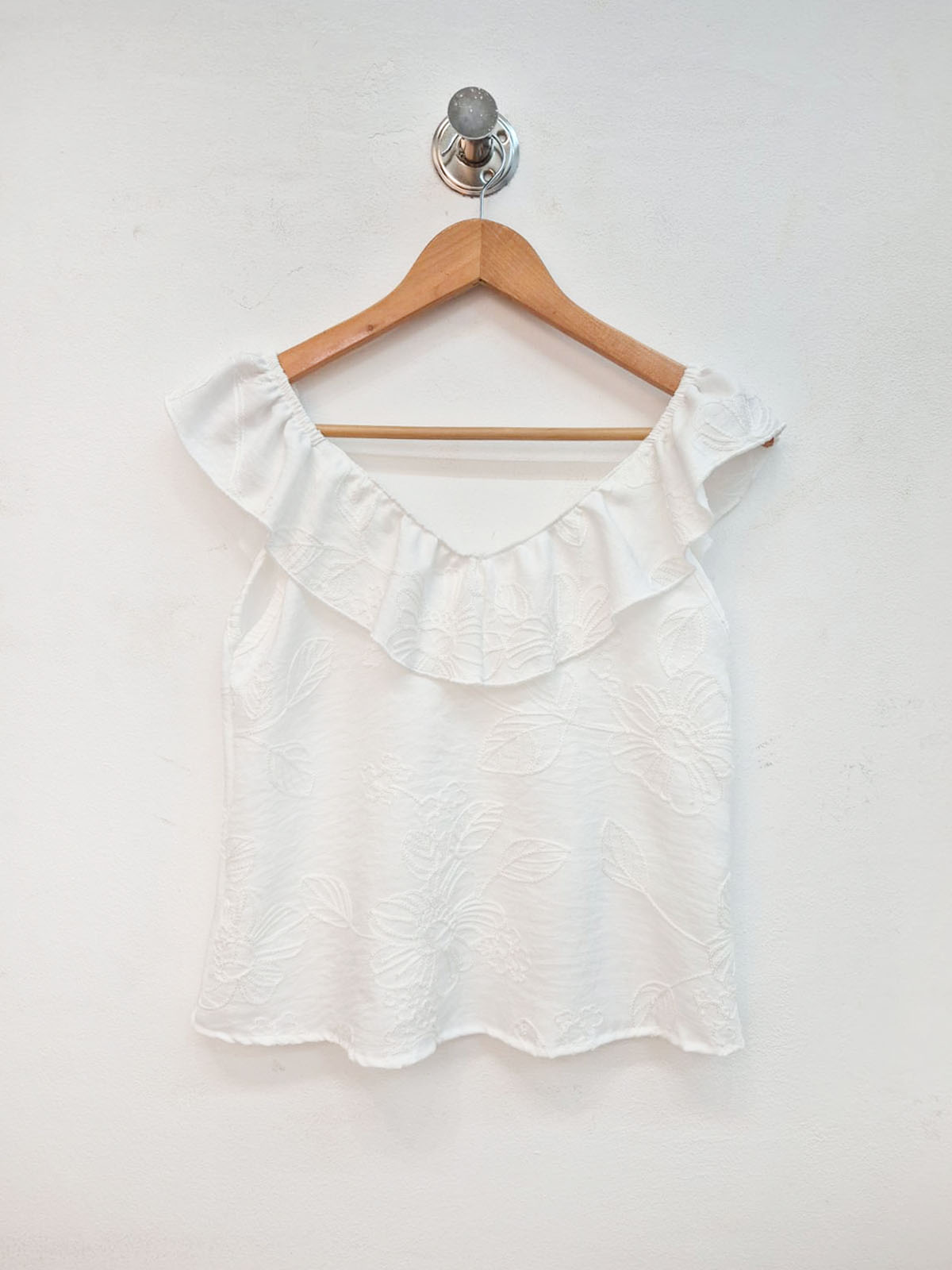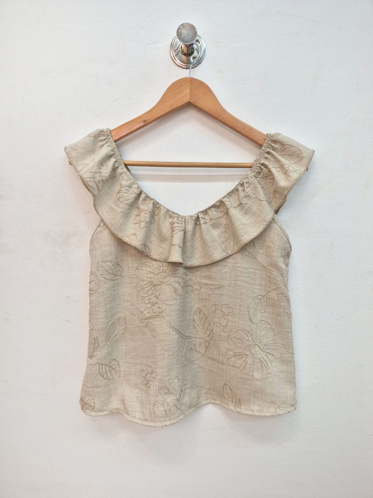 Blusa confeccionada en twill bordado, sin mangas y con volados en el escote.