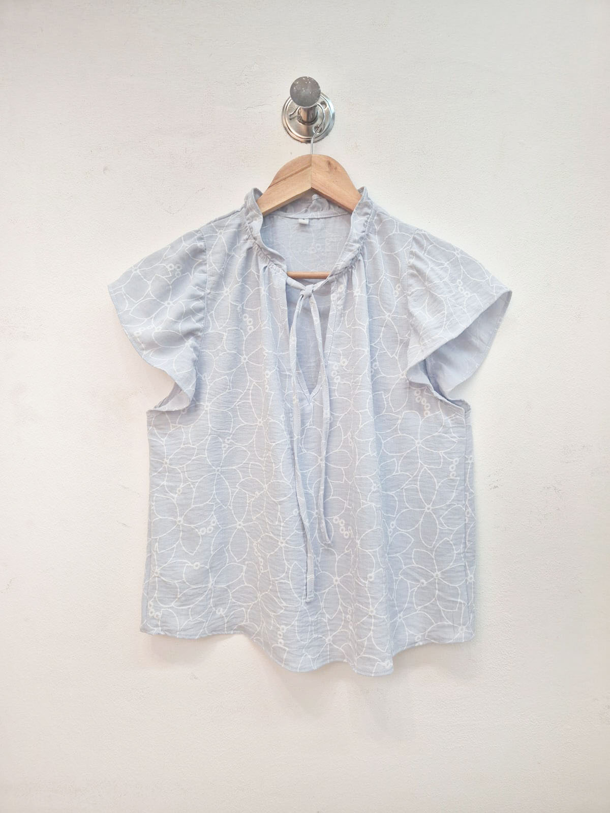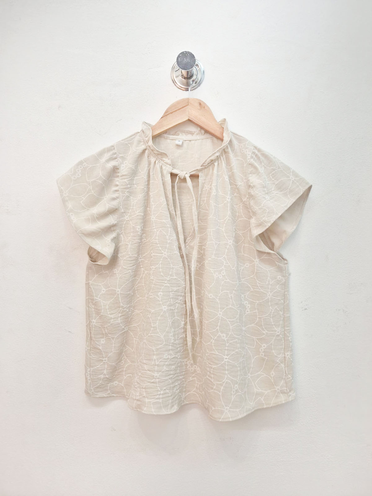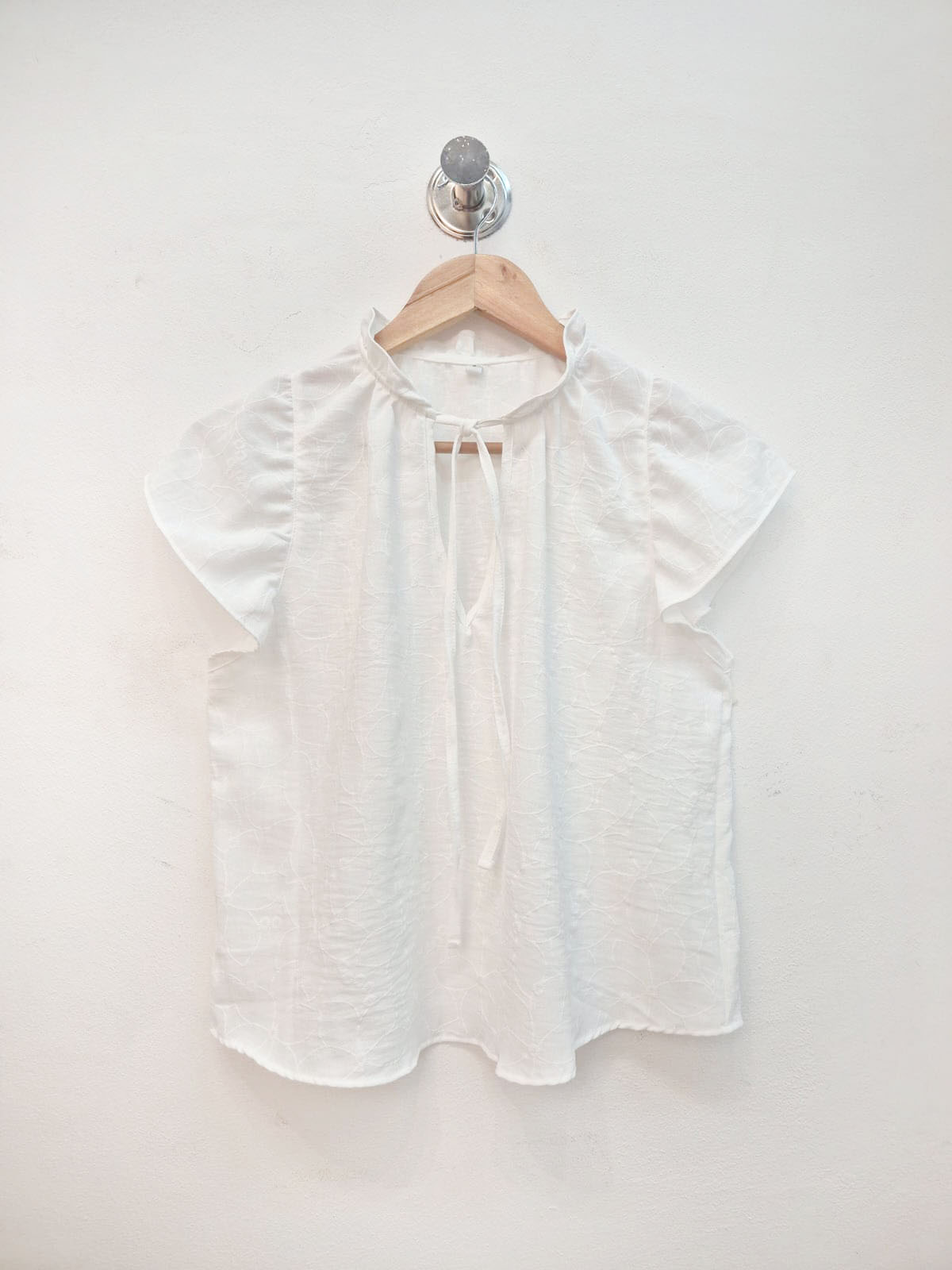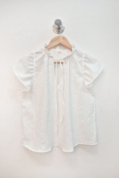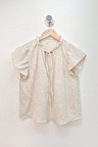 Blusa confeccionada en sey lino estampado con relieve. Presenta cuello redondo con voladitos y escote en pico con cordón ajustable. Manga con semi volado.