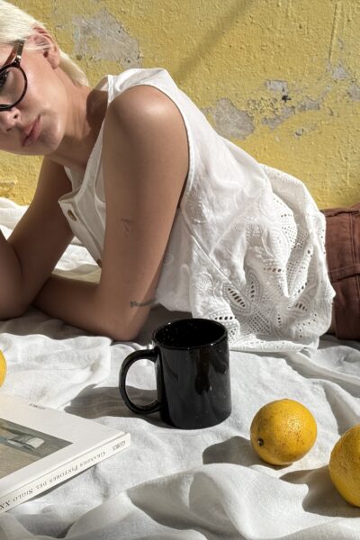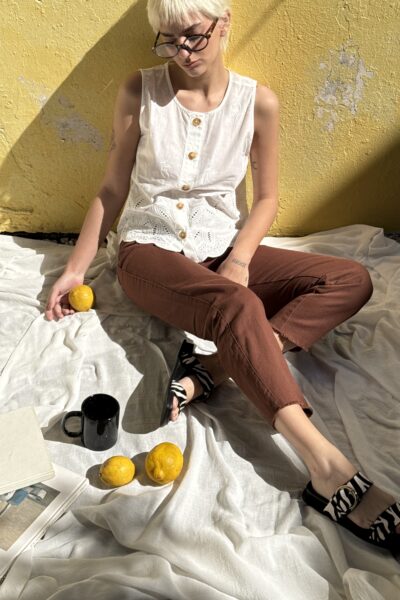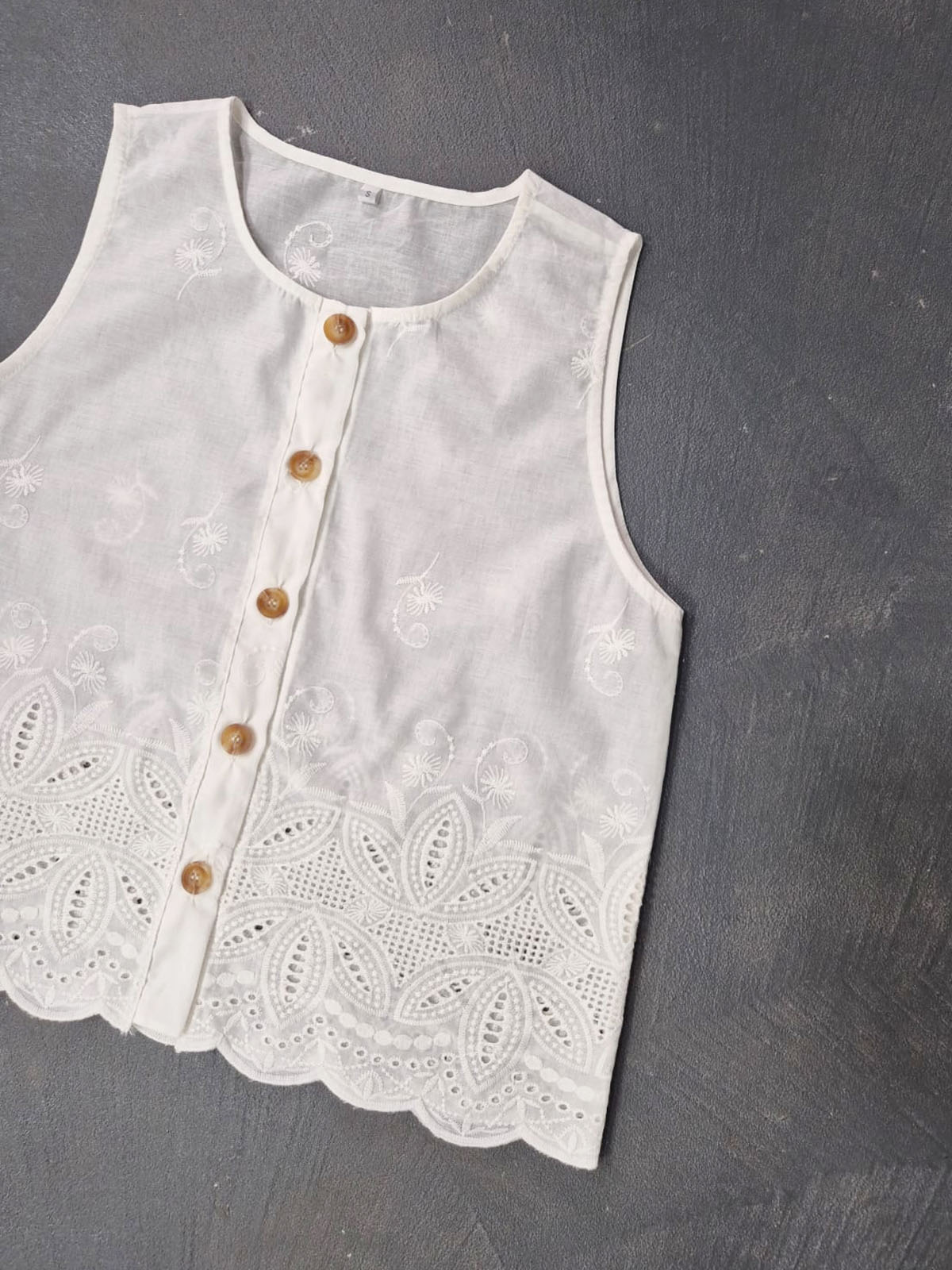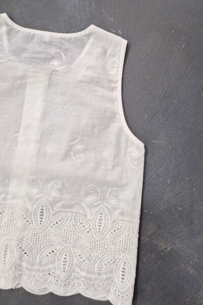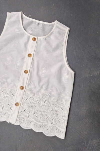 Blusa confeccionada en broderie guipur con guarda, con botones en el delantero.