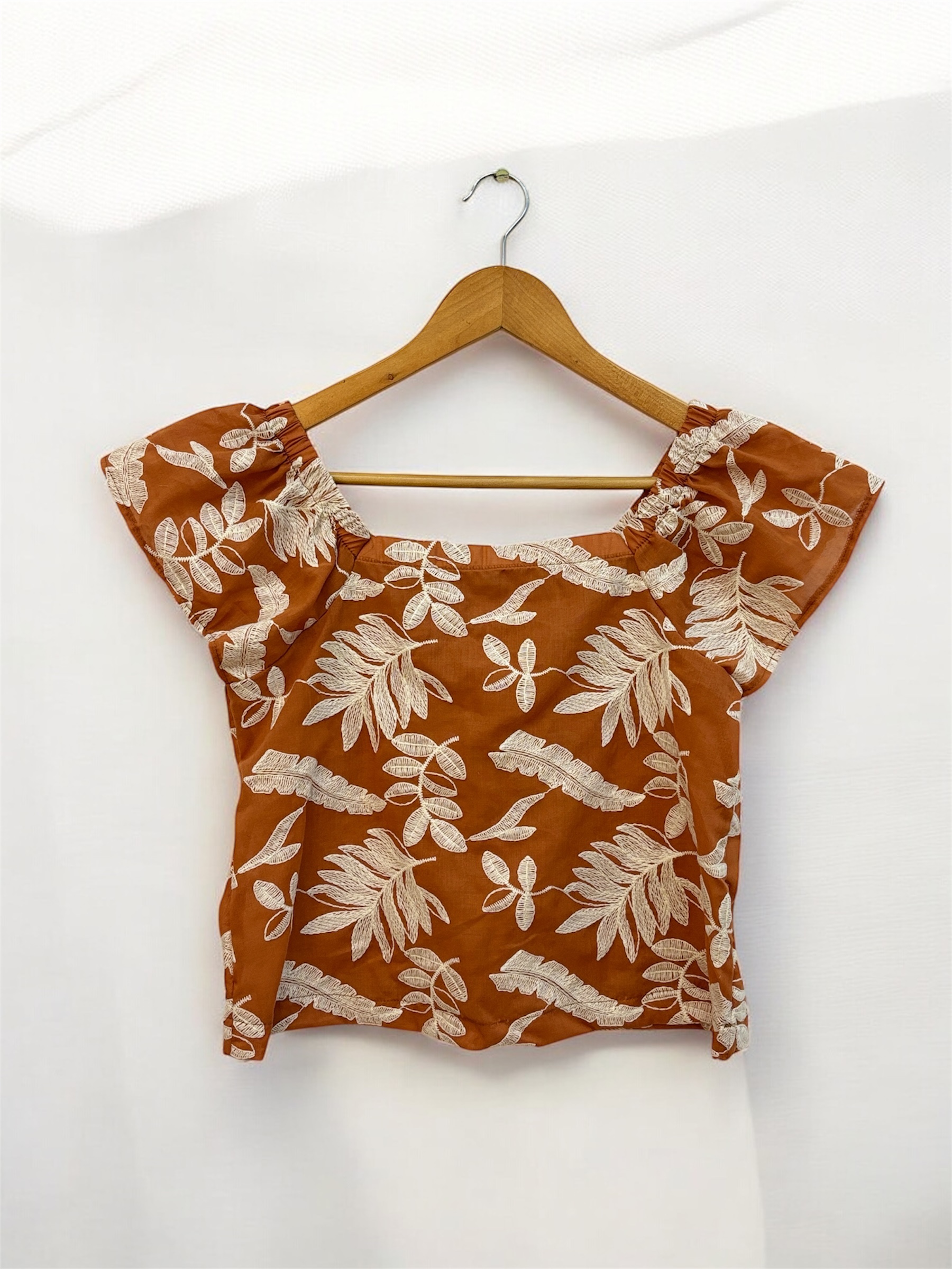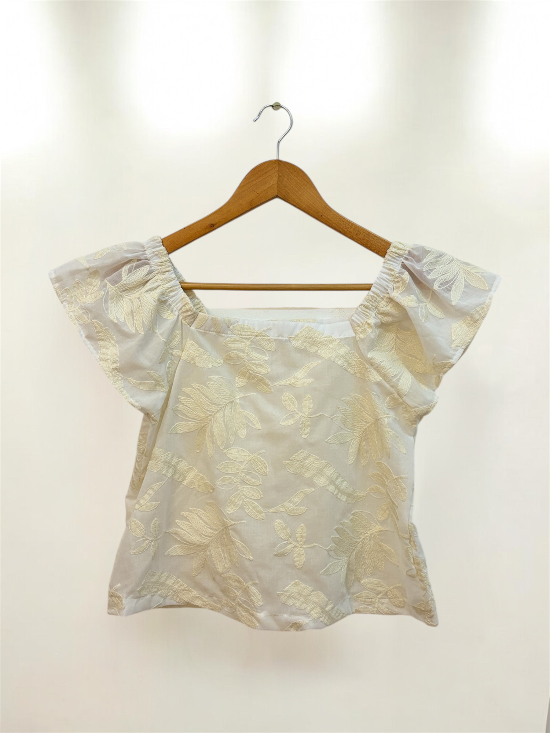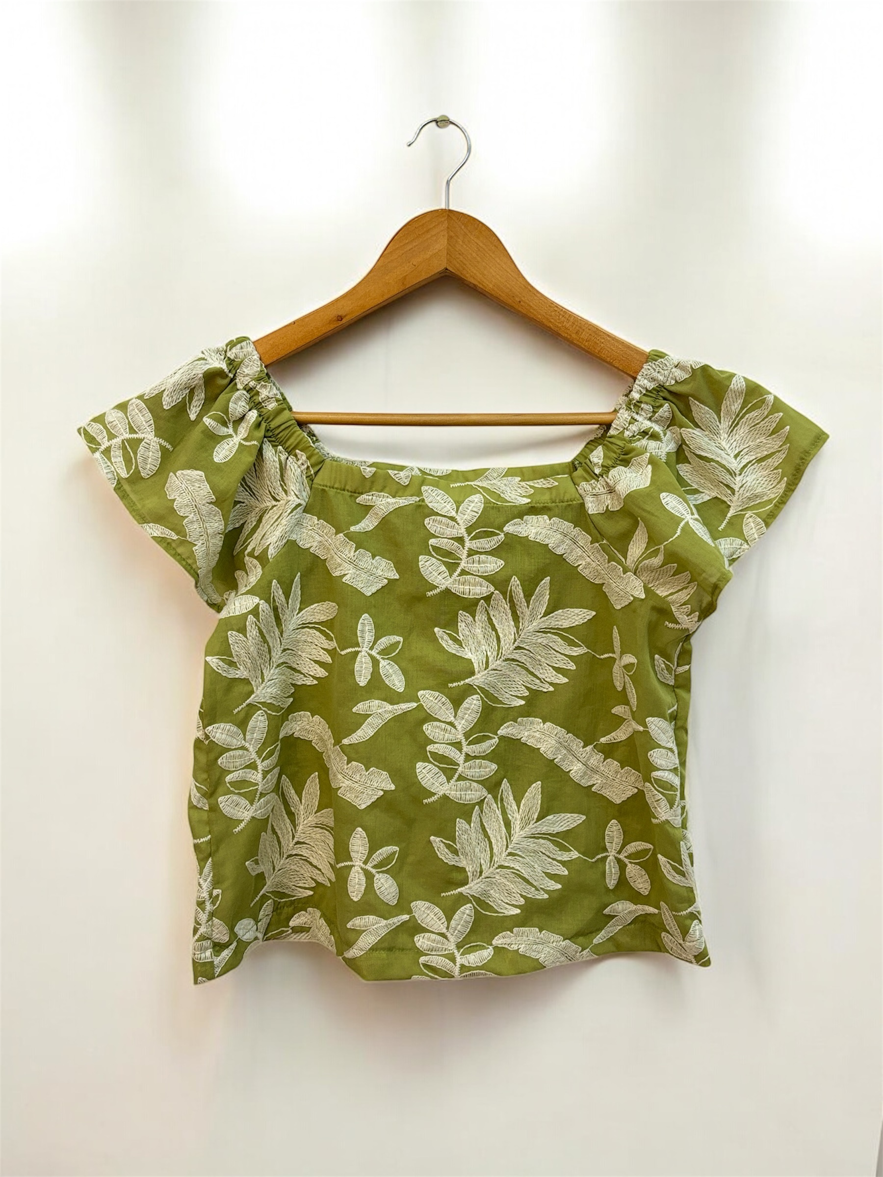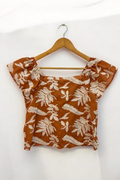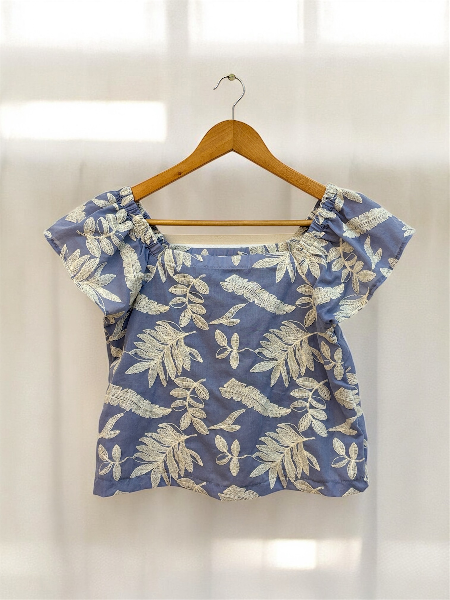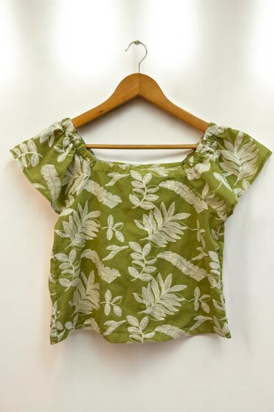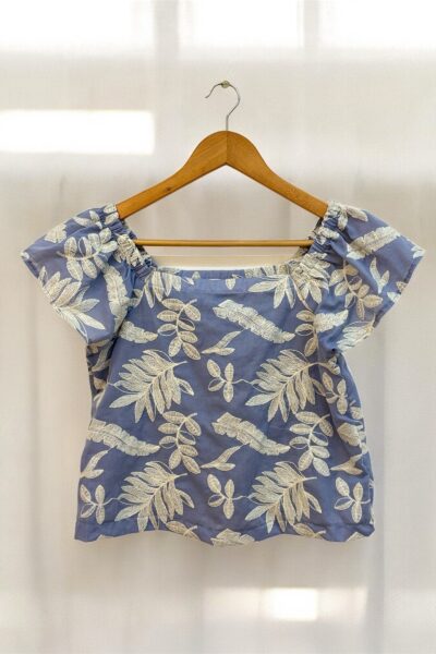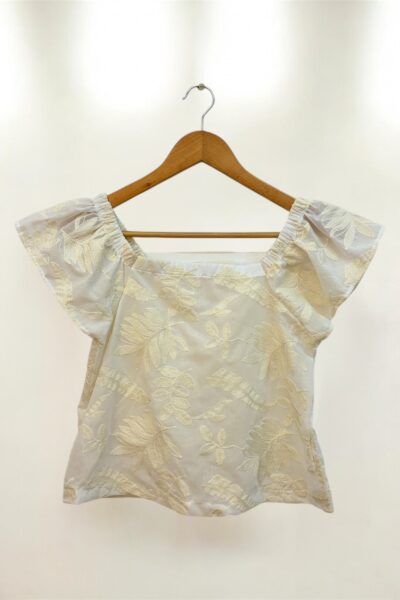 Blusa confeccionada en viscosa con bordado y frunce en los hombros con manga semi volado.