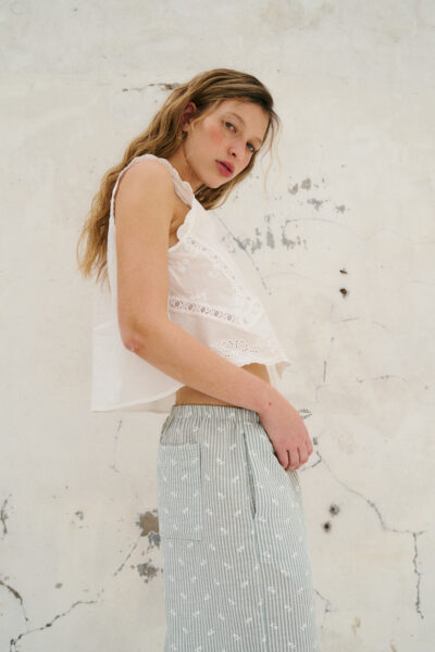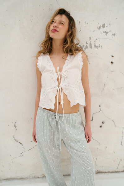 Blusa confeccionada en broderie de algodón con detalle de puntilla. Sin mangas y con tiras para anudar en el delantero. Color off white.
