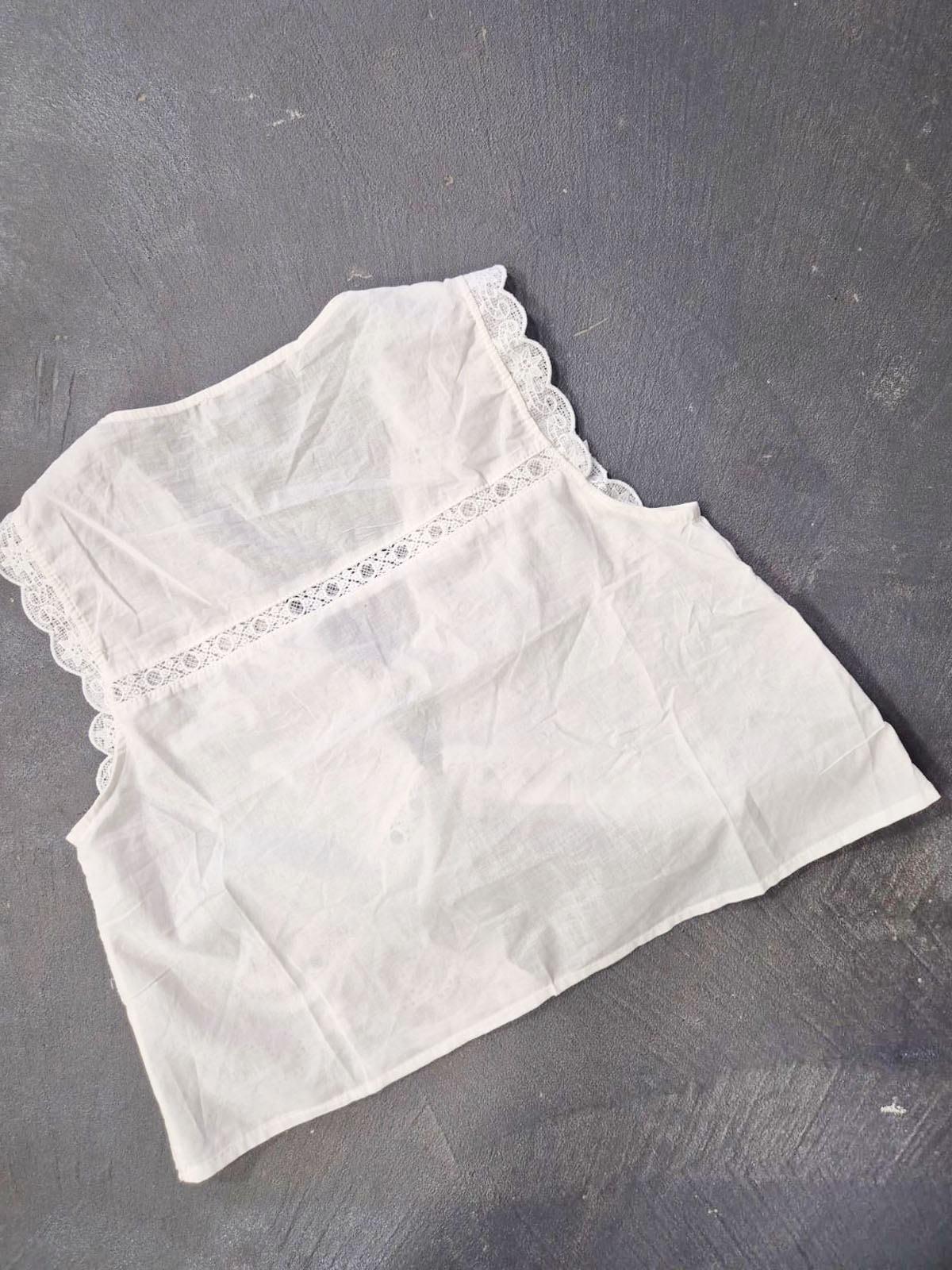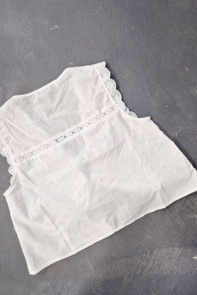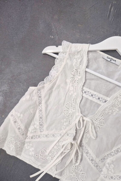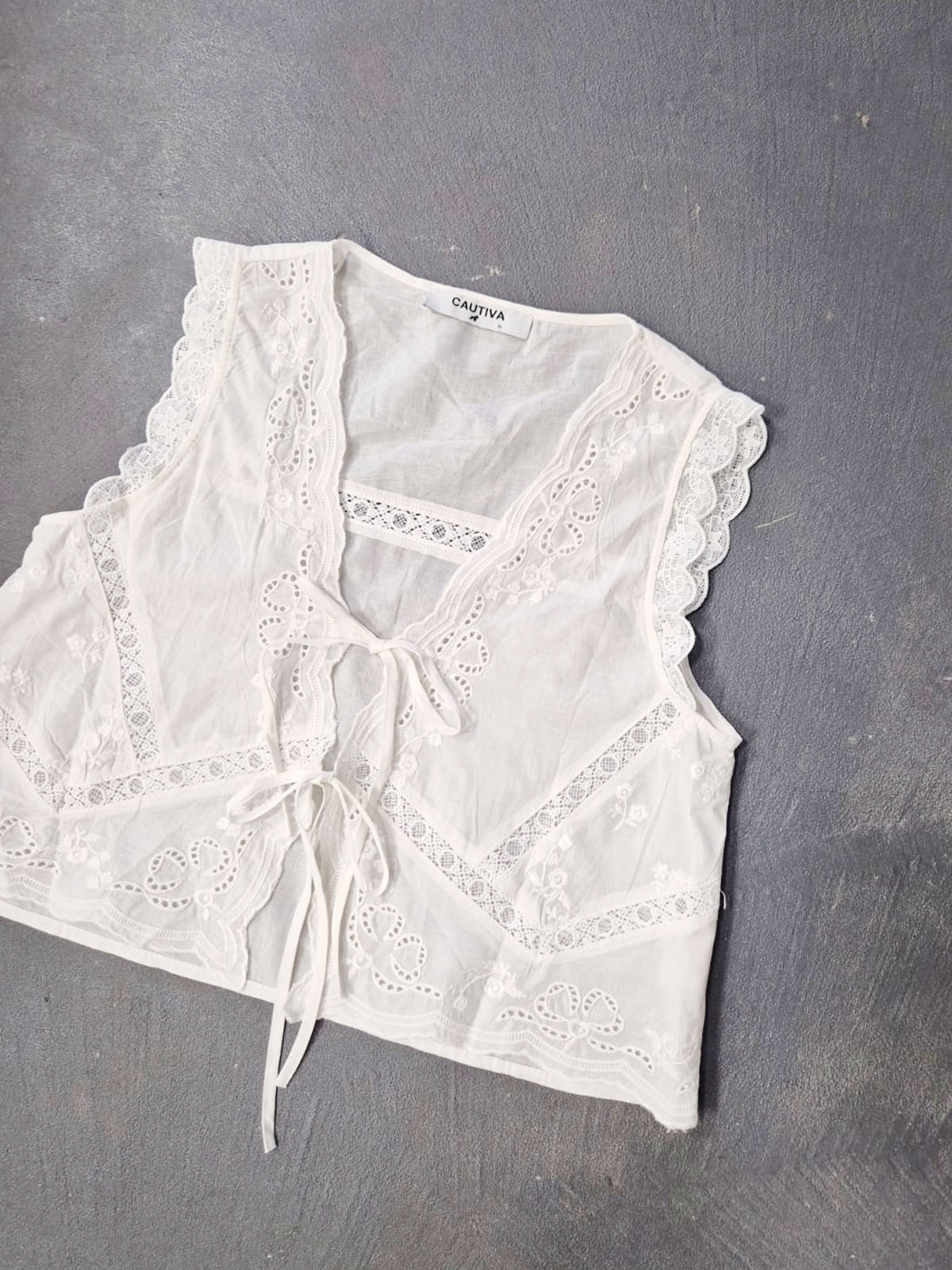 Blusa confeccionada en broderie de algodón con detalle de puntilla. Sin mangas y con tiras para anudar en el delantero. Color off white.