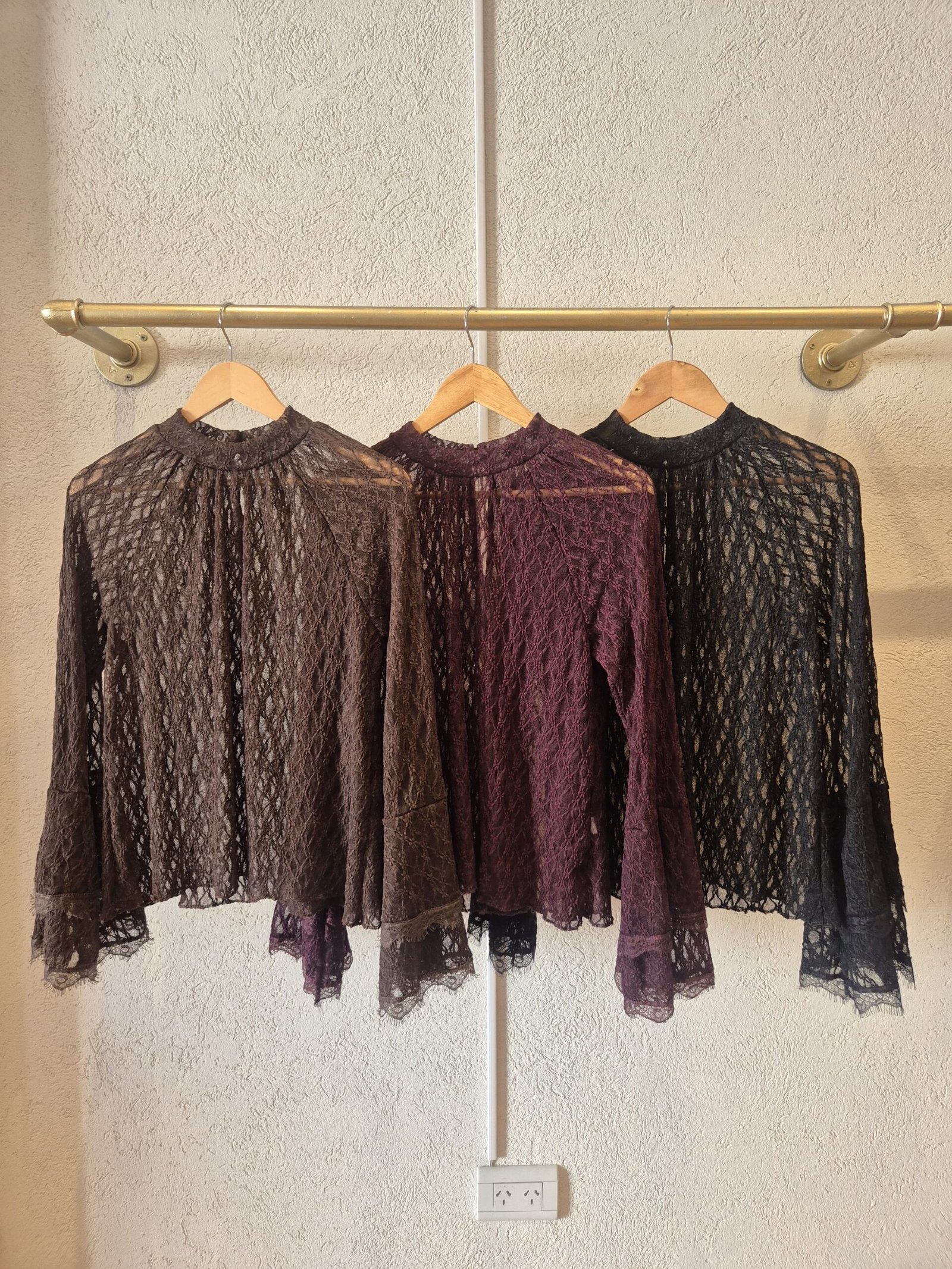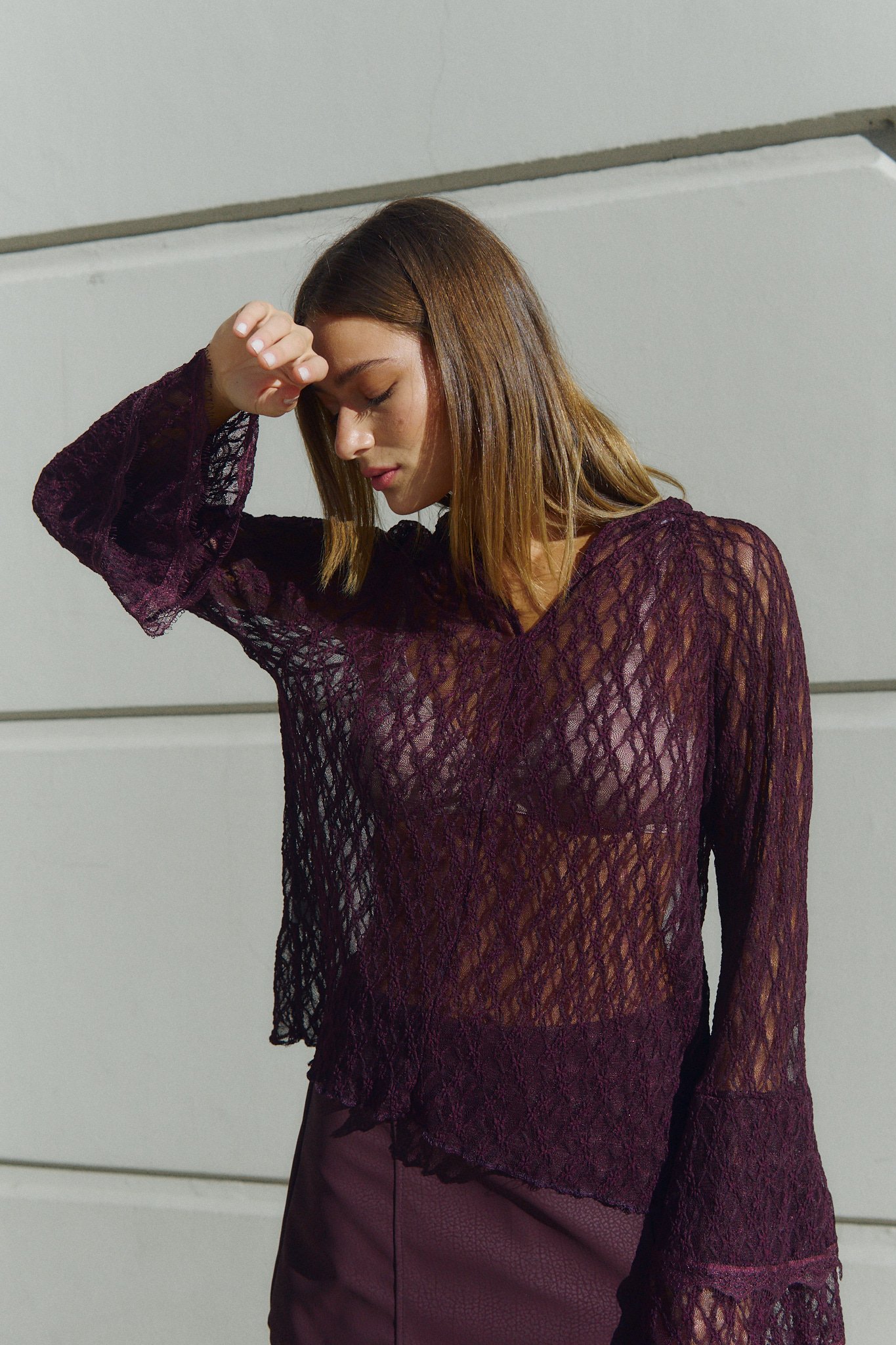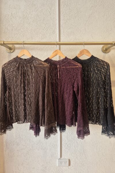 Blusa confeccionado en encaje con lycra con botones en la parte trasera del cuello para ajustar.
