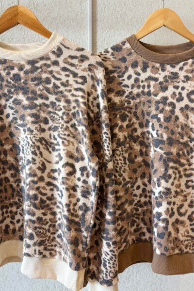 Buzo confeccionado en lanilla viscoza animal print combinado con liso en el puño. Hace conjunto con el Pantalon Camelia.