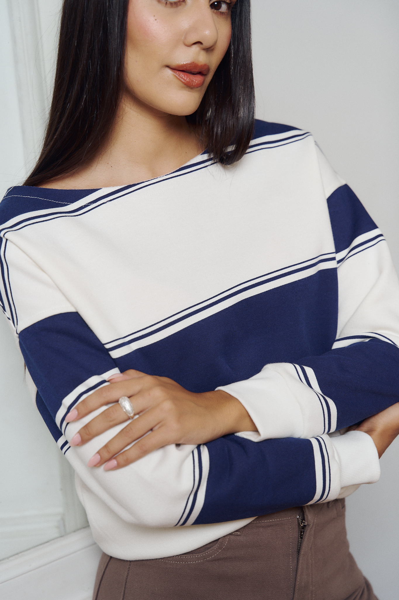 Buzo confeccionado en friza rayado con cuello vote.