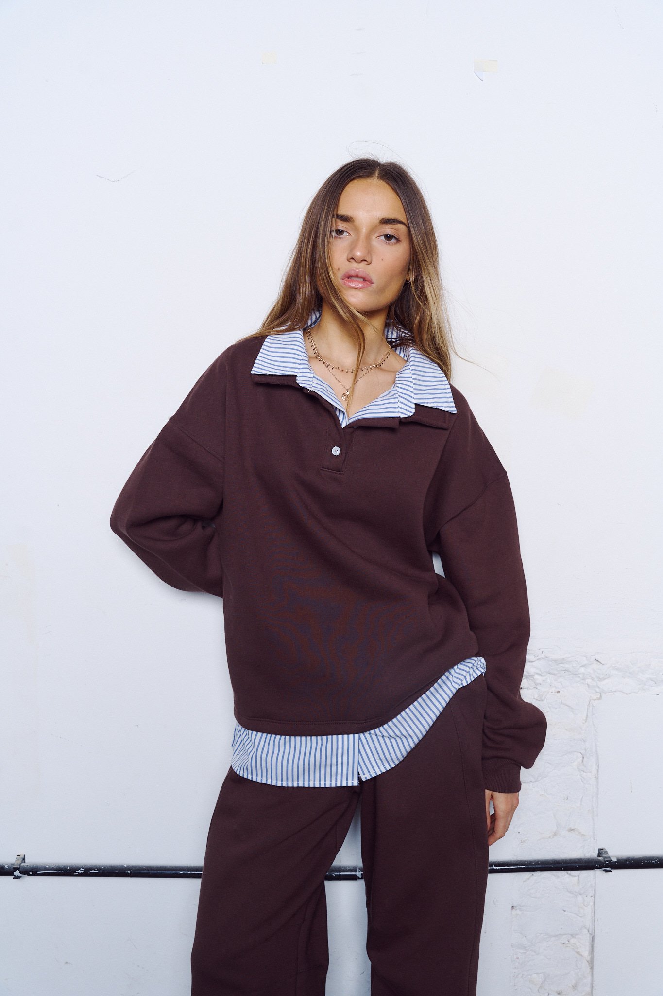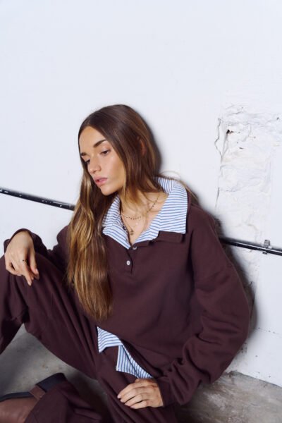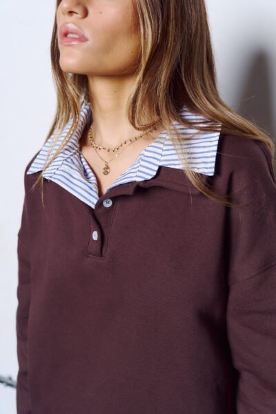 Buzo confeccionado en friza combinado con poplin rayado.