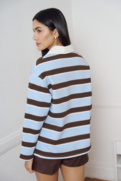 Buzo confeccionado en algodon friza rayado con cuello confeccionado en gabardina.