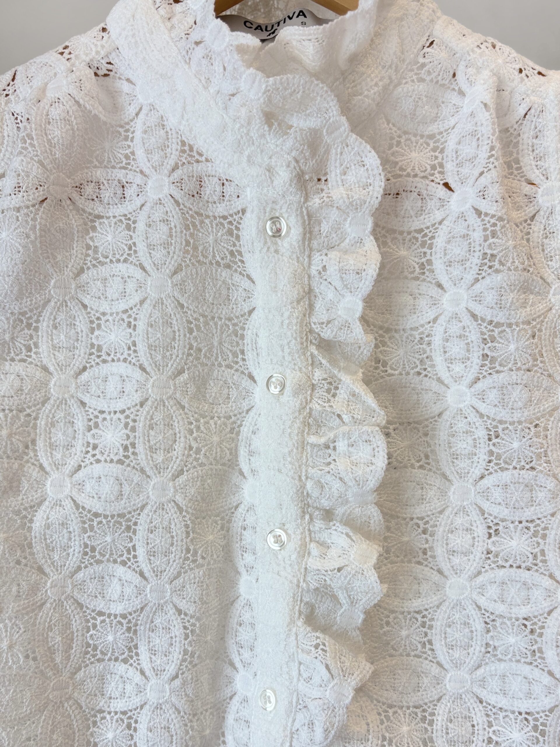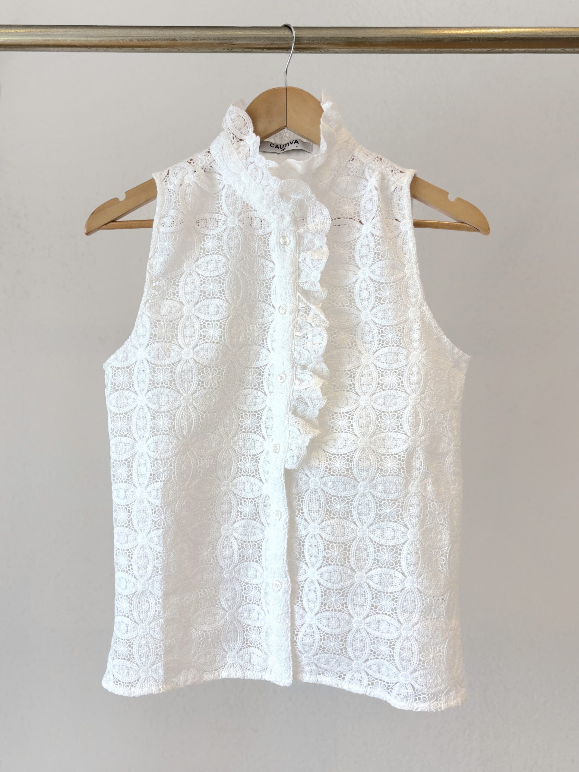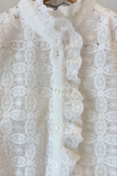 Camisa confeccionado en tela bordada, sin mangas con un semi volado desde el cuello hasta el pecho.
