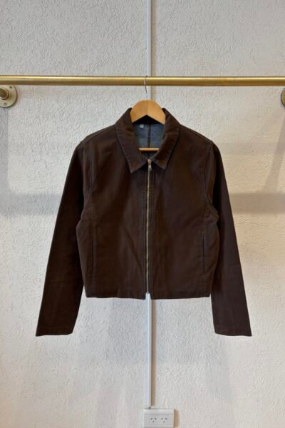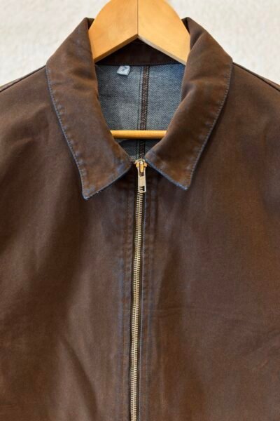 Campera confeccionado en gamuza gastado lavado con cierre y cuello polo .