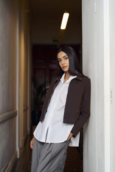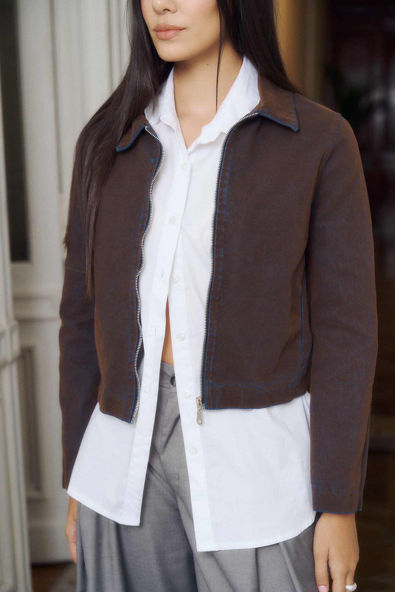 Campera confeccionado en gamuza gastado lavado con cierre y cuello polo .