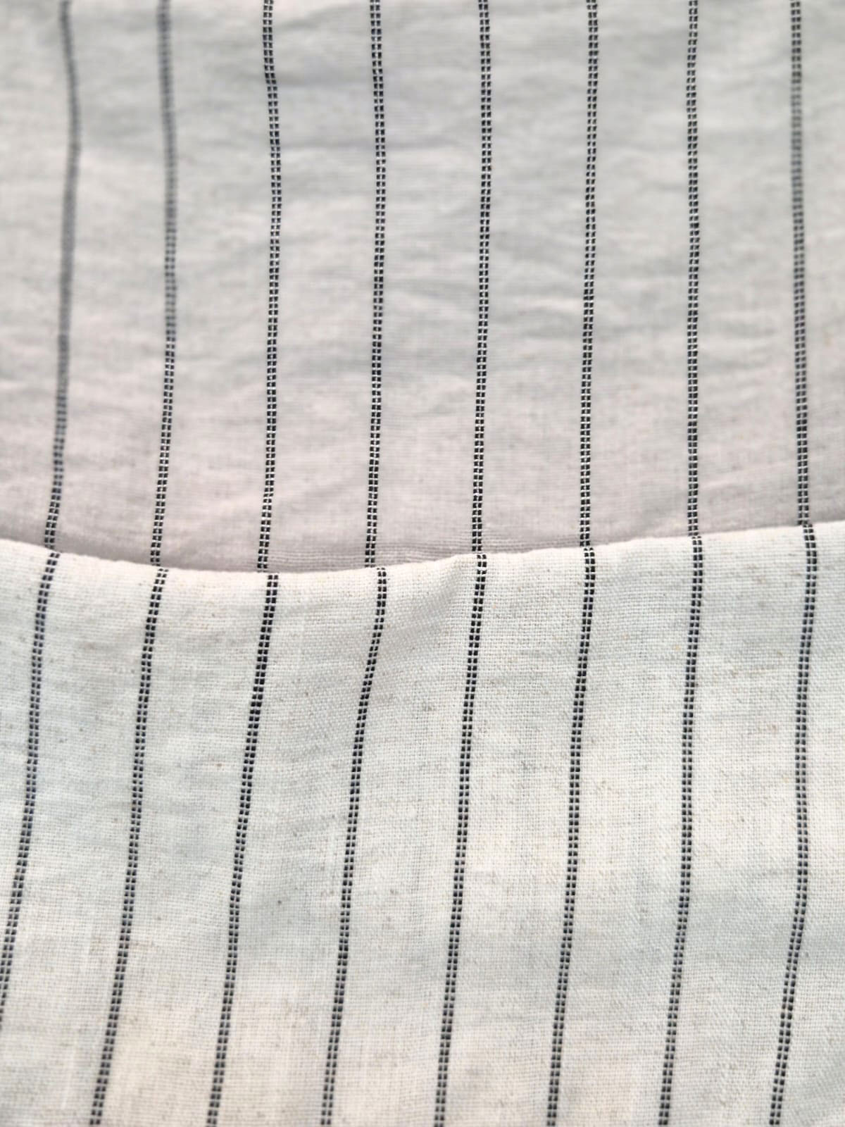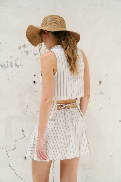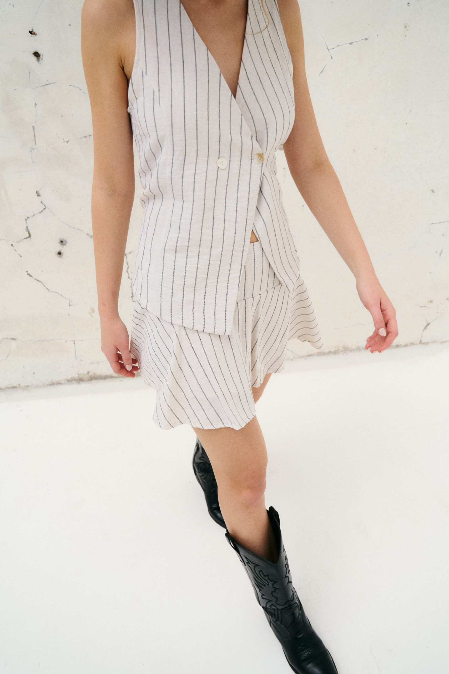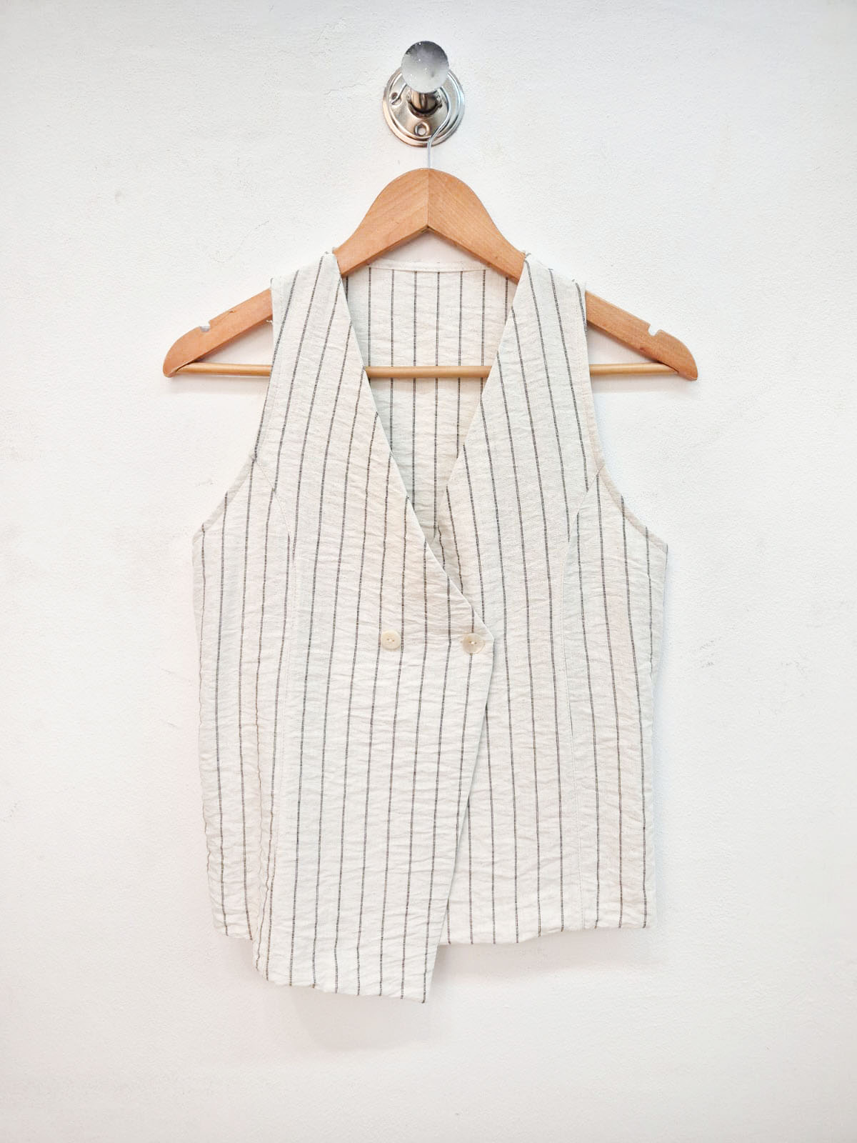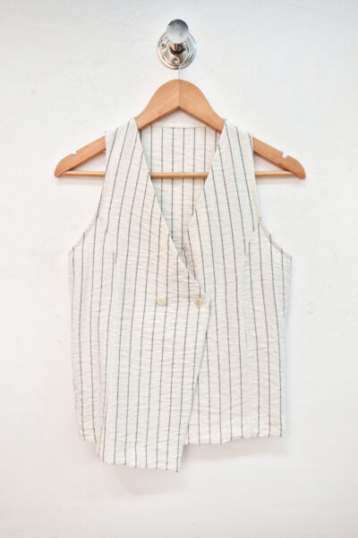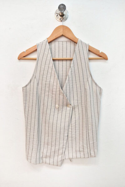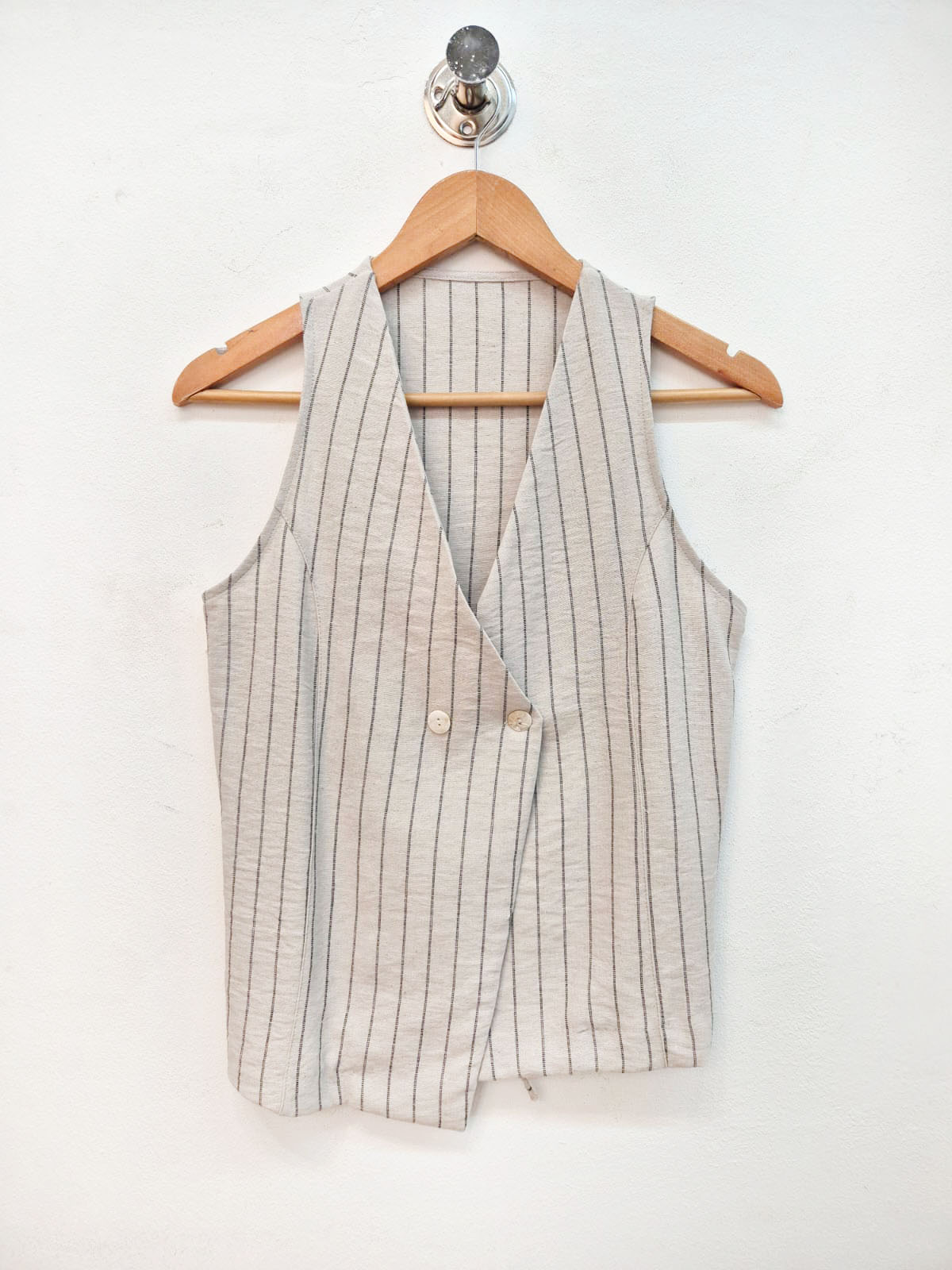 Chaleco confeccionado en twill con lino rayado, largo regular con cierre cruzado con dos botones.