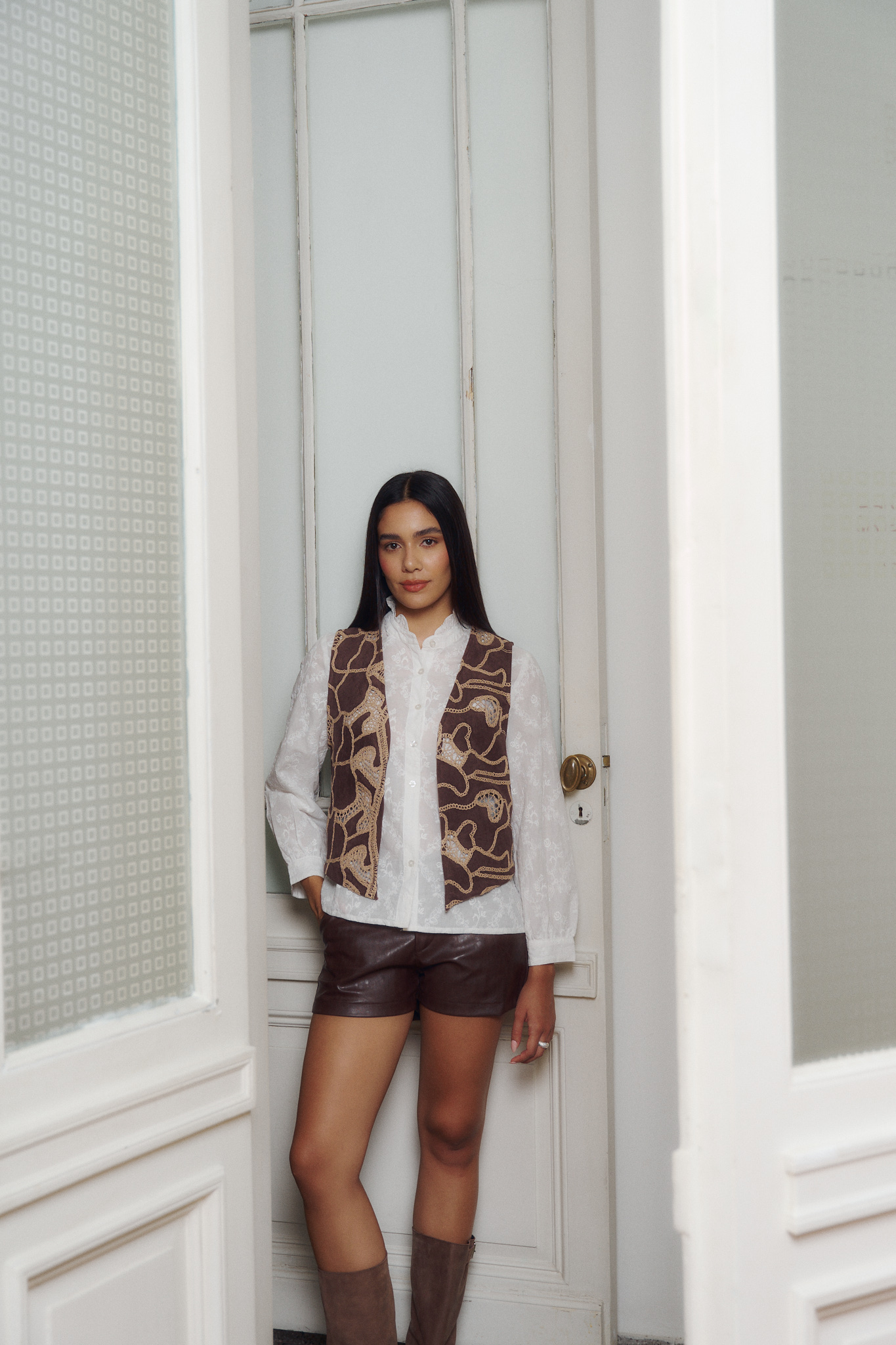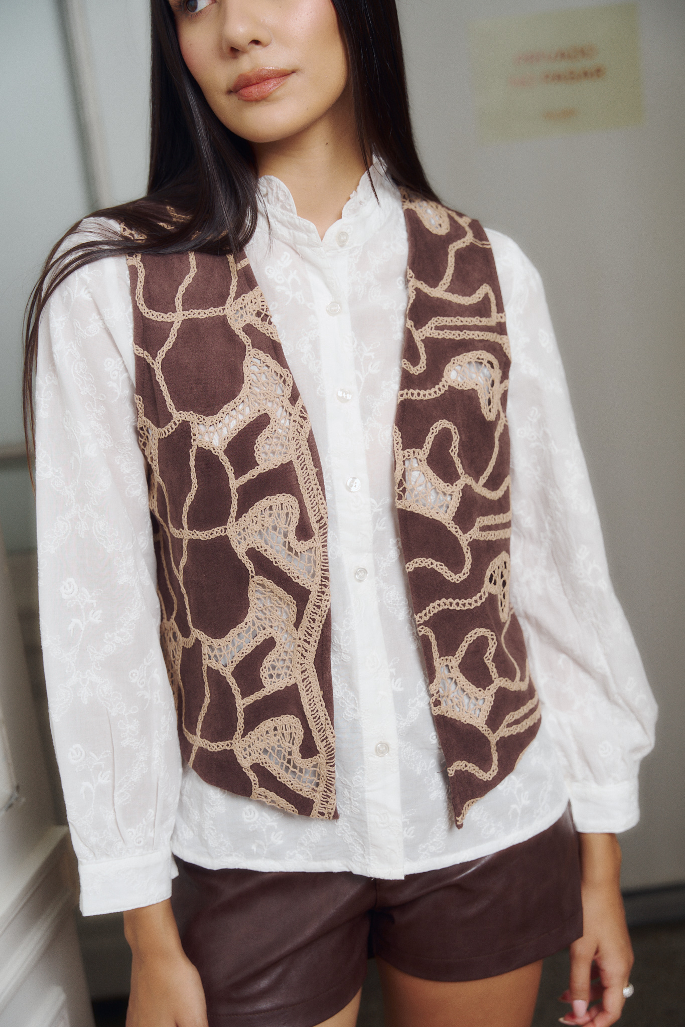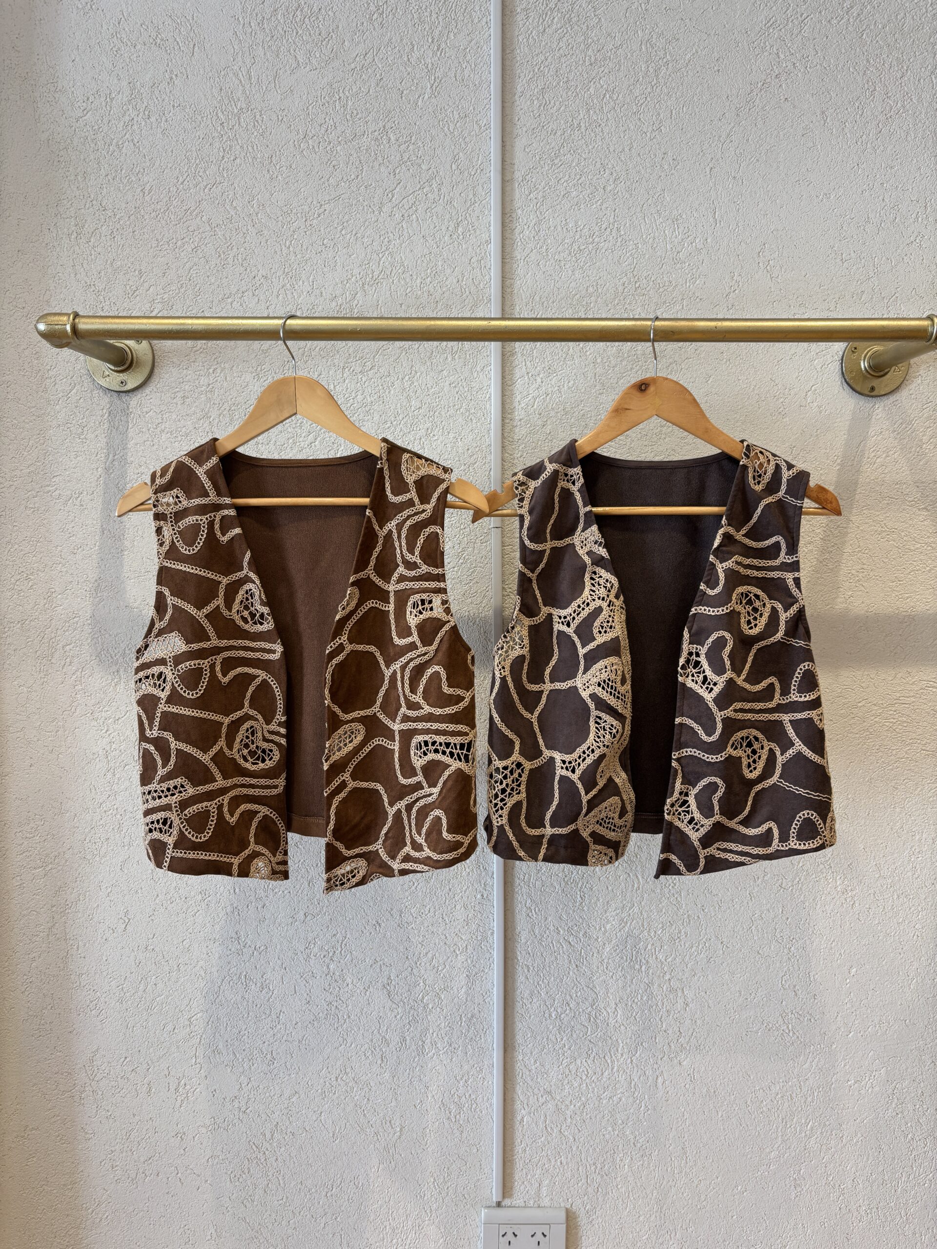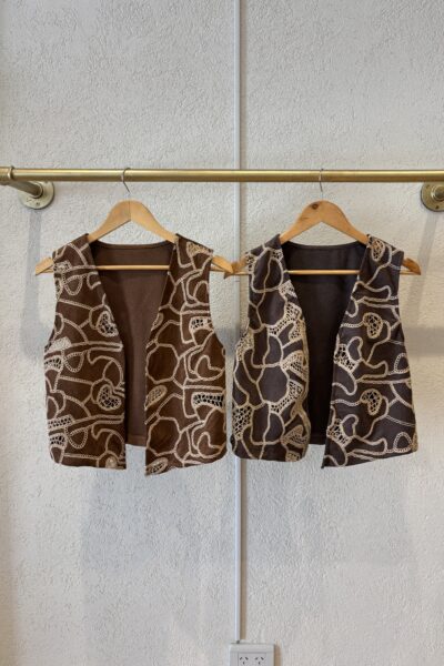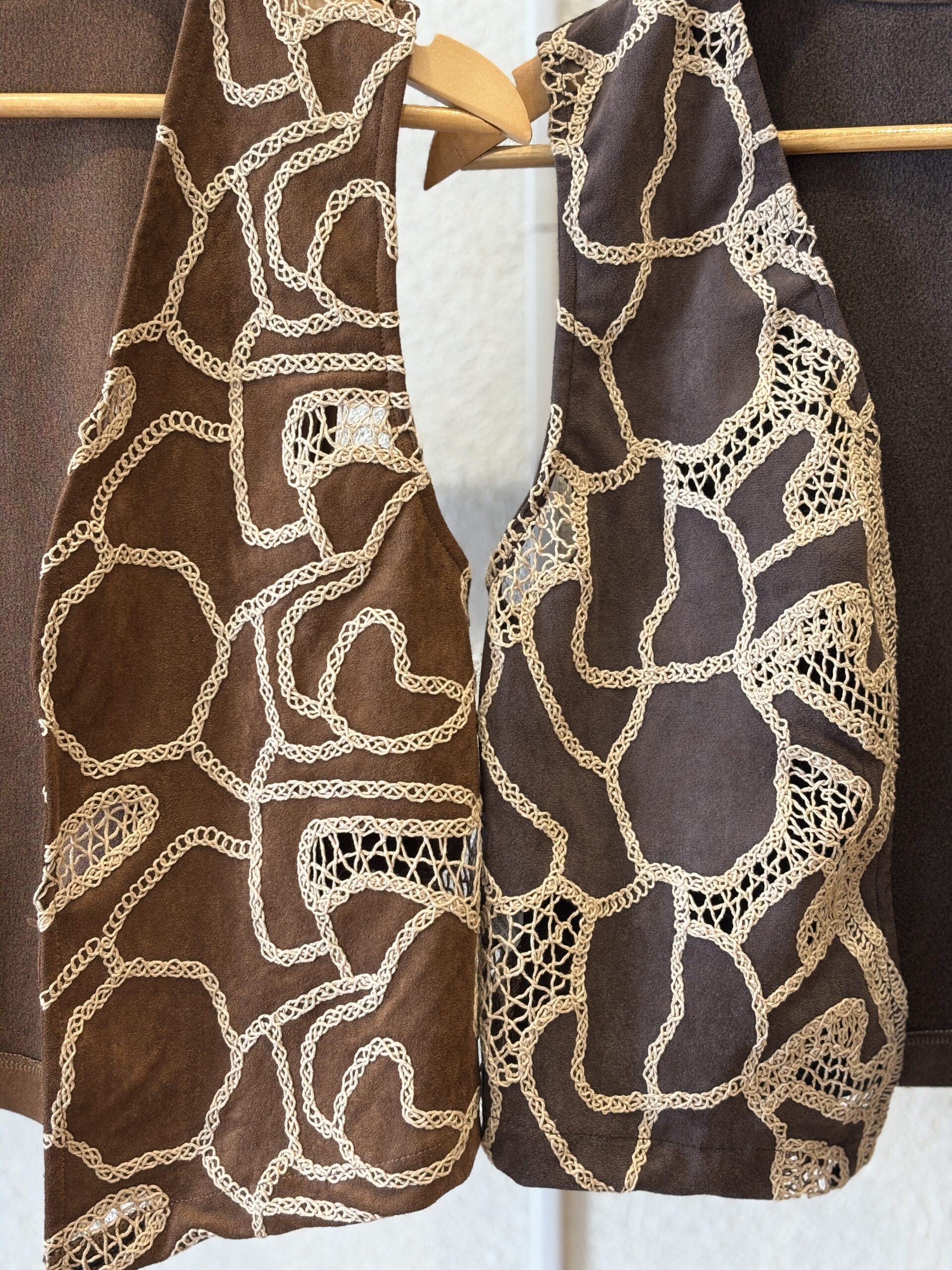 Chaleco confeccionado en gamuza con bordado. Talles S: Cont. de Busto 92 cm y Largo 50 cm M: Cont. de Busto 96 cm y Largo 51 cm L: Cont. de Busto 100 cm y Largo 52 cm