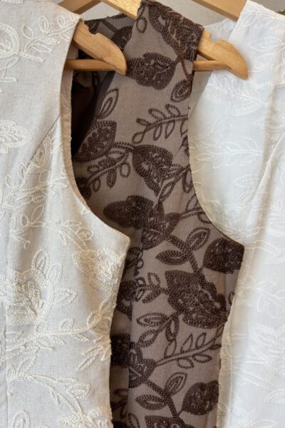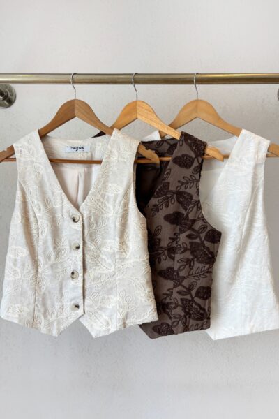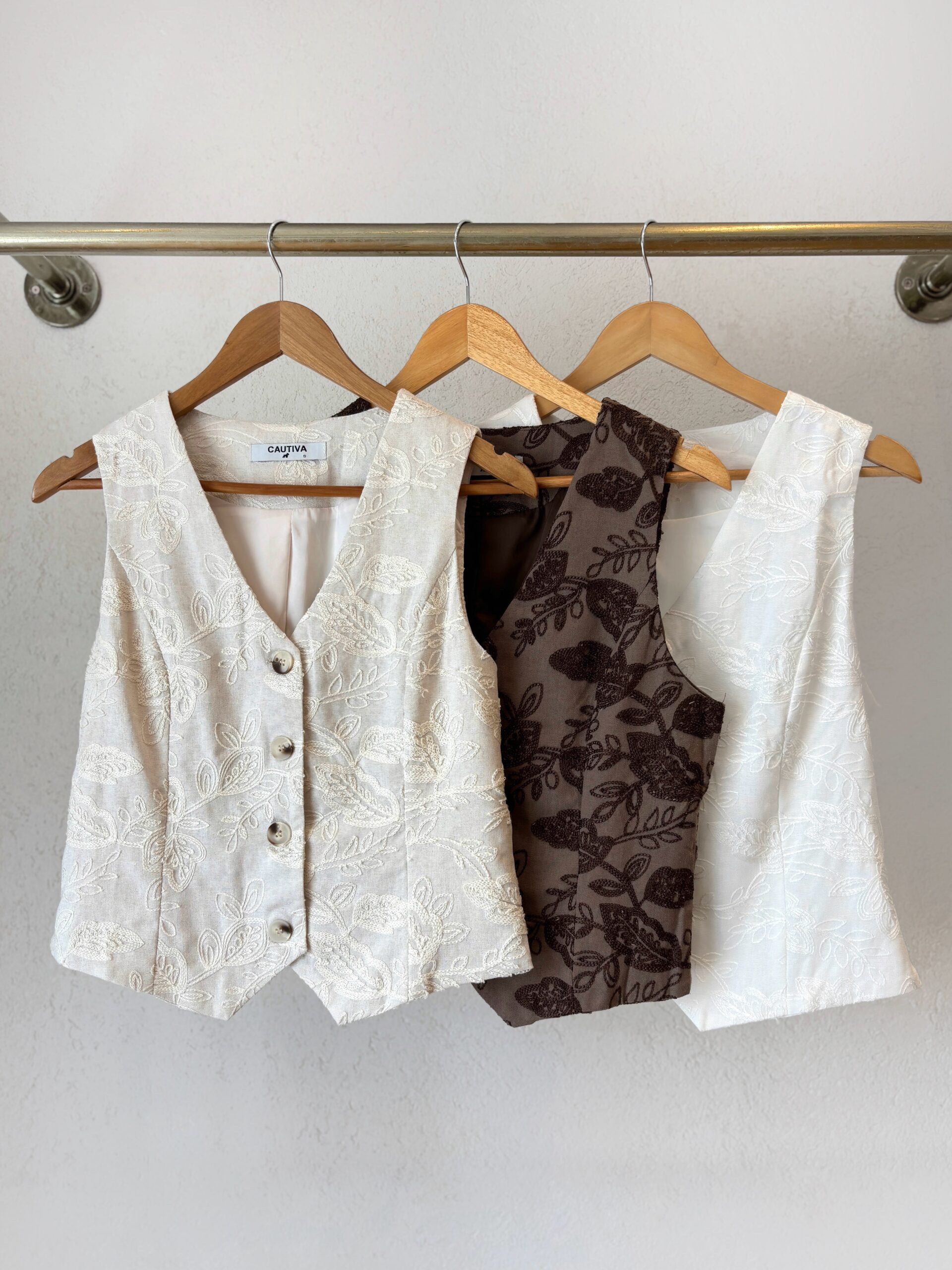 Chaleco confeccionado en lino con bordado y botones marmolados. Hace conjunto con el Short Palmas y Pantalón Palmas.