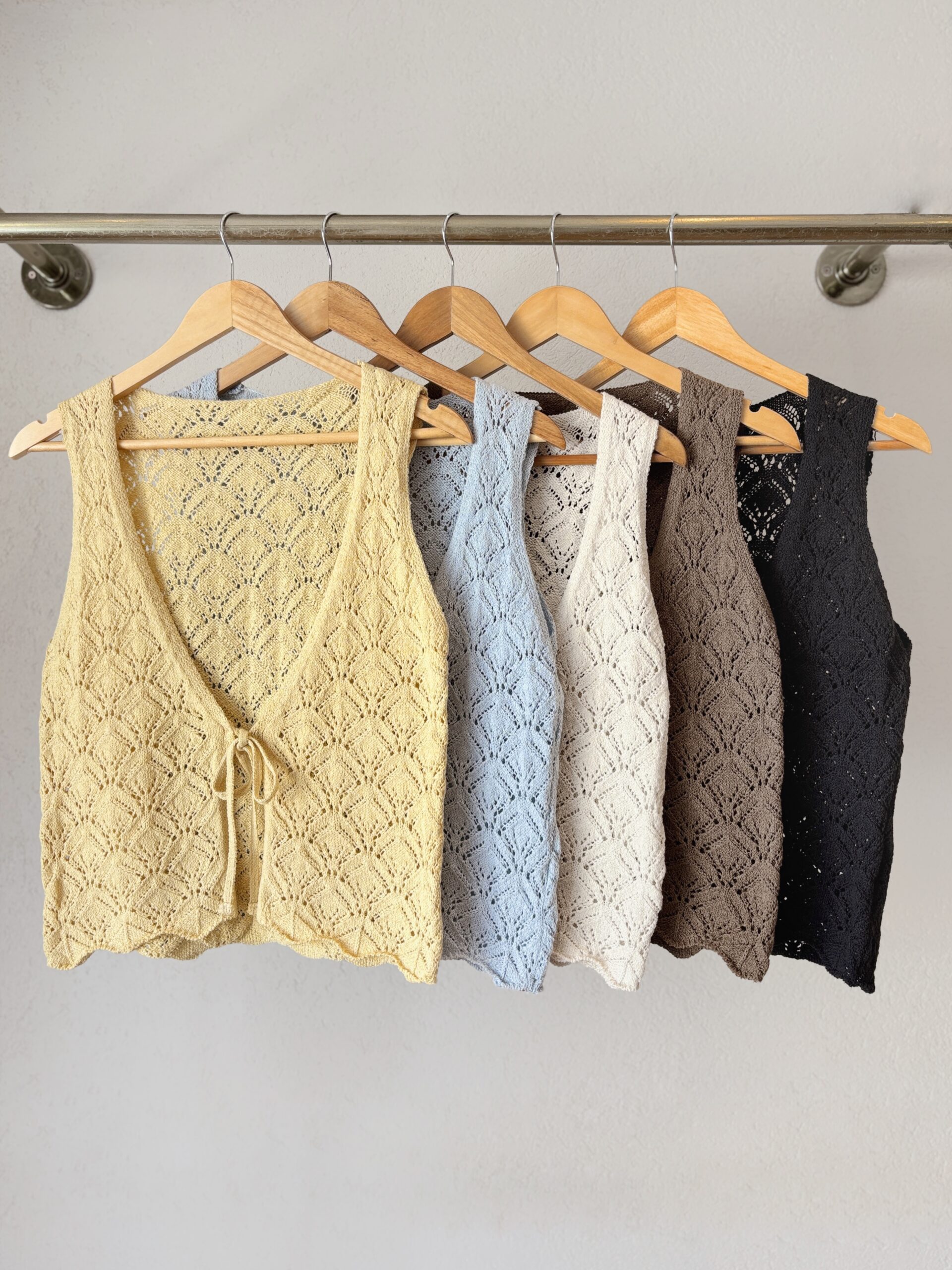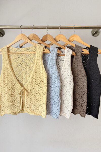 Chaleco tejido calado, con tiritas para el cierre.