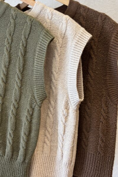 Chaleco confeccionado en tejido con trenza y hombro caido.