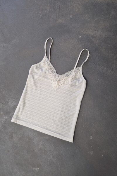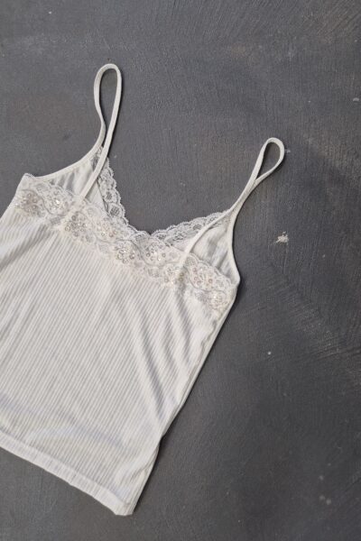Musculosa confeccionada en rib broderie de algodon con encaje y lentejuelas.