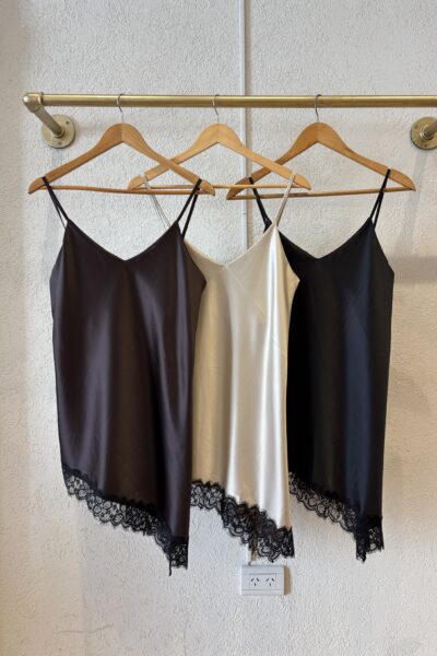 Musculosa confeccionado en seda lisa con puntilla en recorte asimetrico.