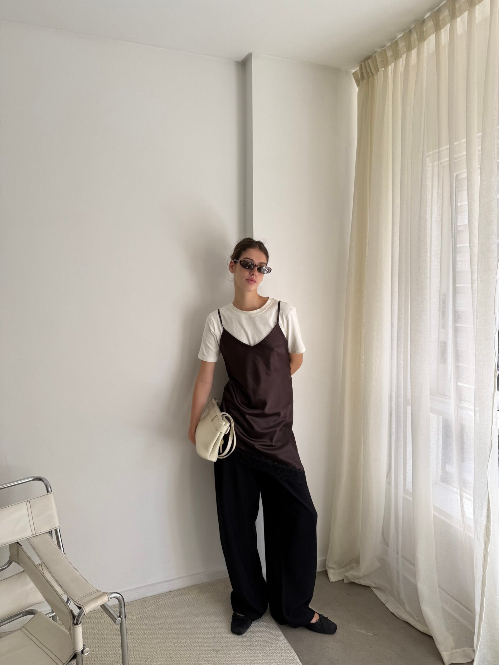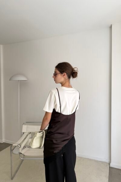 Musculosa confeccionado en seda lisa con puntilla en recorte asimetrico.