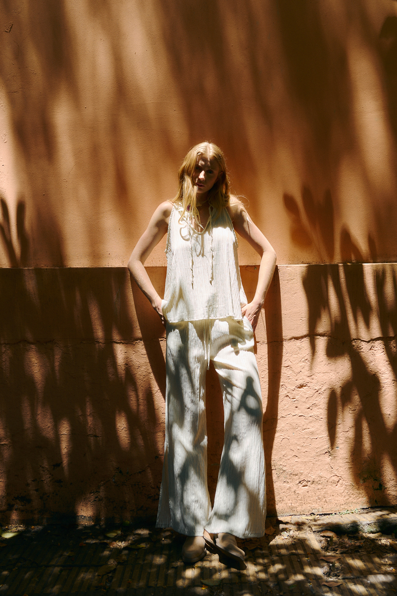 Musculosa confeccionado en coperni con cuello y tiras para ajustar a medida. Hace conjunto con el pantalon Isadora.