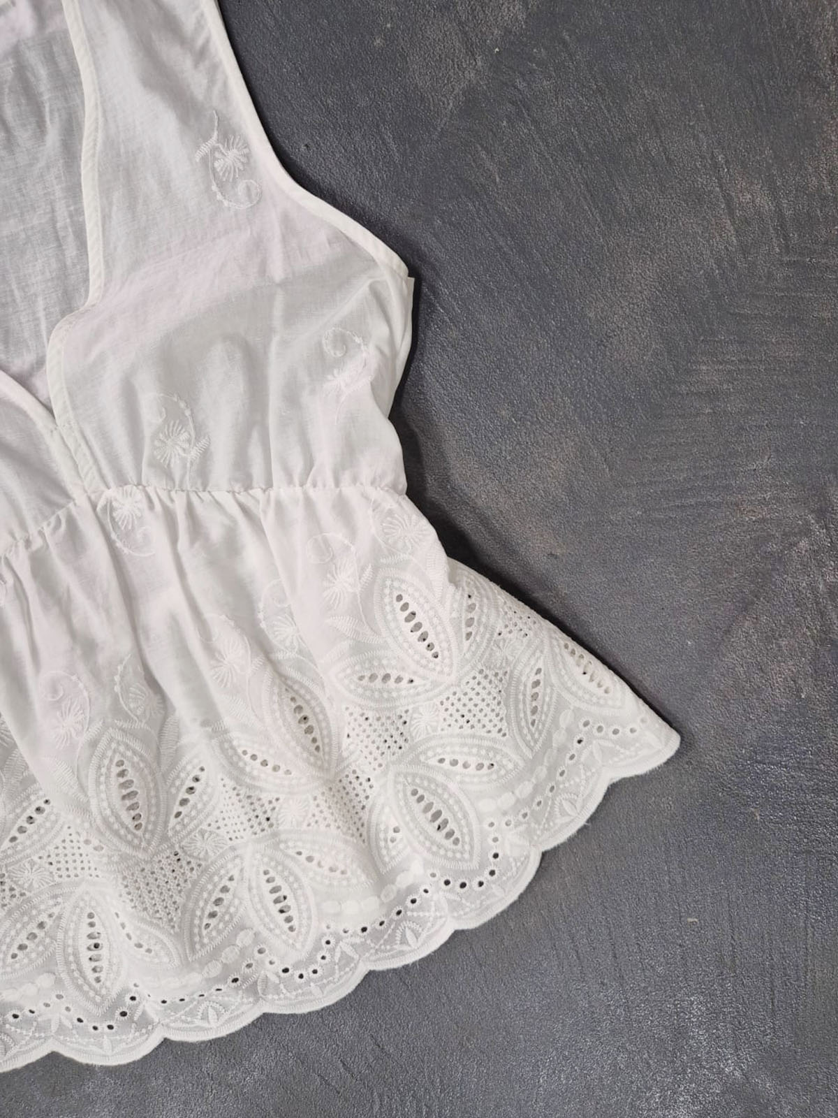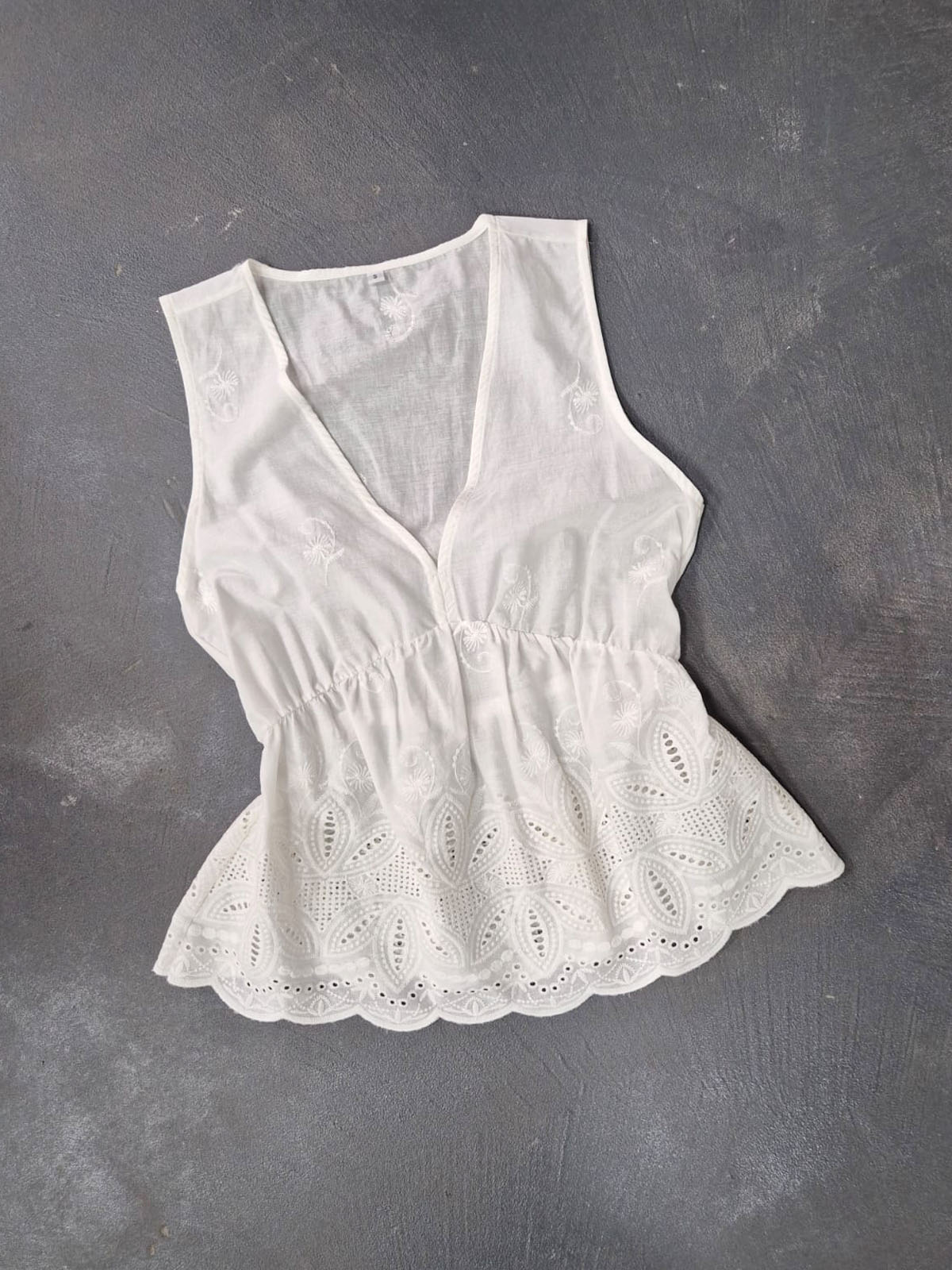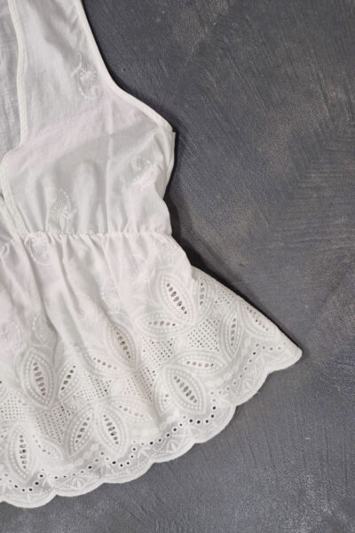 Musculosa confeccionada en broderie guipur, con escote en “V” y en color off white.