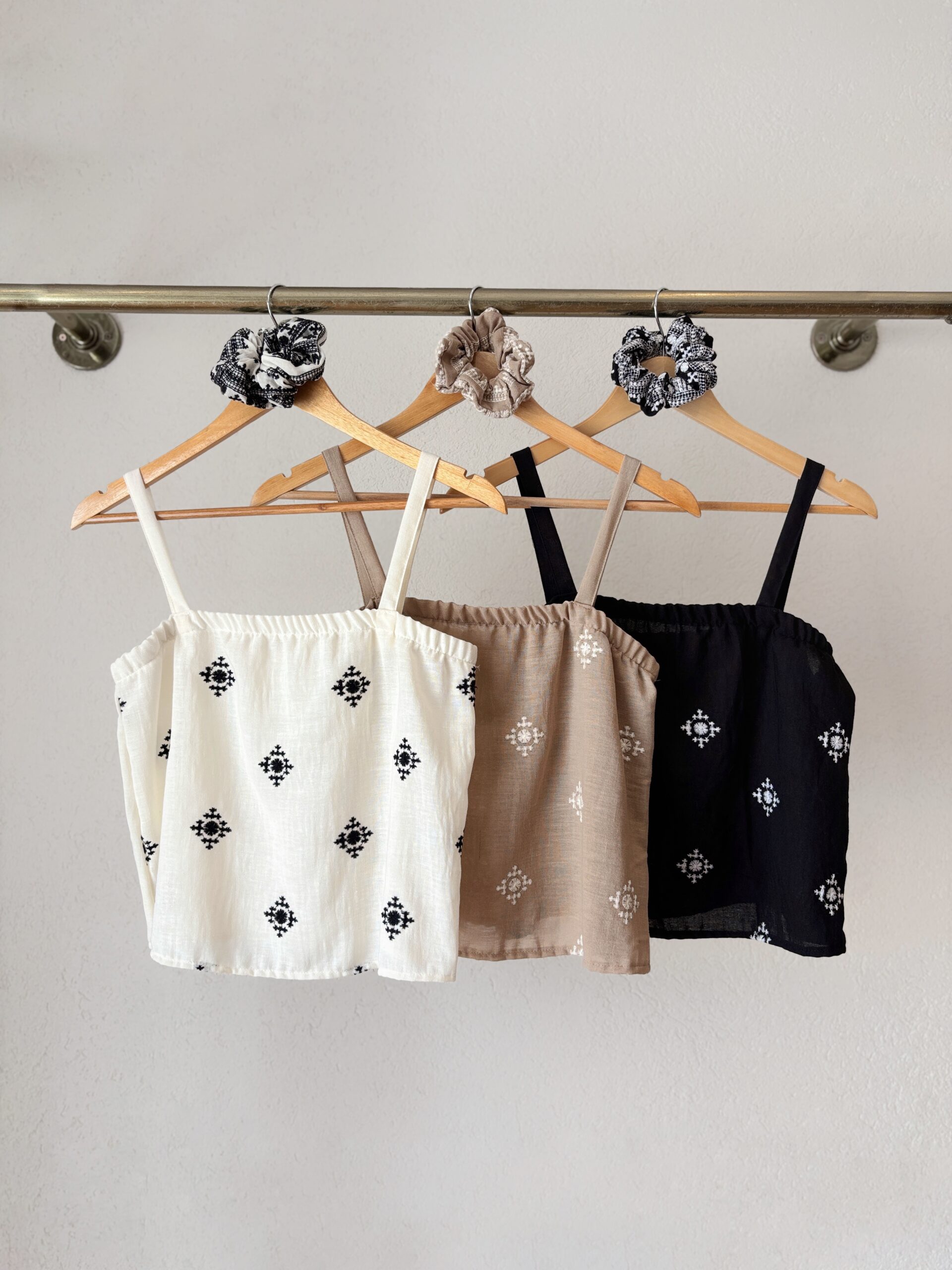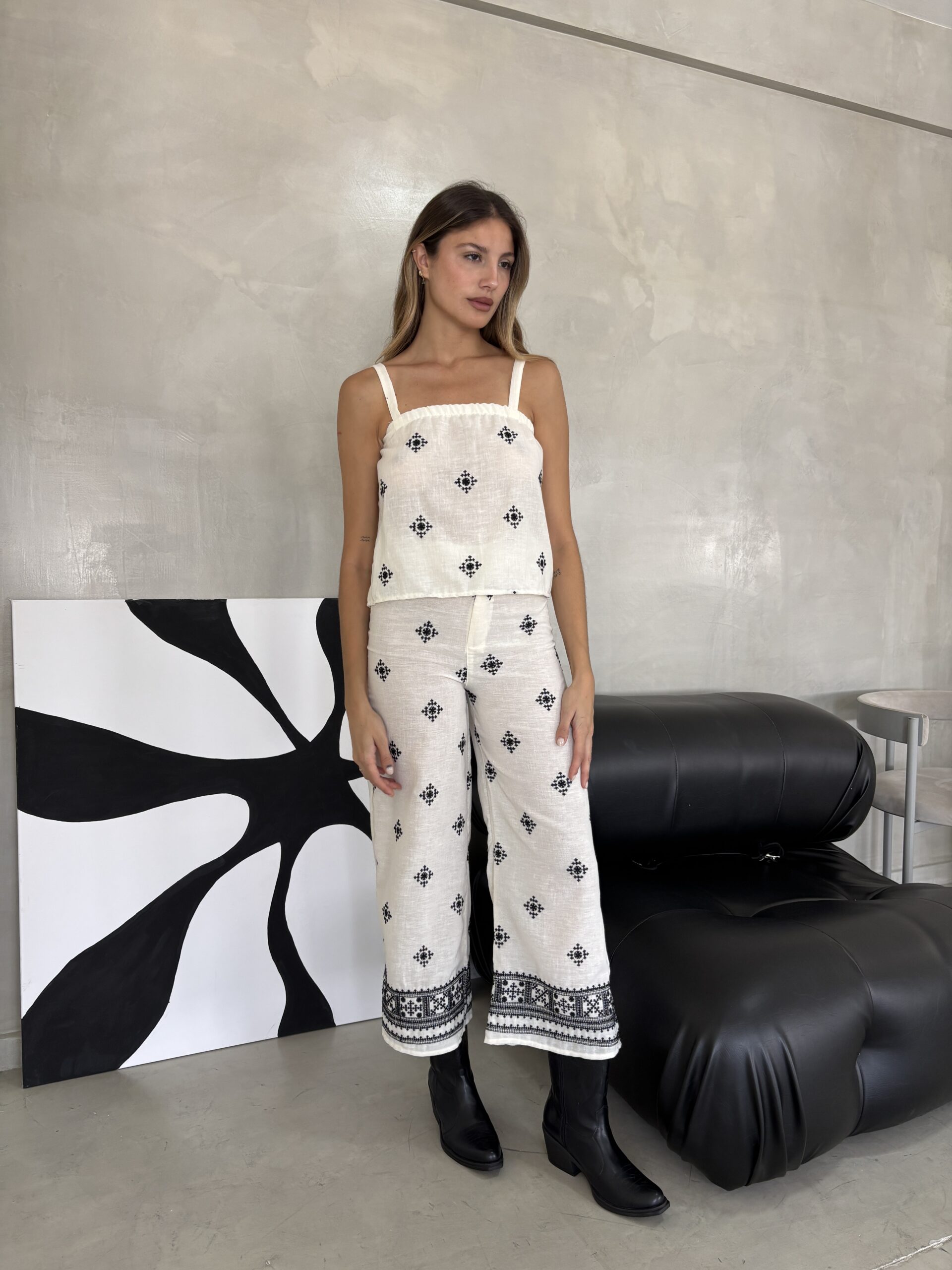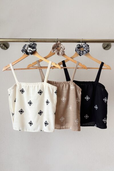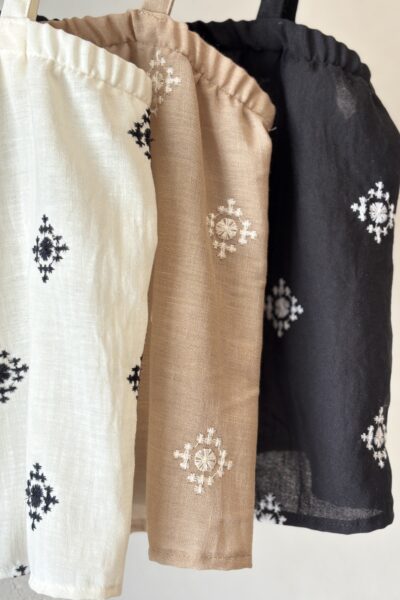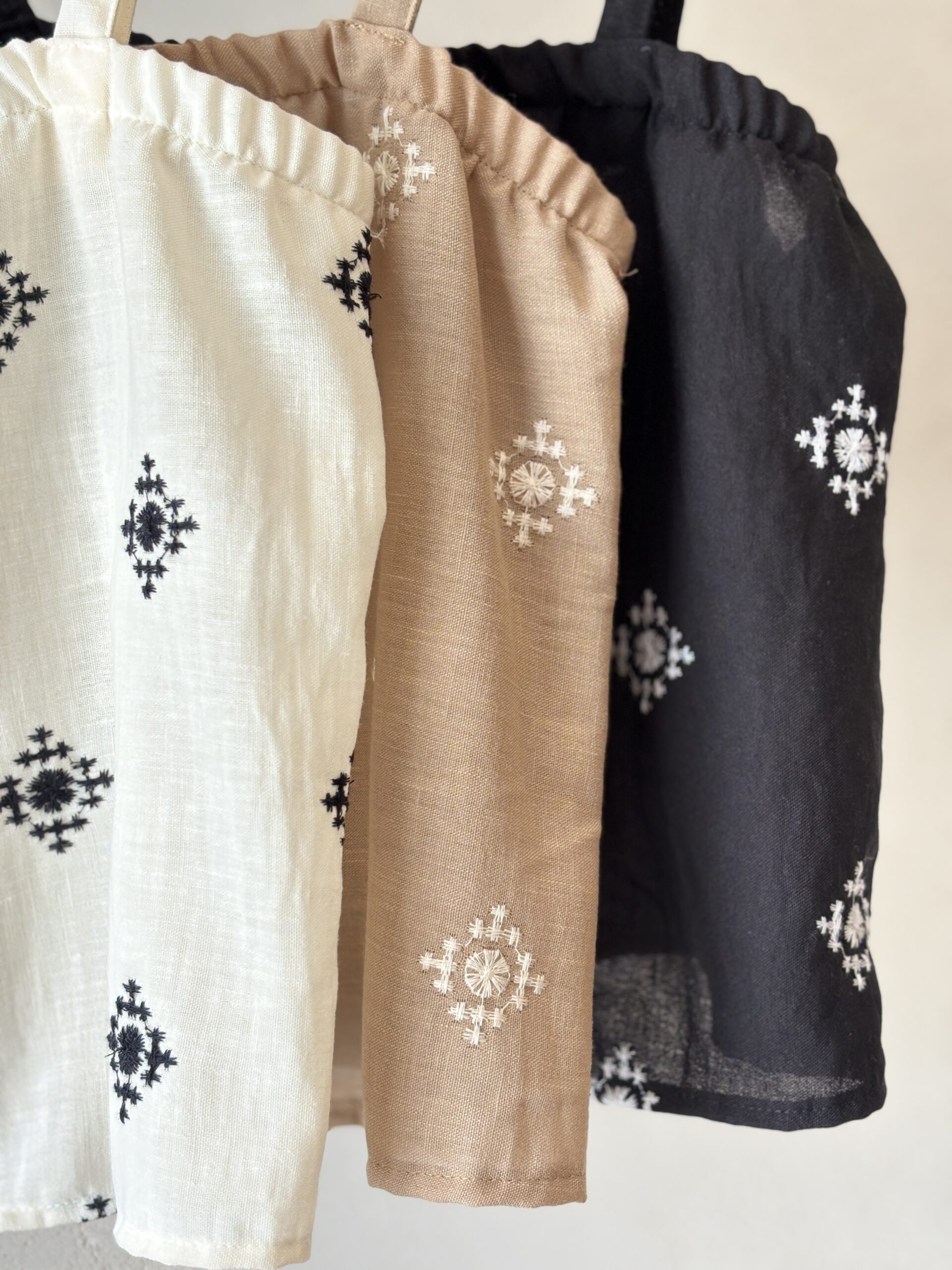 Musculosa confeccionado en lino con bordado y frunce en la parte del pecho. Cada prenda viene con una colita de pelo del mismo color de la prenda.