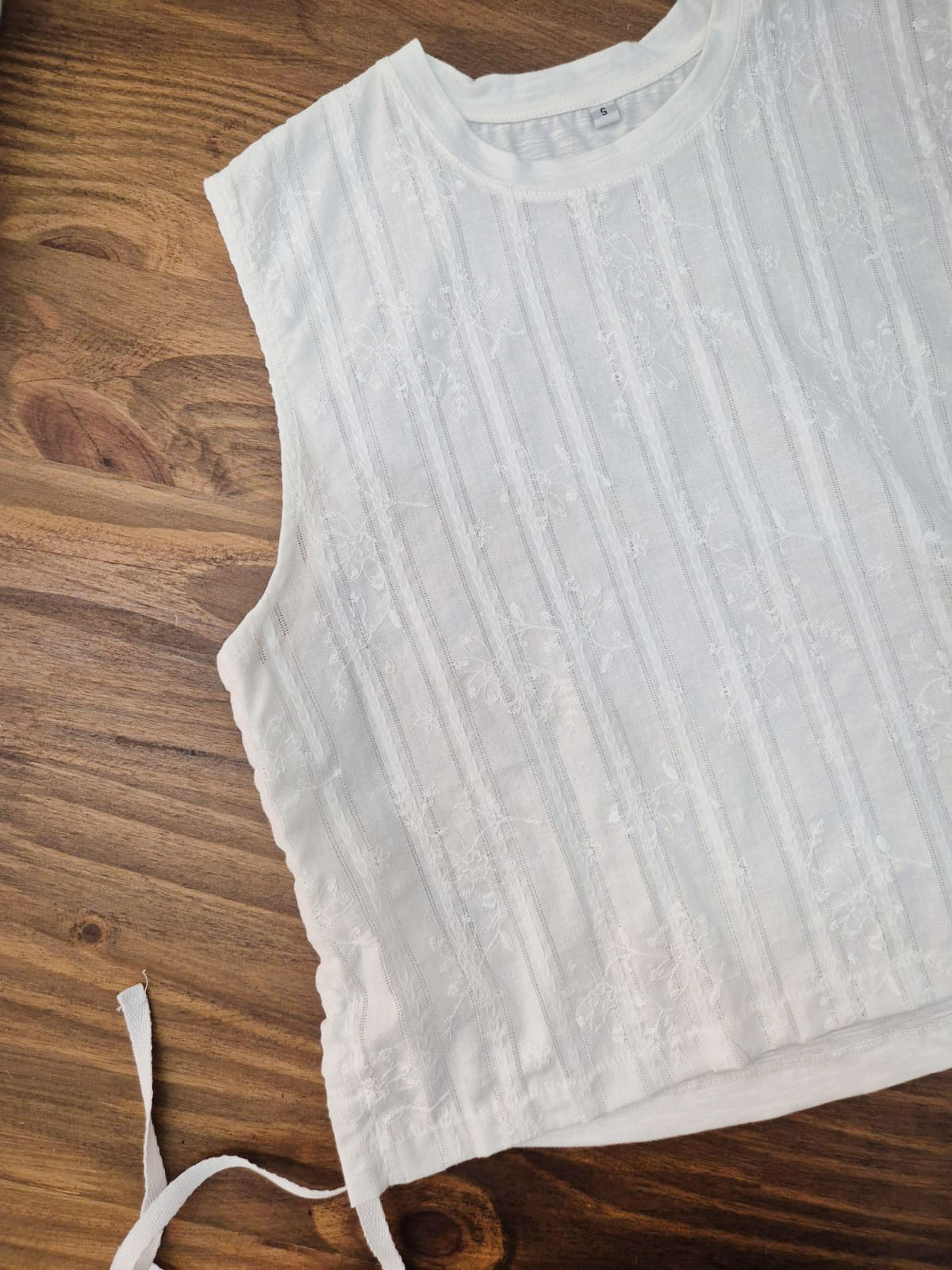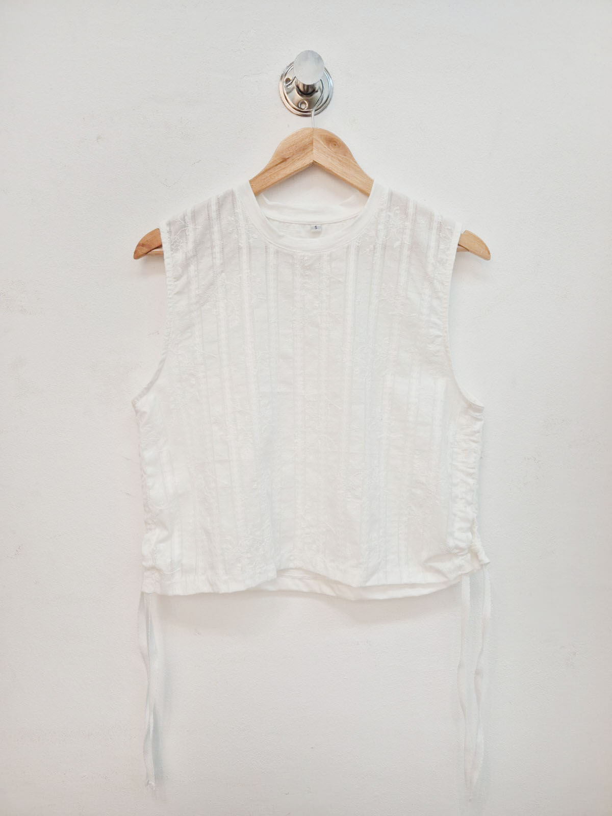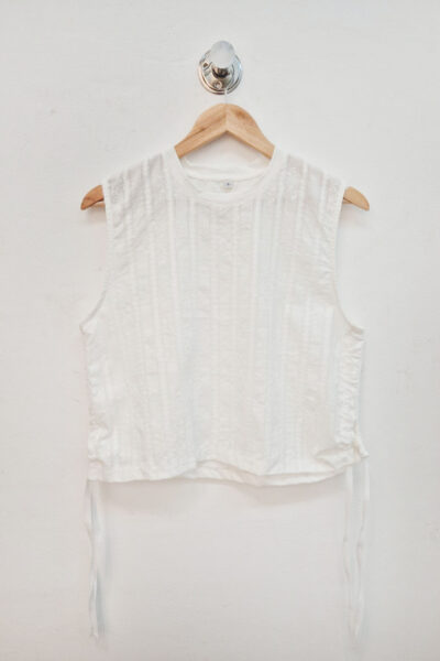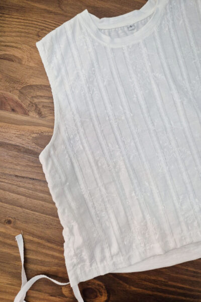Musculosa confeccionada en ratier bordado combinado con flamé de algodón, con cinta en los laterales.