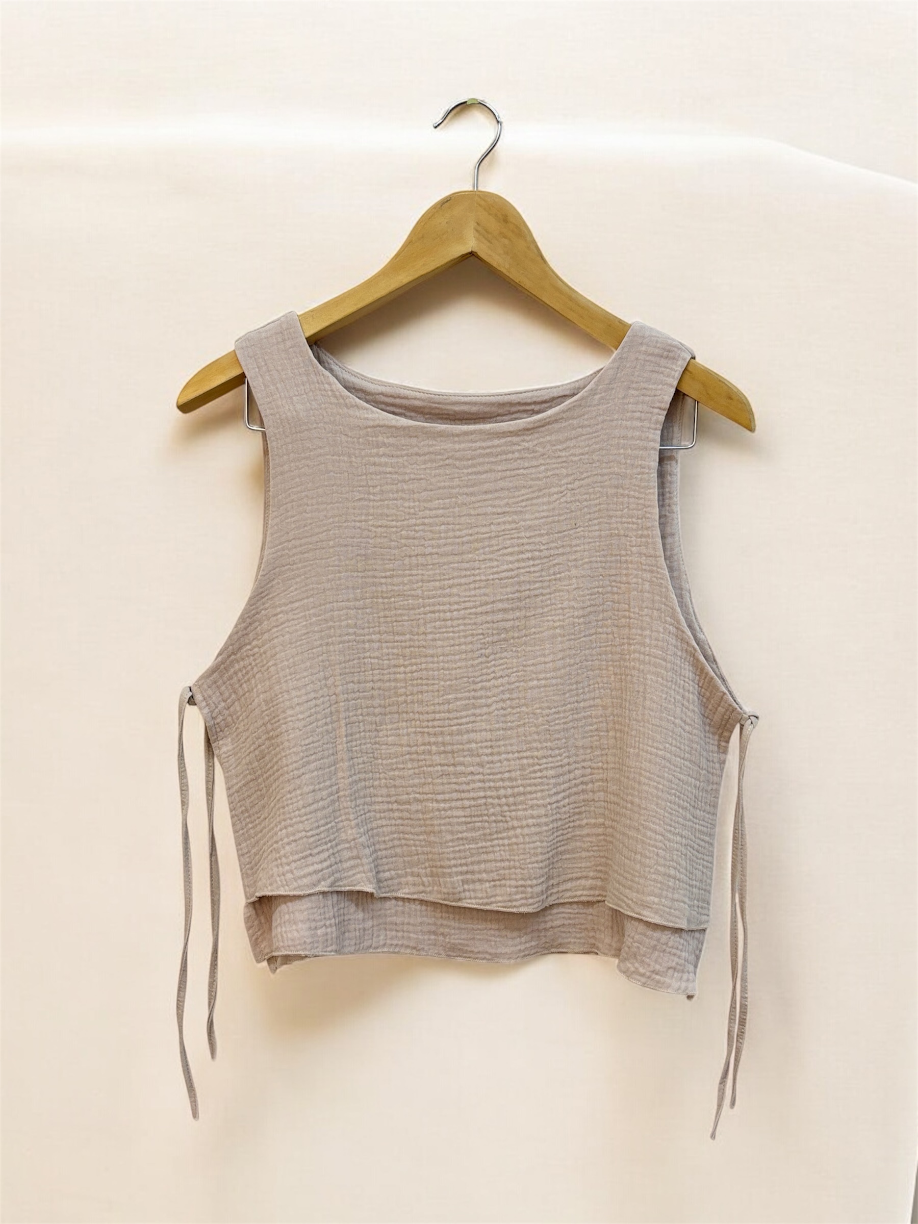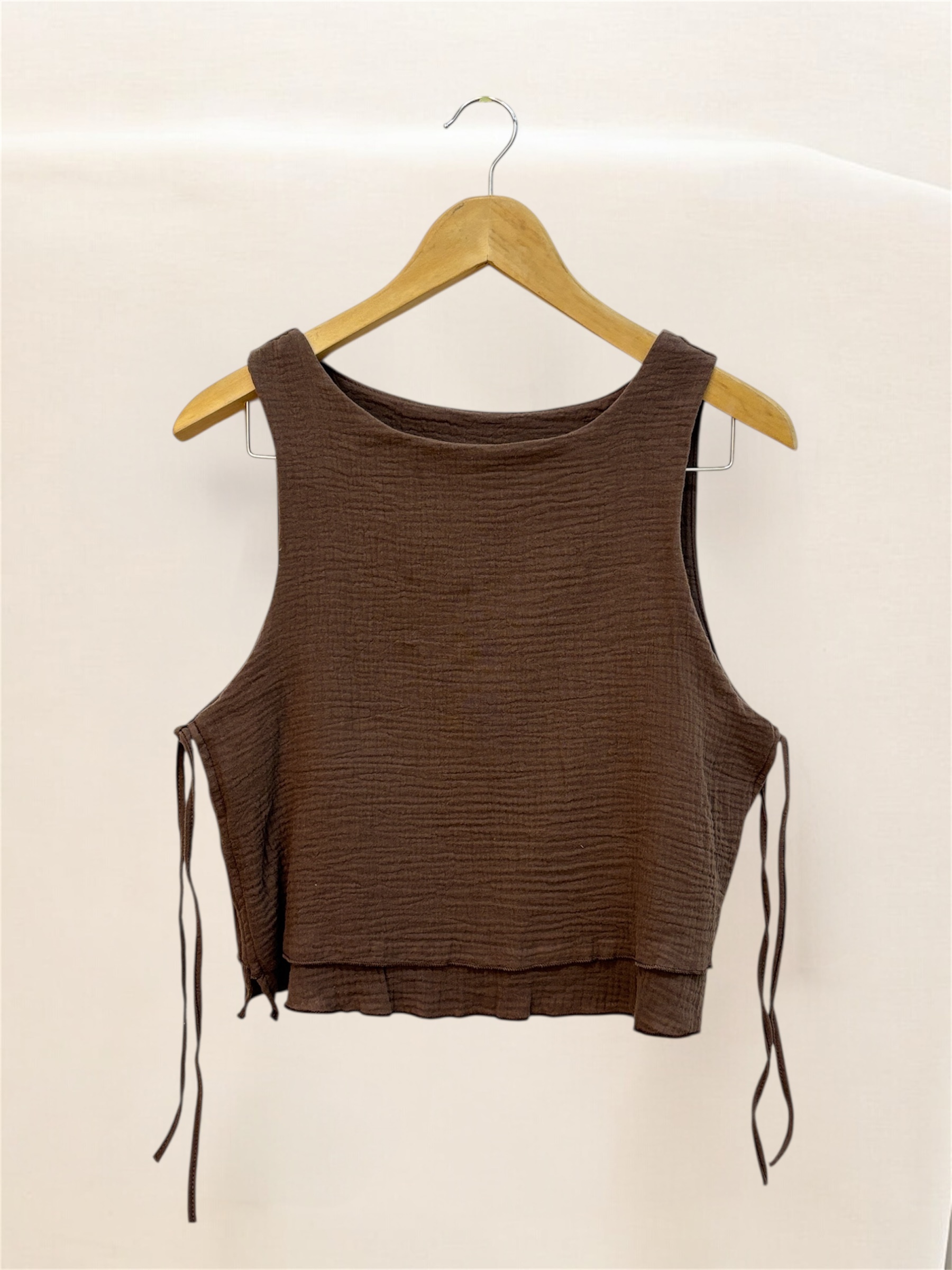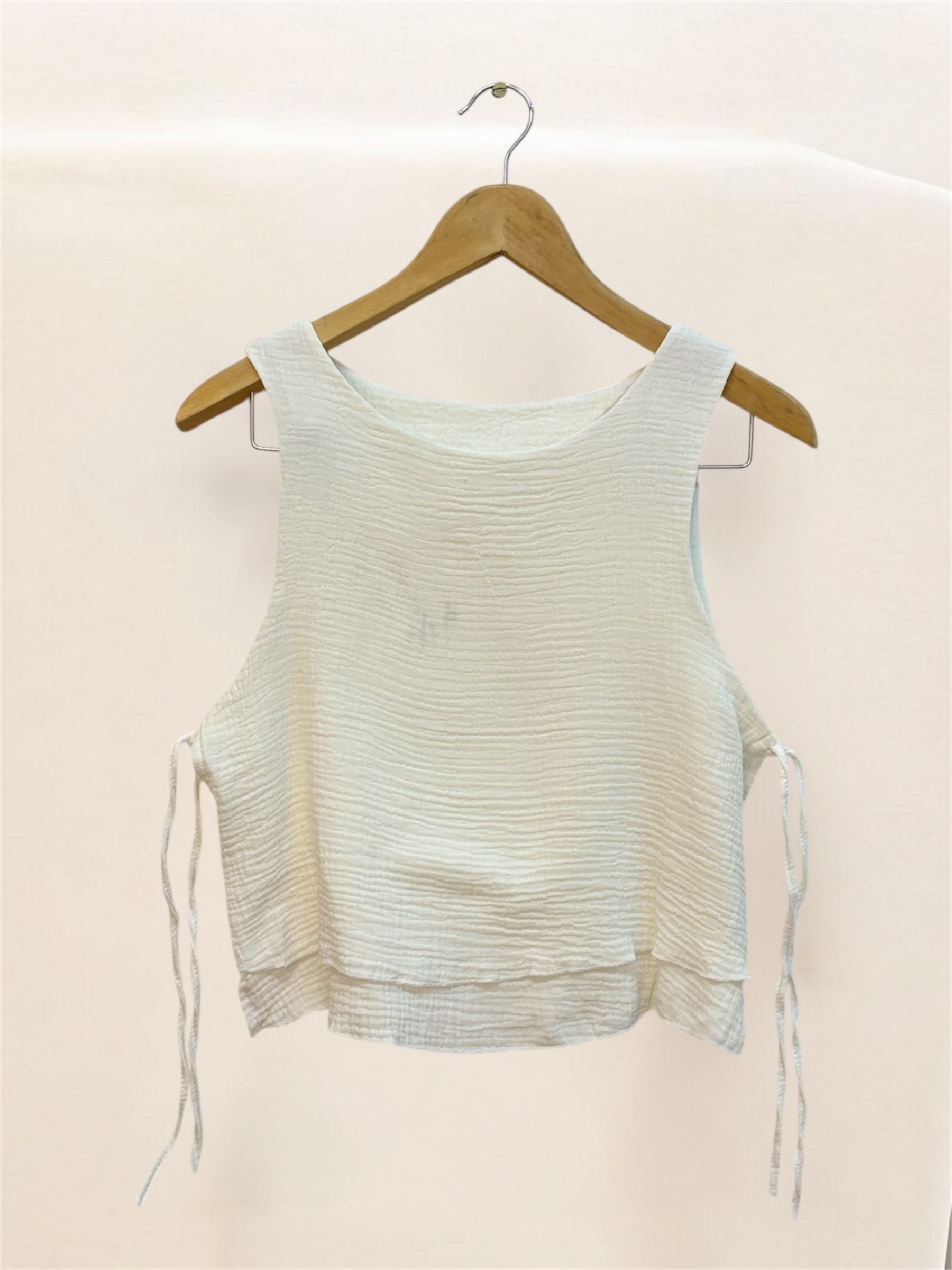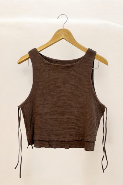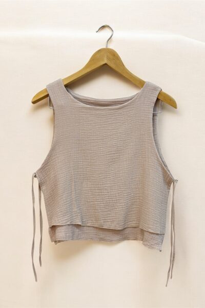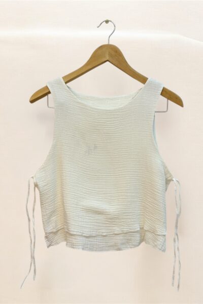 Blusa confeccionada en baby cotton, con doble encaje y lazos laterales para ajustar.