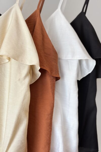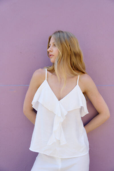 Musculosa confeccionado en twill viscosa en escote V con volado frontal.