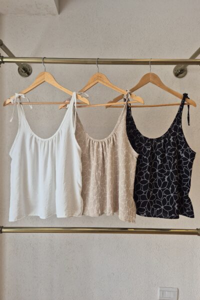 Musculosa confeccionado en cey lino con bordado y lazos en el hombro para ajustar a medida.