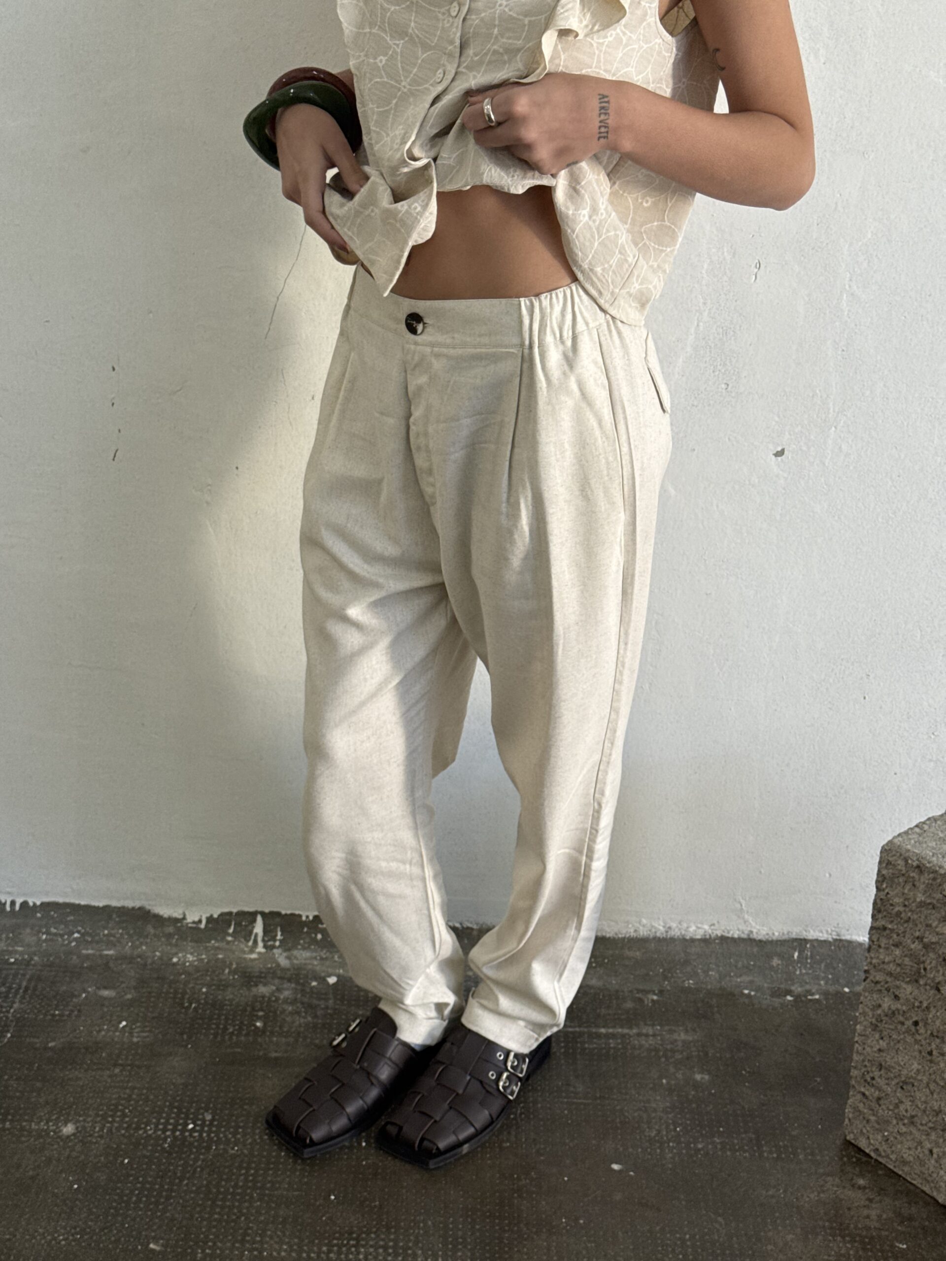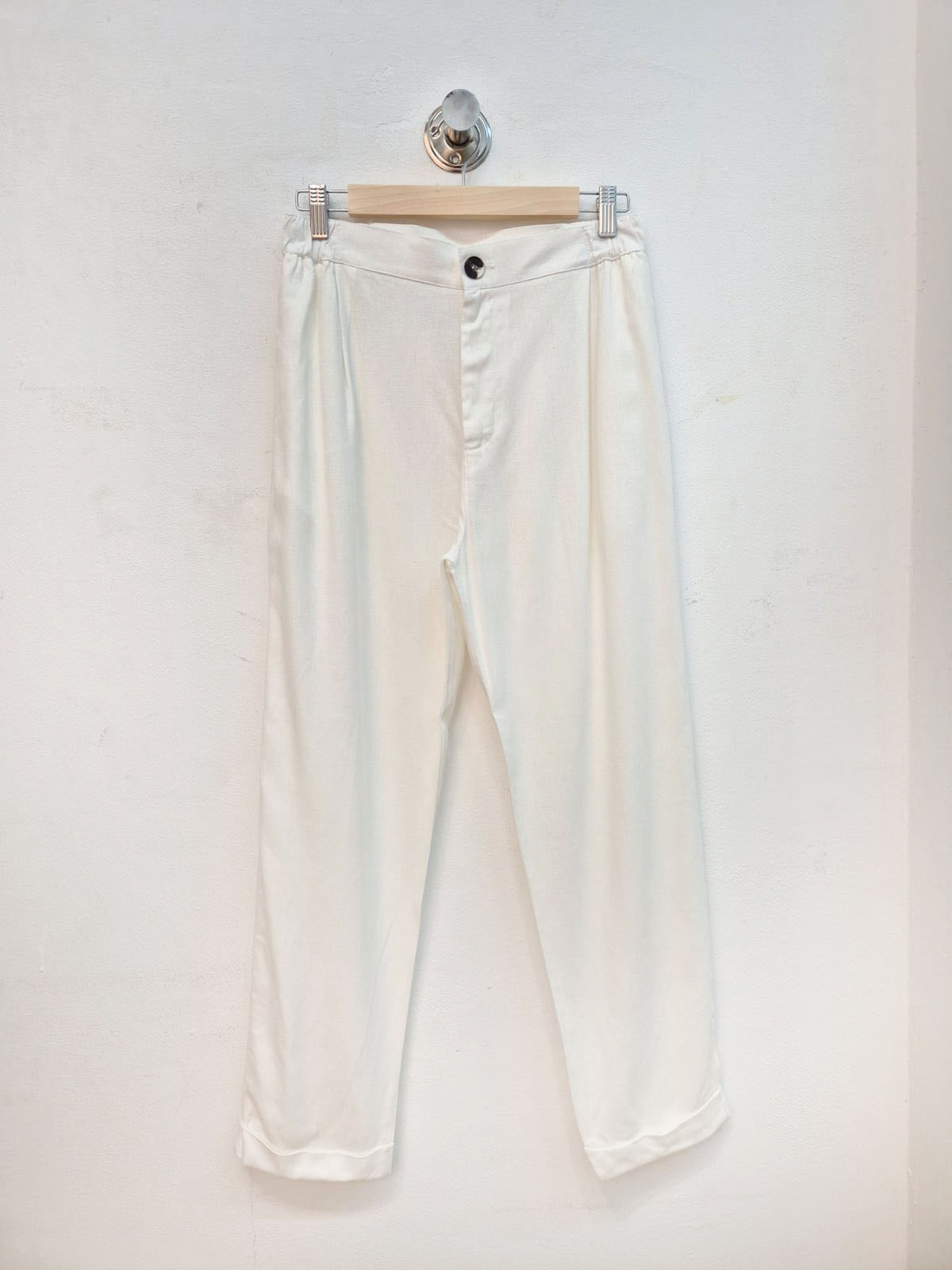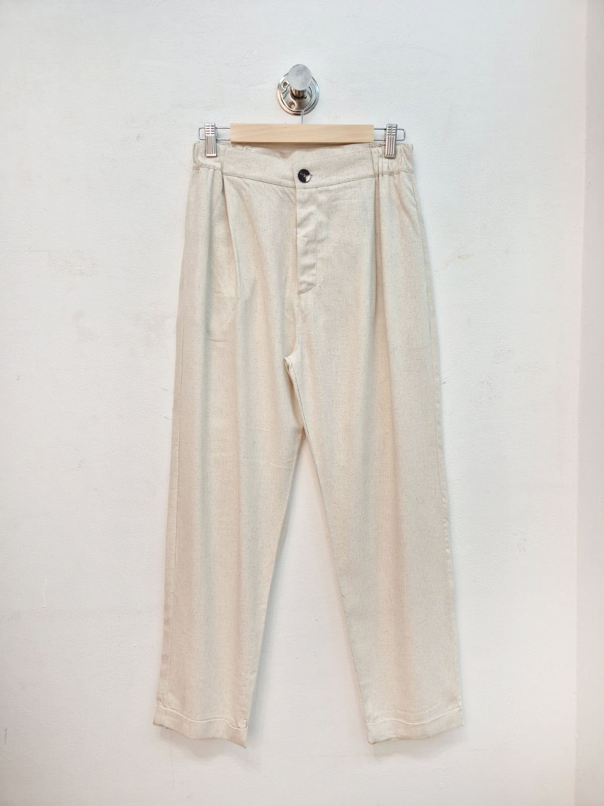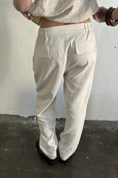 Pantalón confeccionado en lino sastrero, de corte recto, con botamanga y cintura con elástico en los laterales.