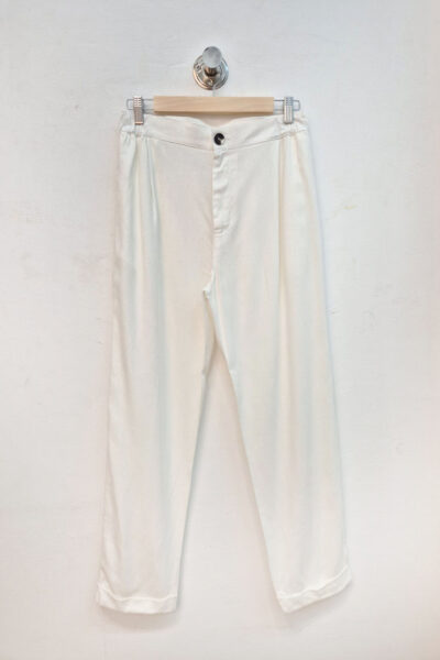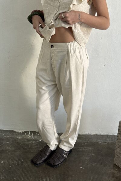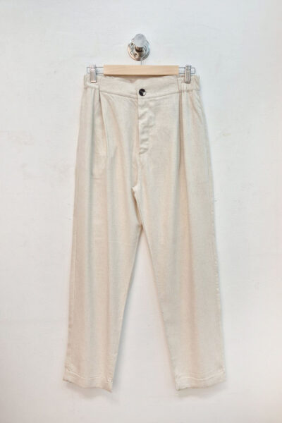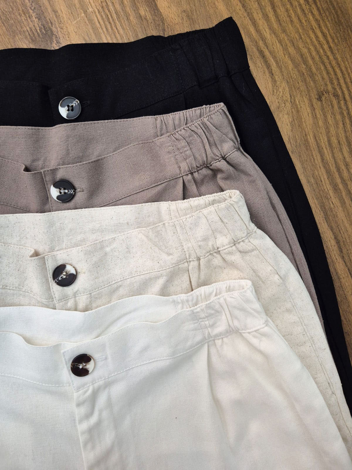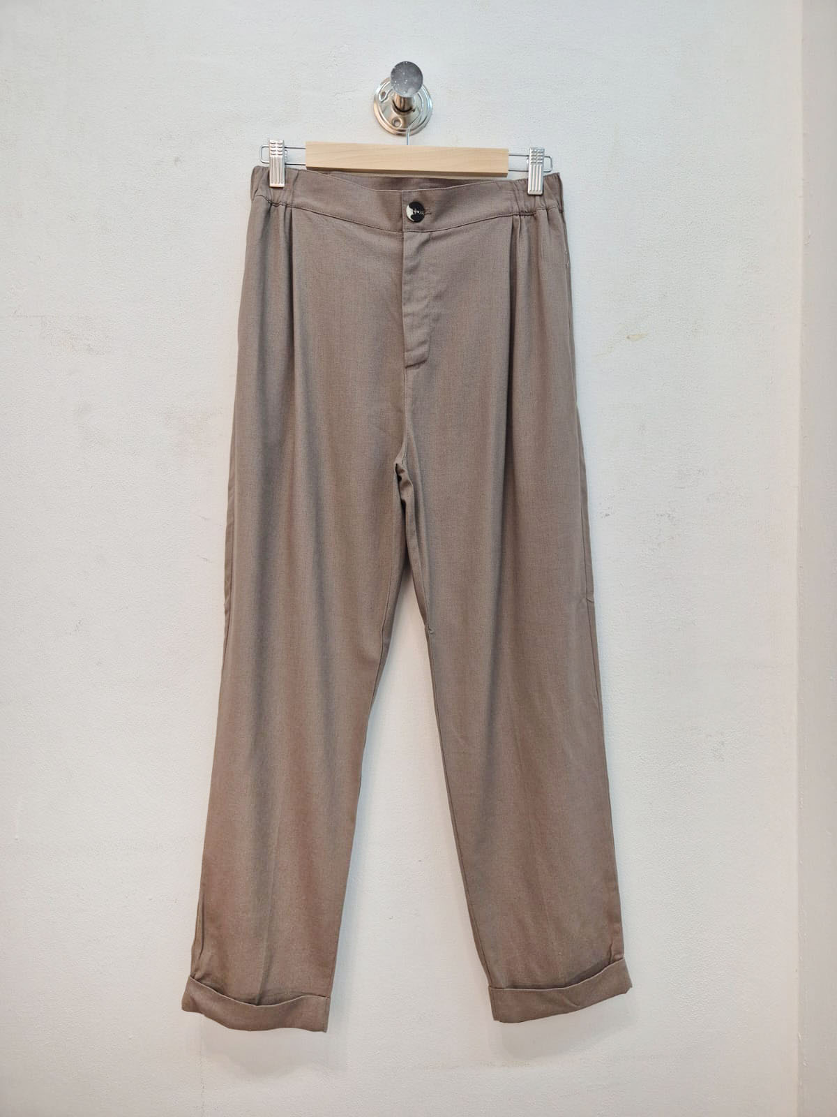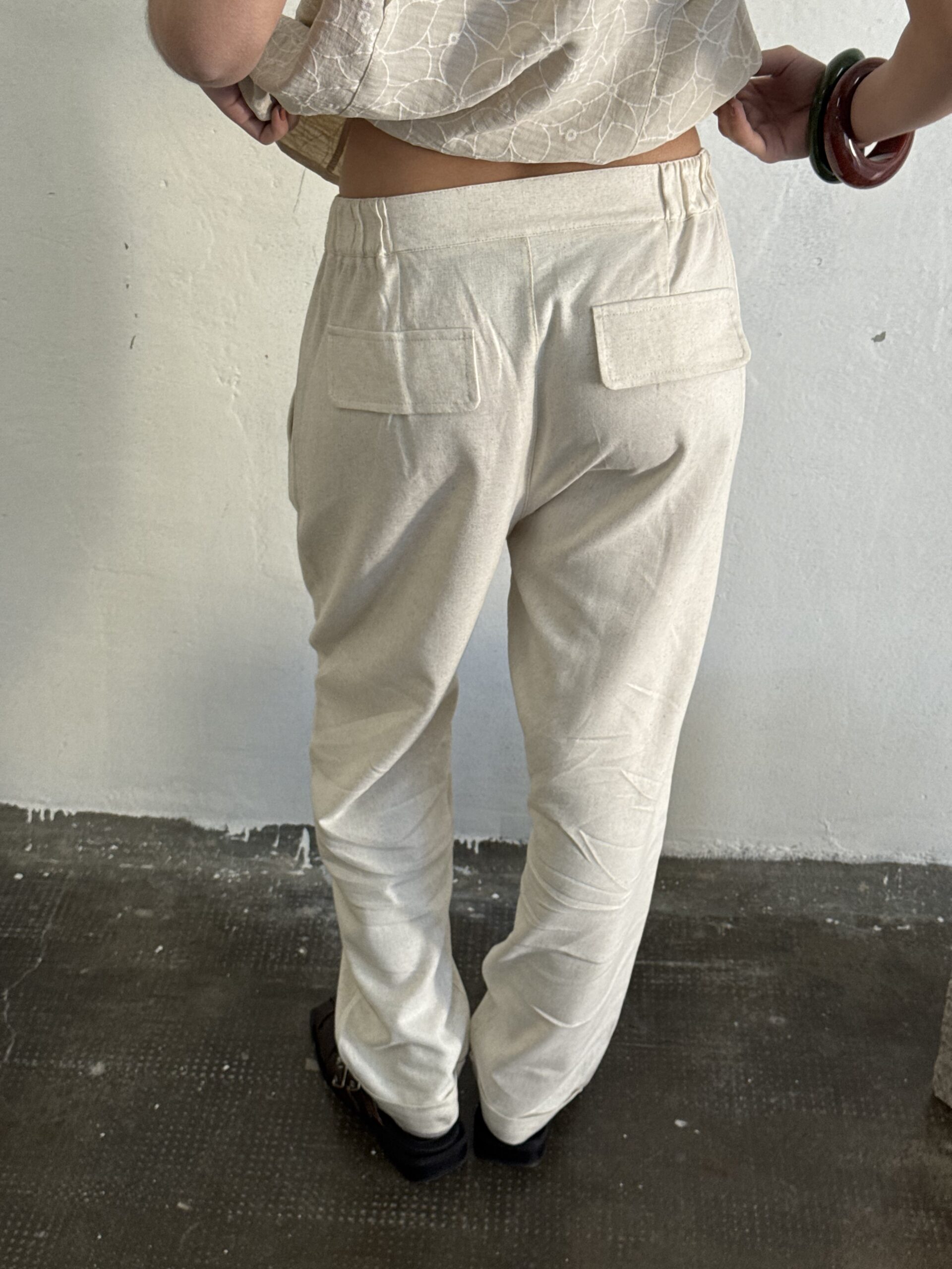 Pantalón confeccionado en lino sastrero, de corte recto, con botamanga y cintura con elástico en los laterales.