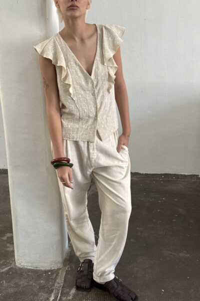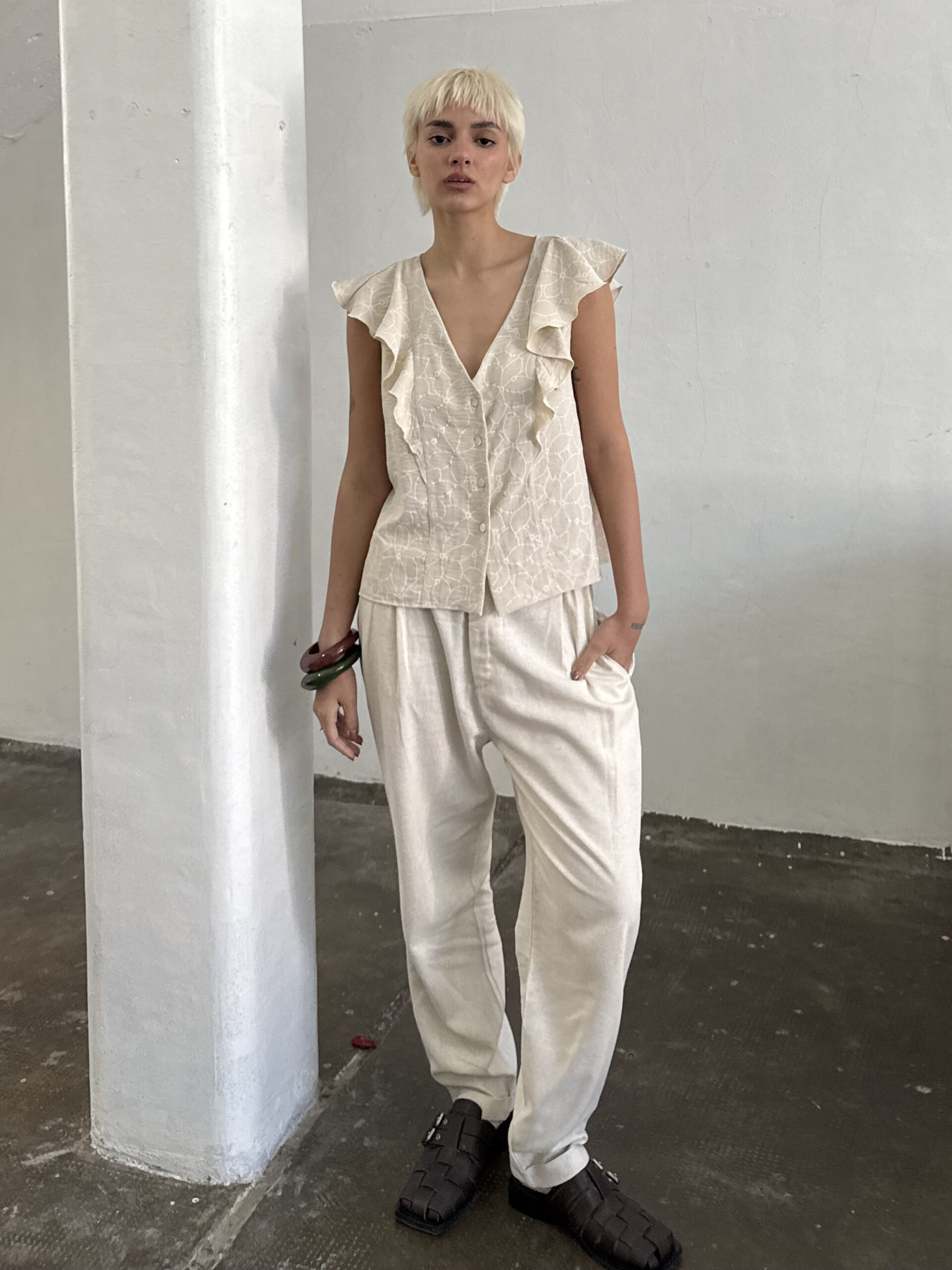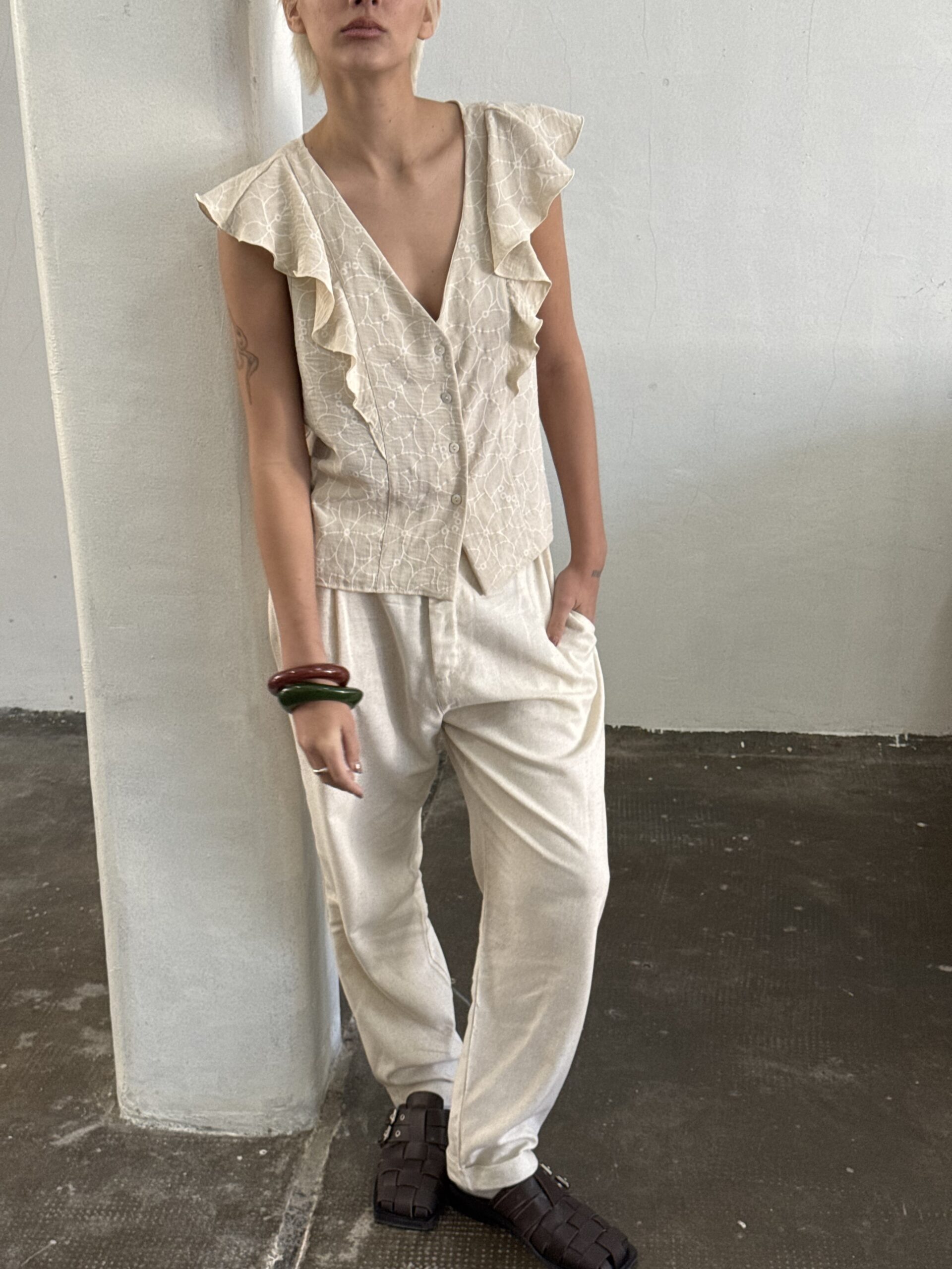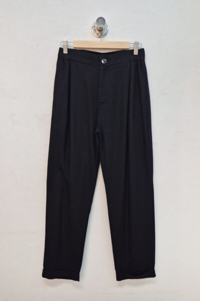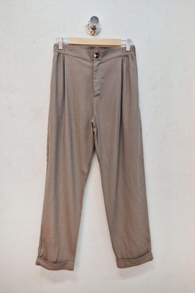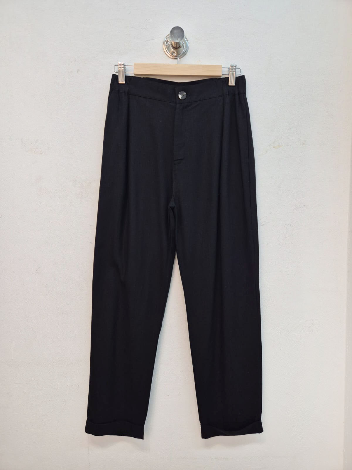 Pantalón confeccionado en lino sastrero, de corte recto, con botamanga y cintura con elástico en los laterales.