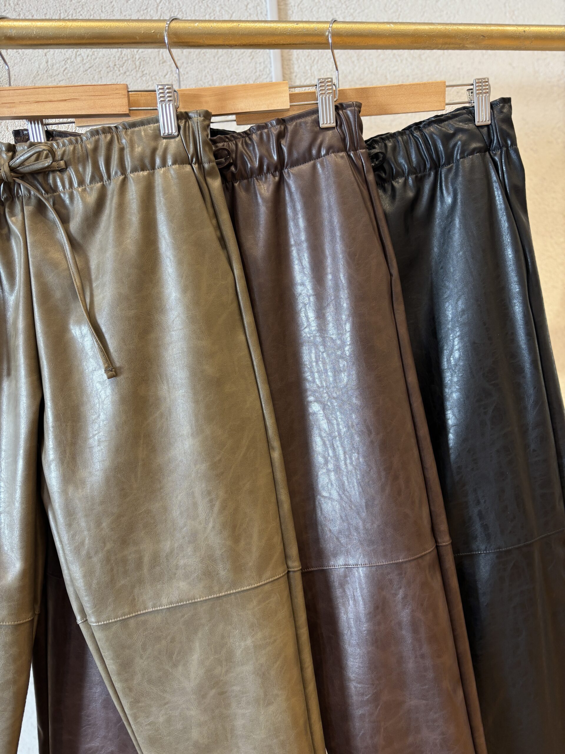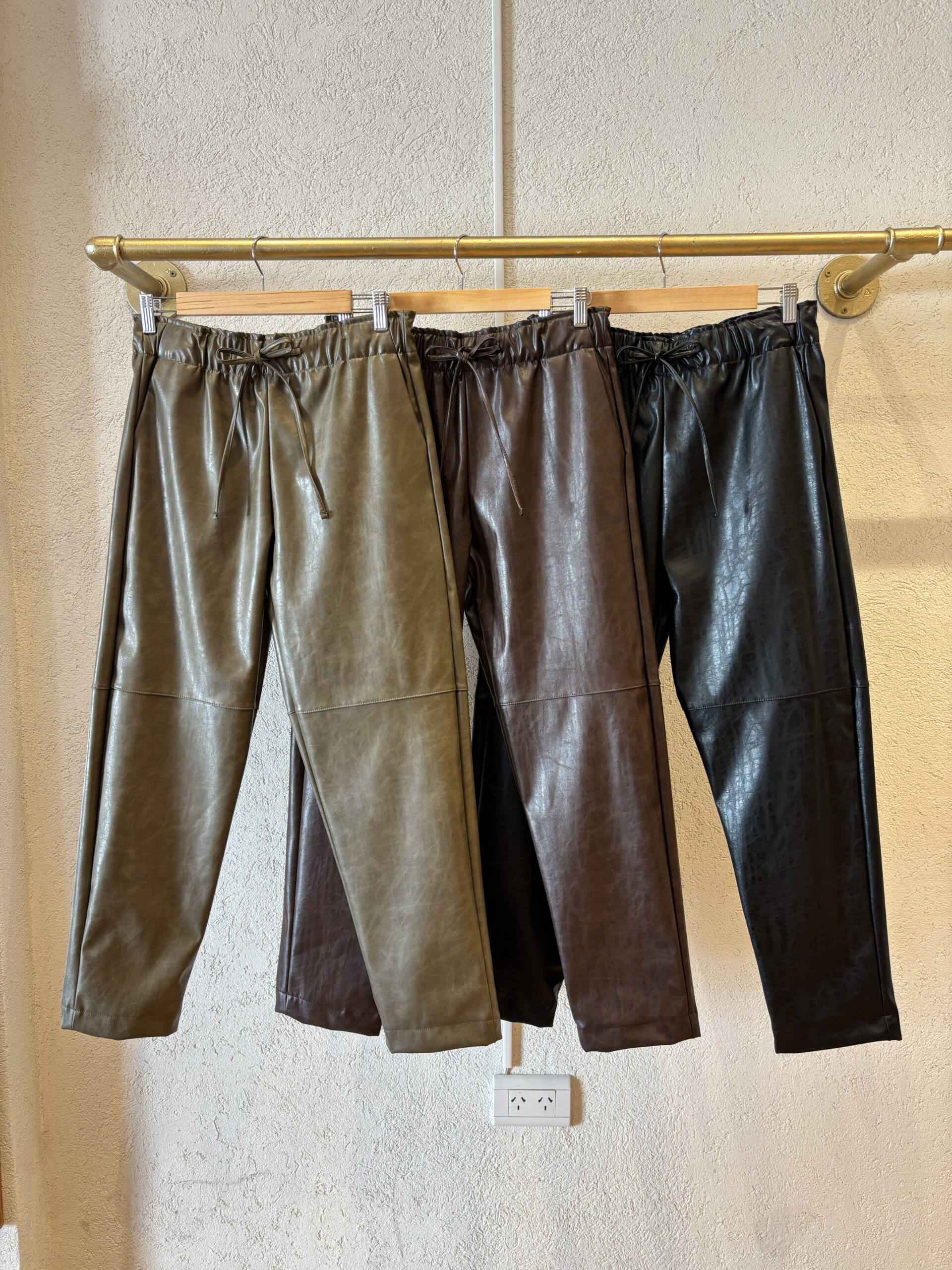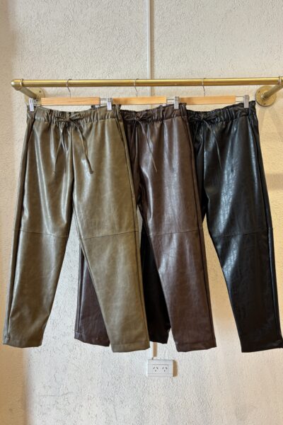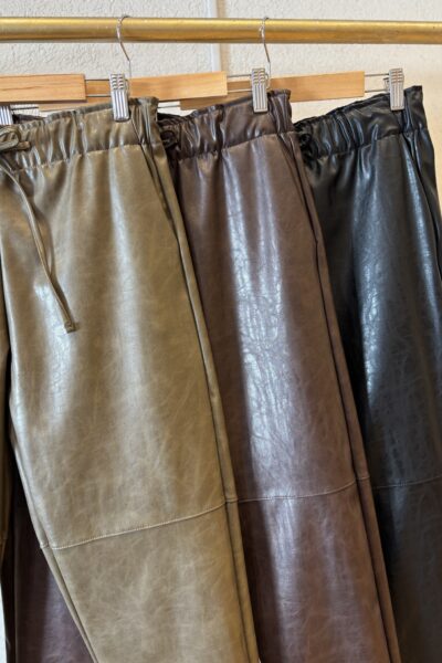 Pantalón tiro medio confeccionado en cuerina con elastico en la cintura. La pierna es holgada estrechandose hacia el tobillo.