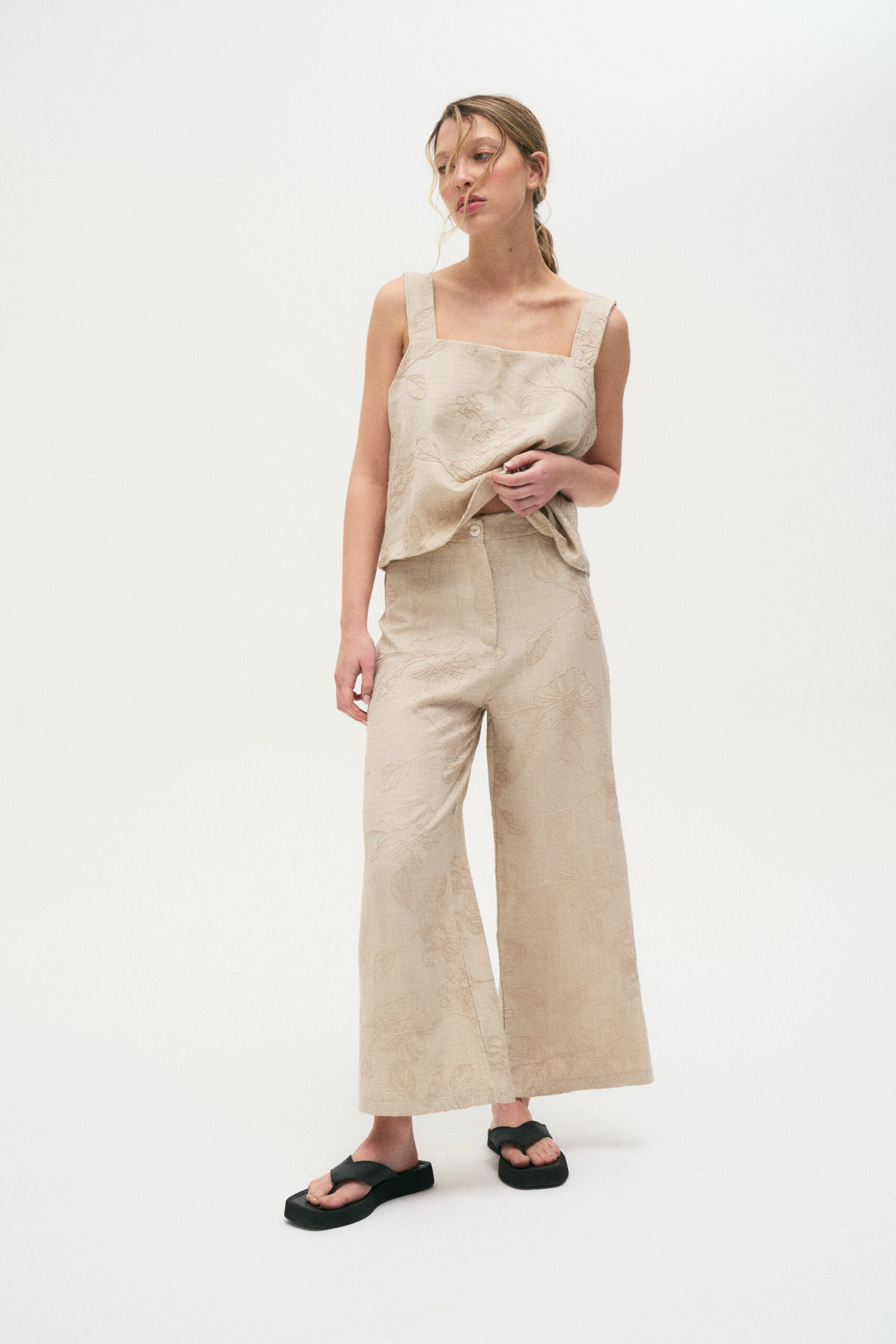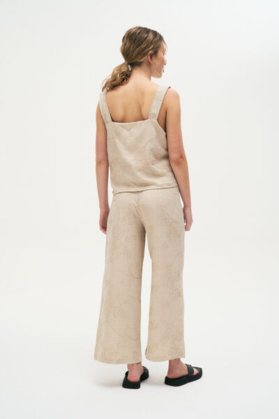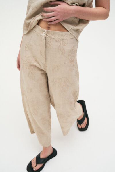 Pantalón confeccionado en twill bordado, de corte ancho y tiro alto.