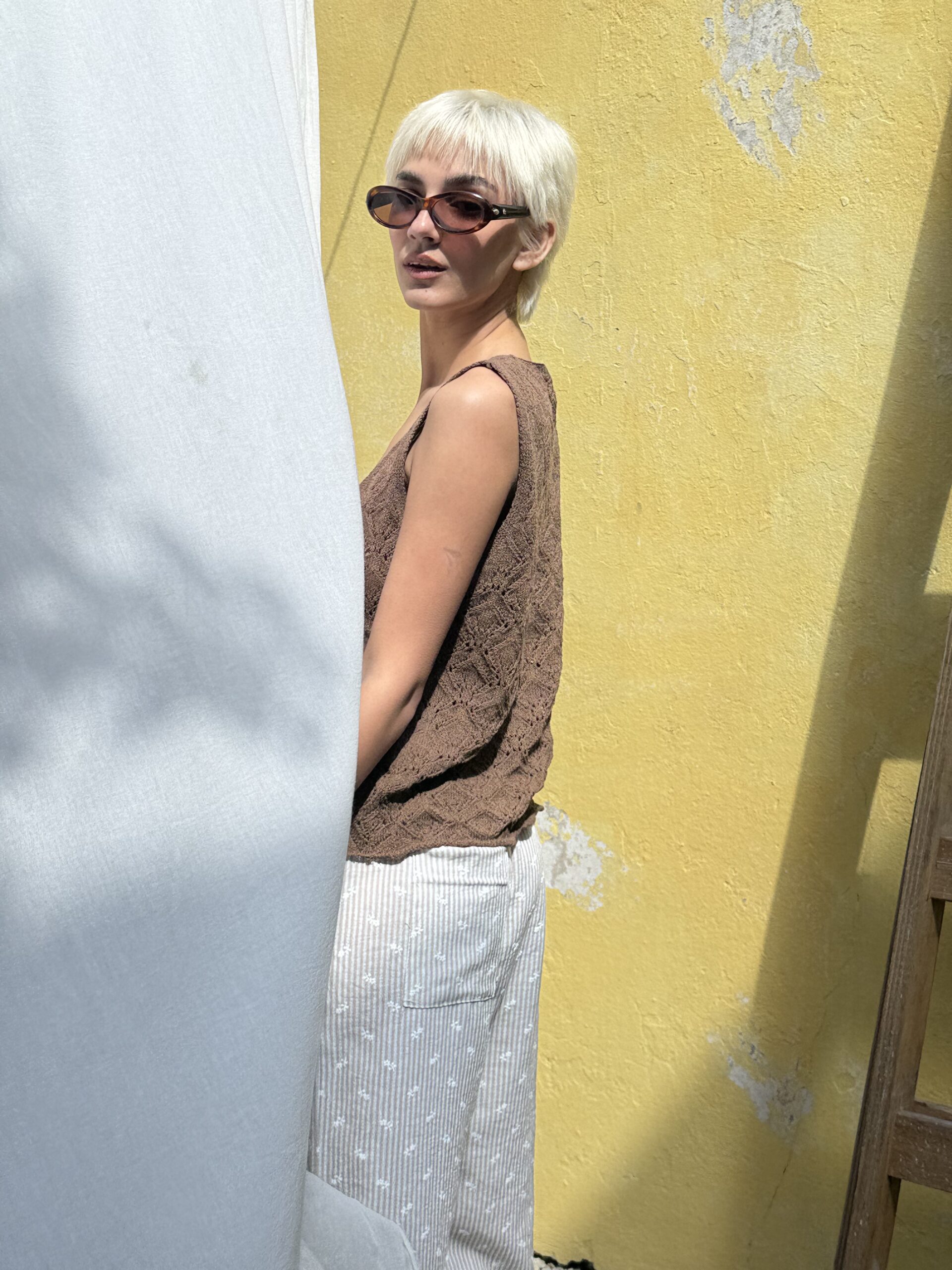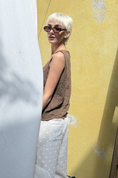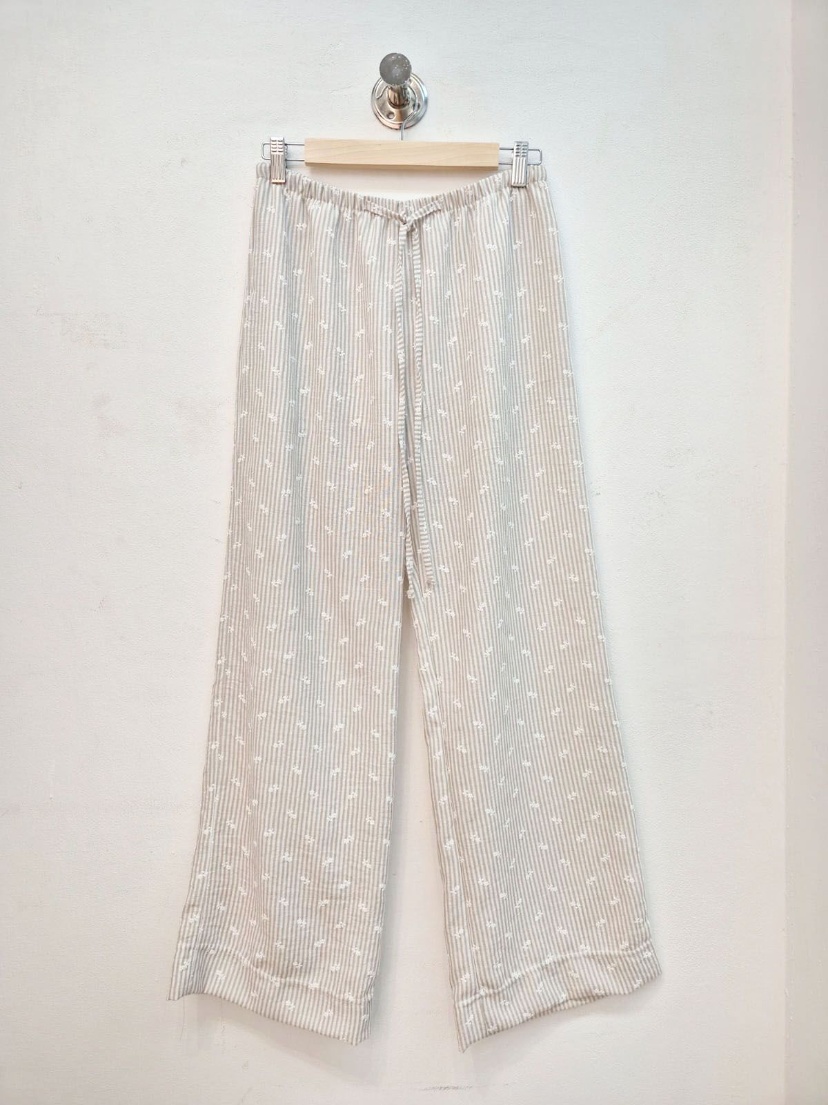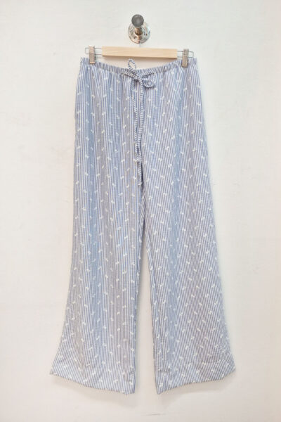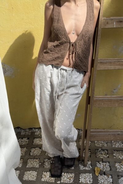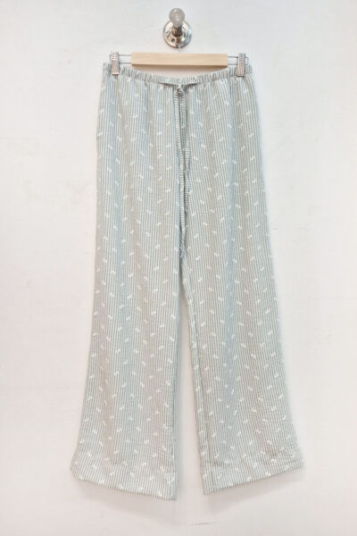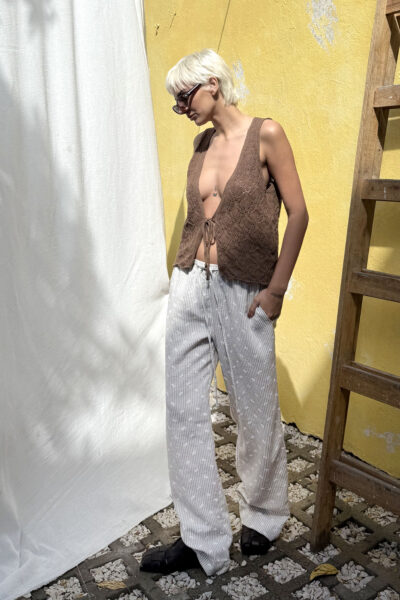 Pantalón confeccionado en lino strapple con estampado de florcitas en relieve. Presenta cintura con elástico, bolsillos laterales y un bolsillo posterior.