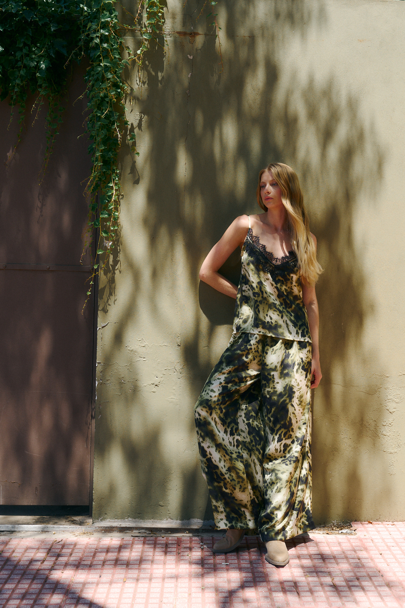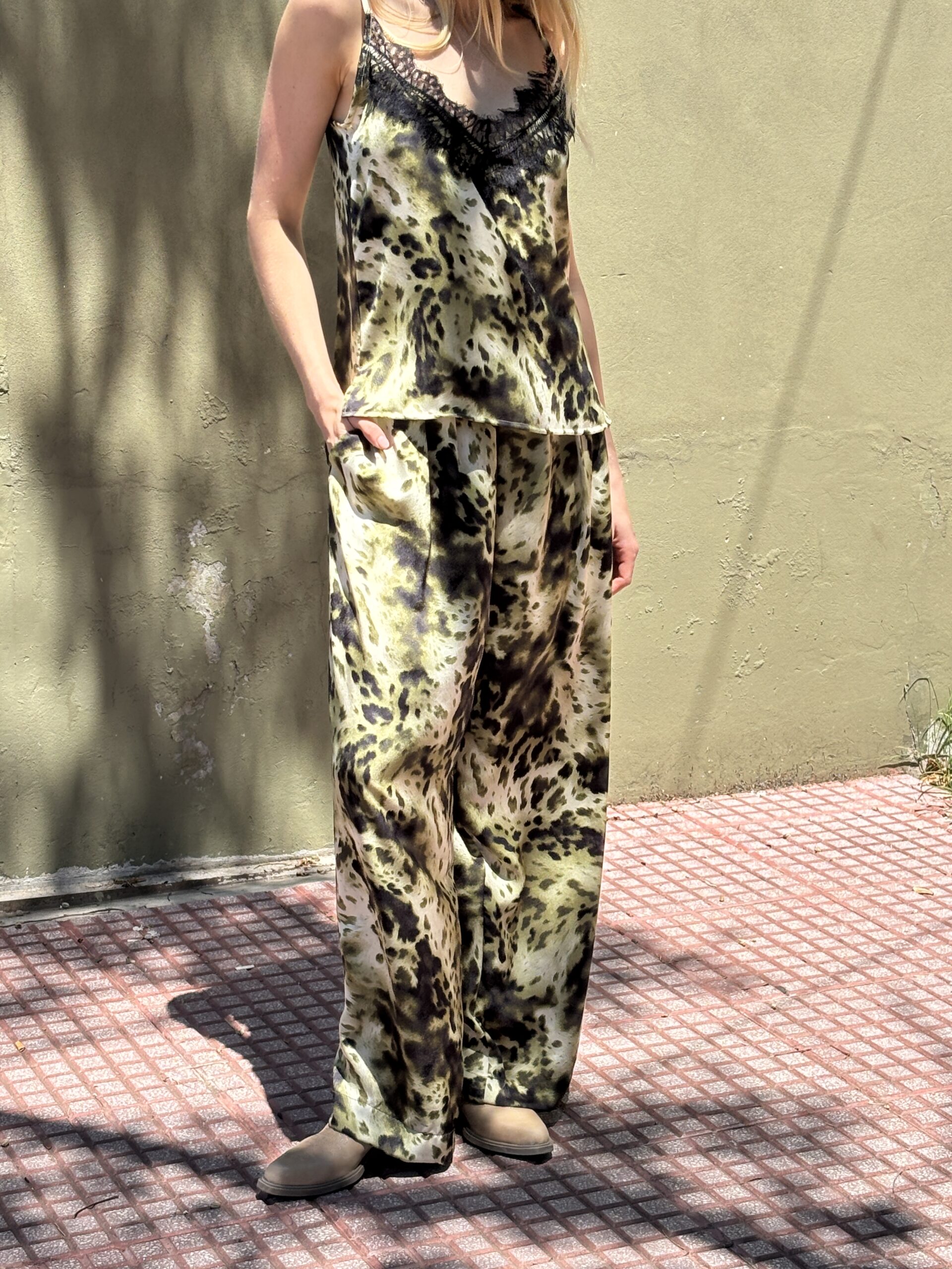 Pantalon confeccionada seda print, con pinzas en la parte delantera y elástico en la cintura.
