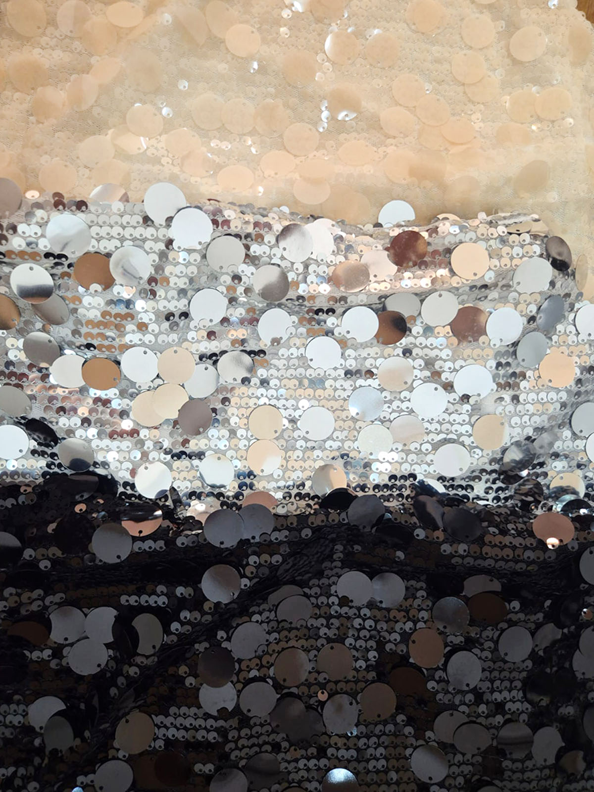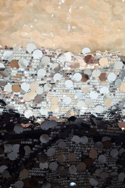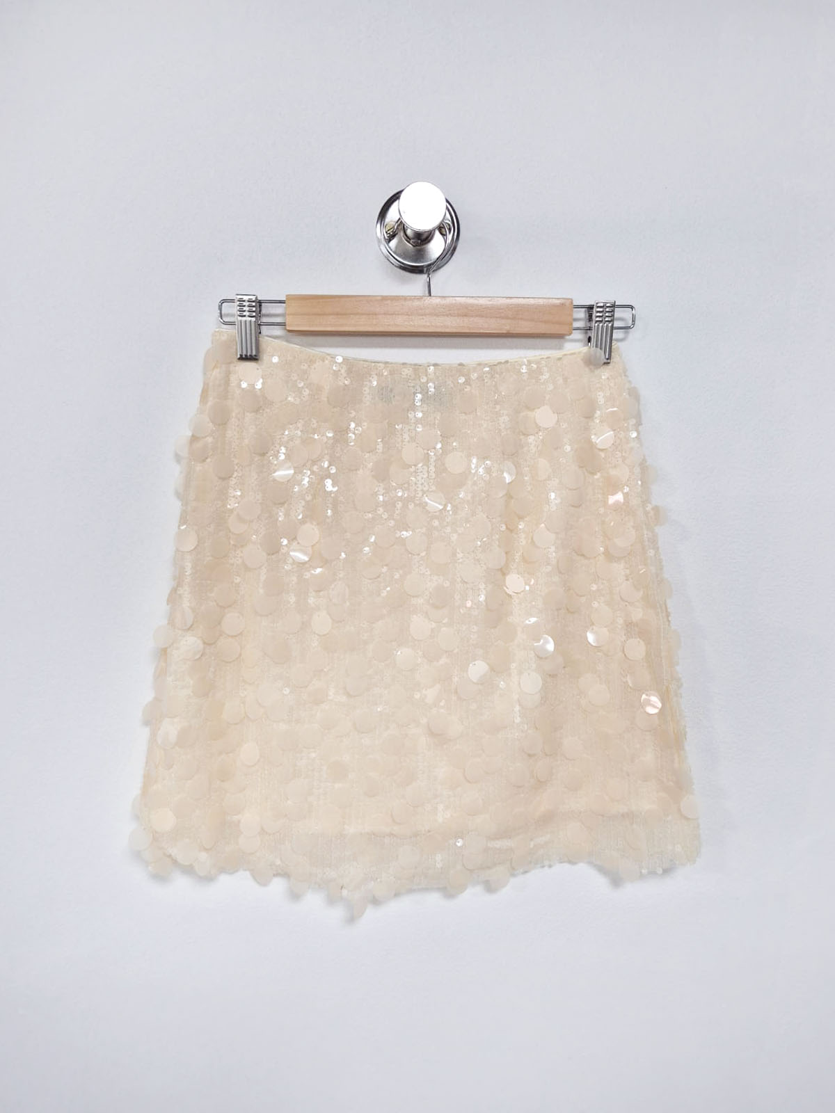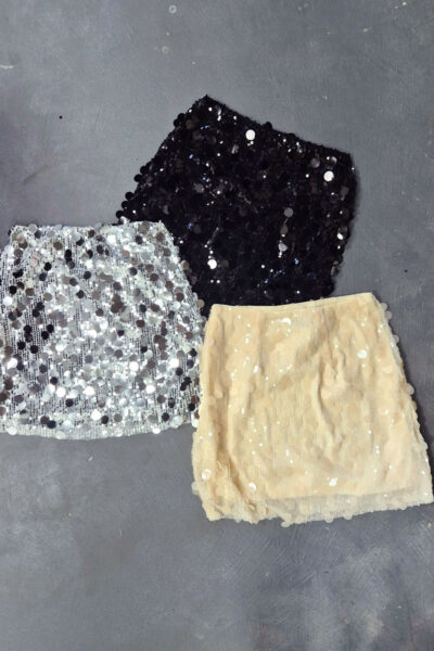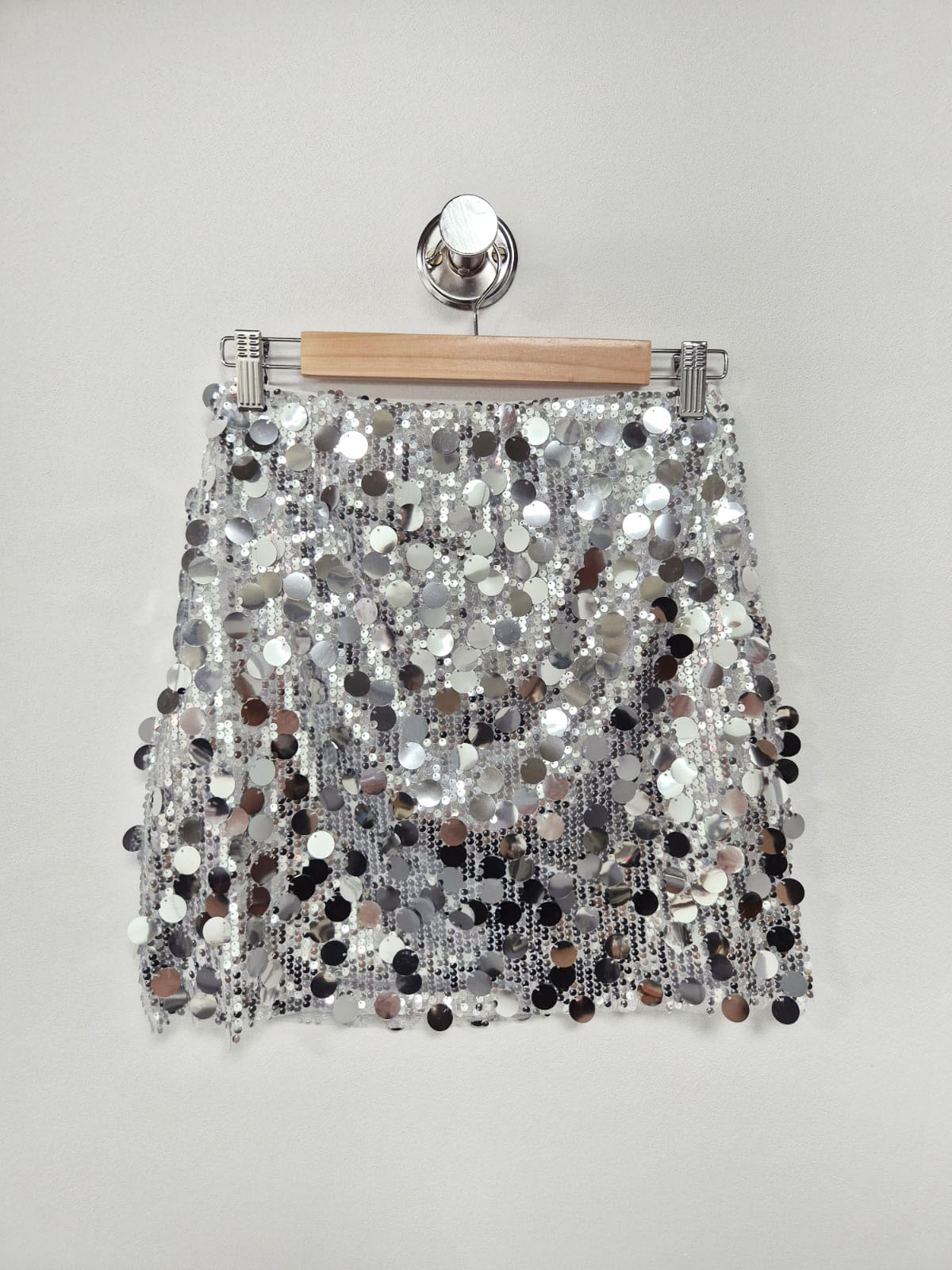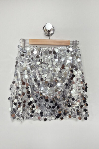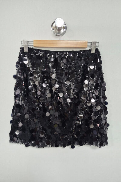 Pollera confeccionada en tela elastizada con lentejuelas, con cierre lateral y forrería interna.