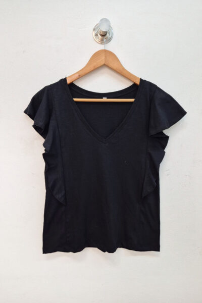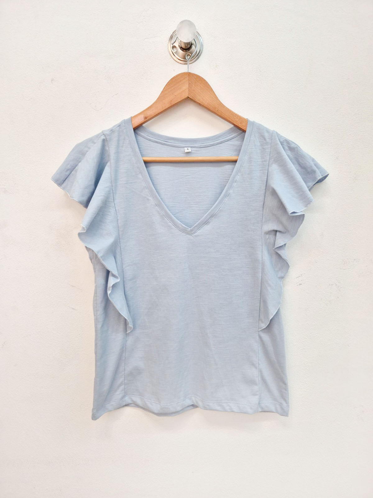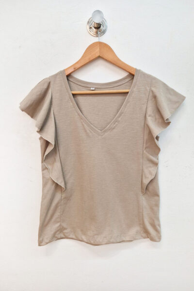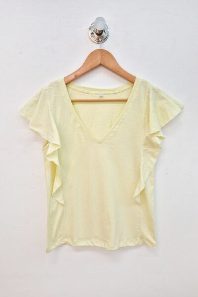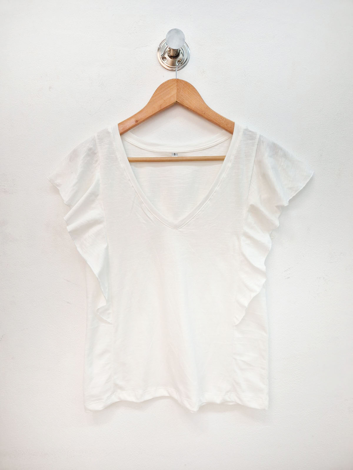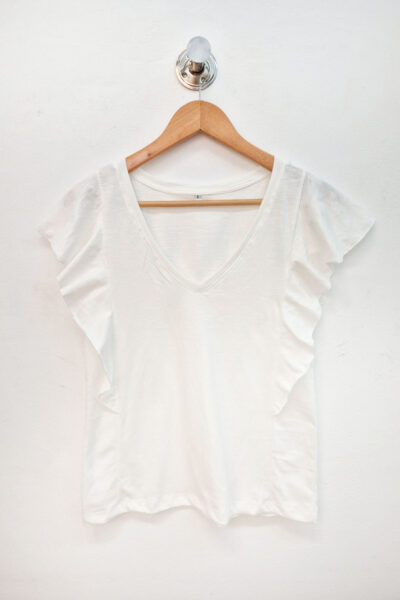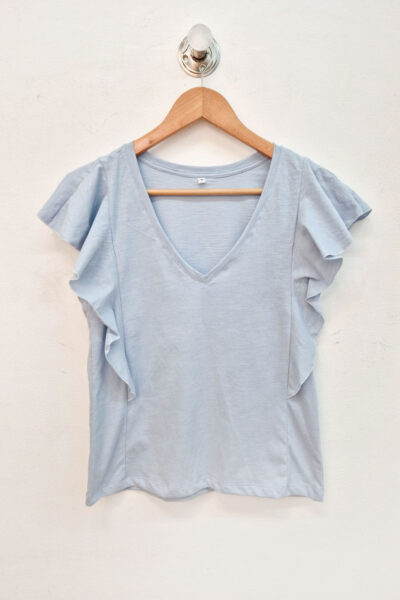 Remera confeccionada en flamé de algodón, con escote en “V” y volados en las mangas.