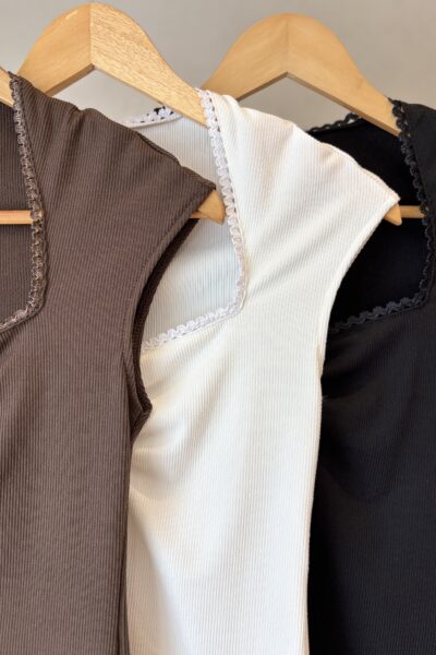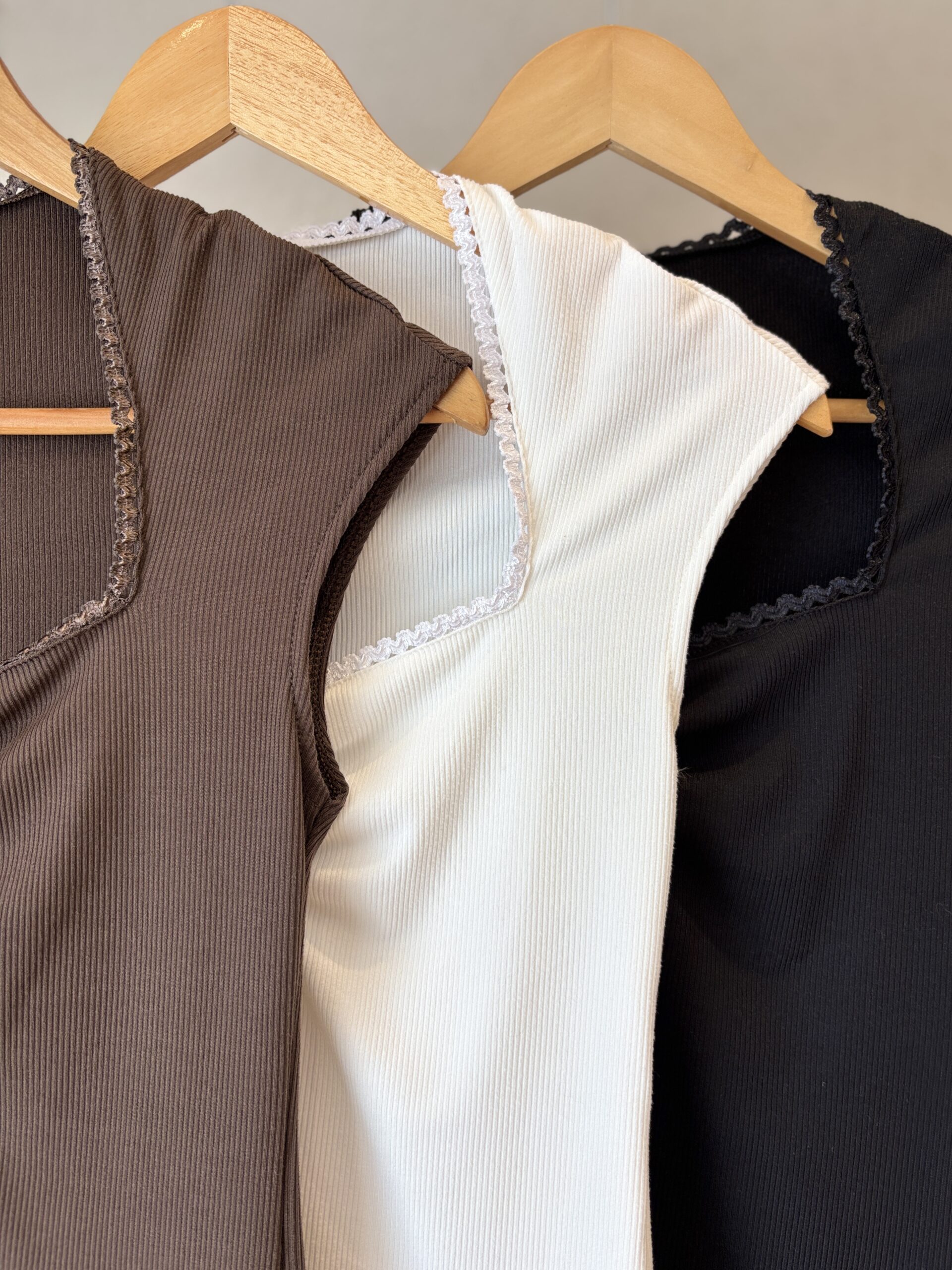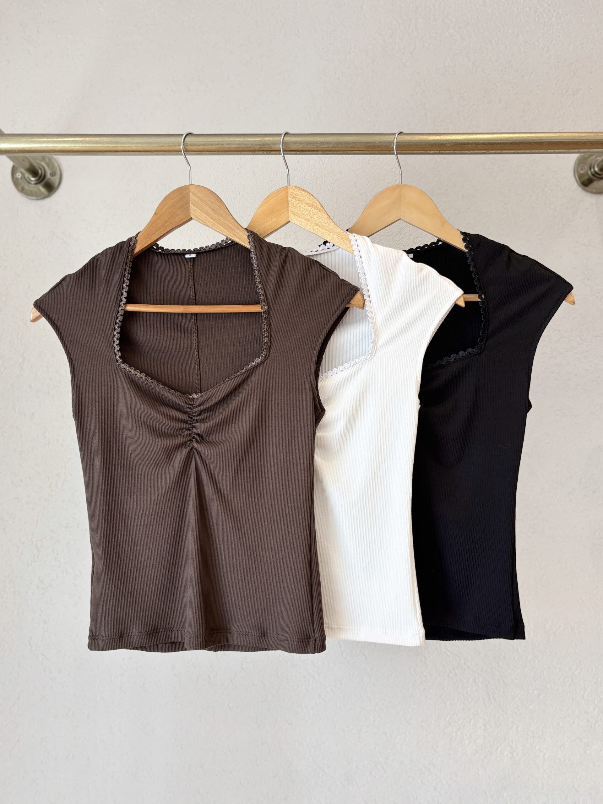 Remera confeccionado en morely con frunce en el pecho y puntilla en los bordes del cuello.