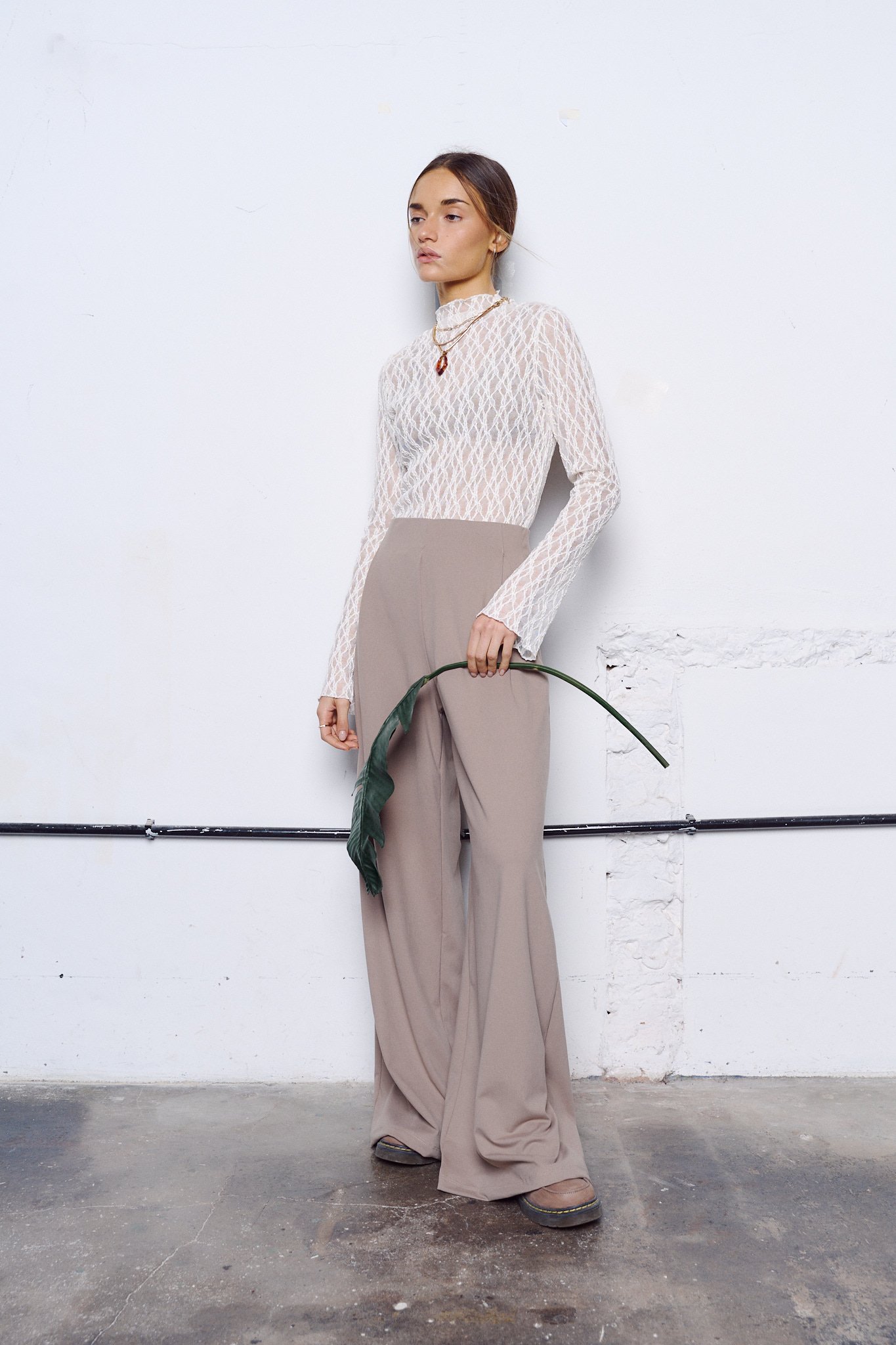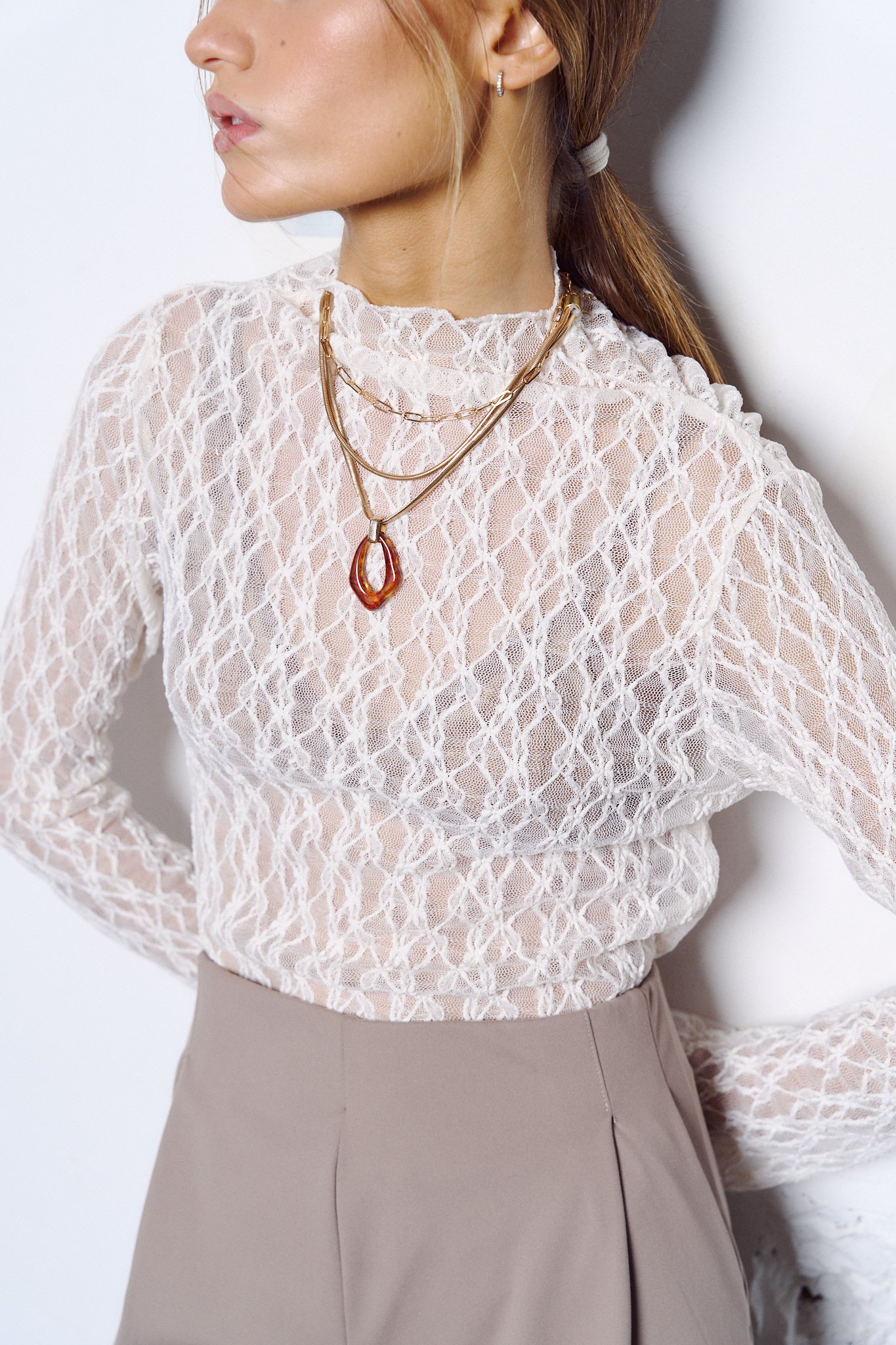 Remera de cuello medio alto confeccionado en encaje con lycra. Las mangas son semi oxford y tiene frunce en una parte del hombro y cintura.
