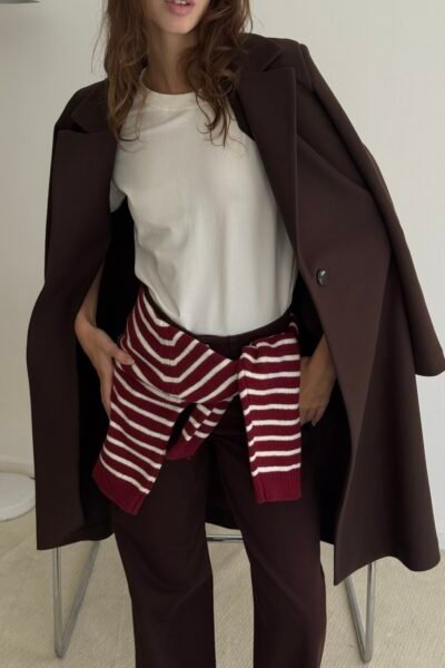 Tapado confeccionado en paño punto recto con un boton y bolsillos.