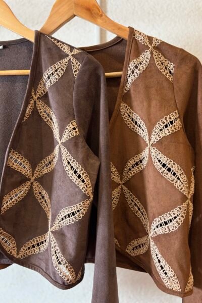 Saco de mangas largas confeccionado en gamuza con bordado.