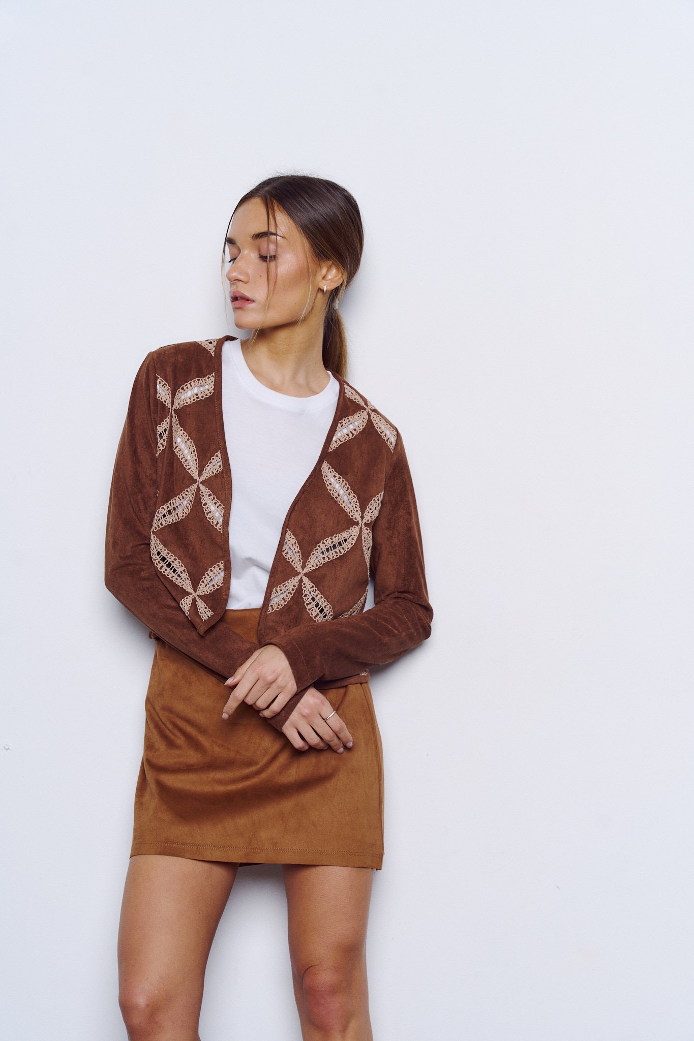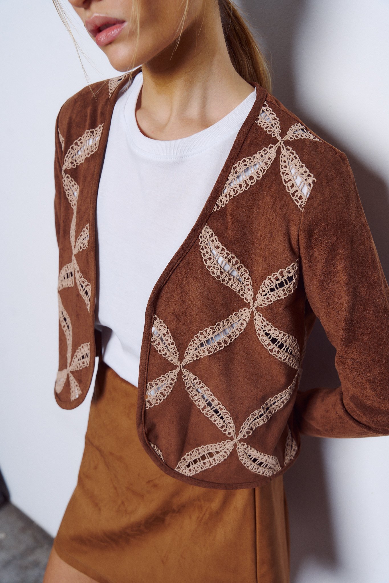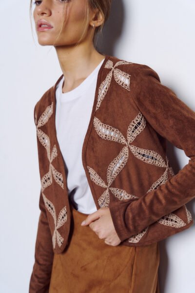 Saco de mangas largas confeccionado en gamuza con bordado.