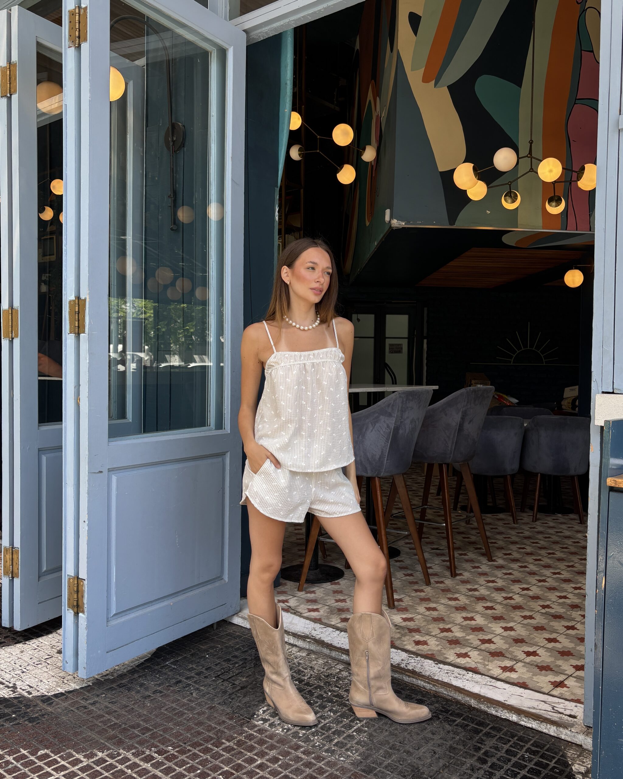 Short confeccionado en lino straple con bordado y lazos en la cintura para ajustar a medida. Hace conjunto con la musculosa Orlina.