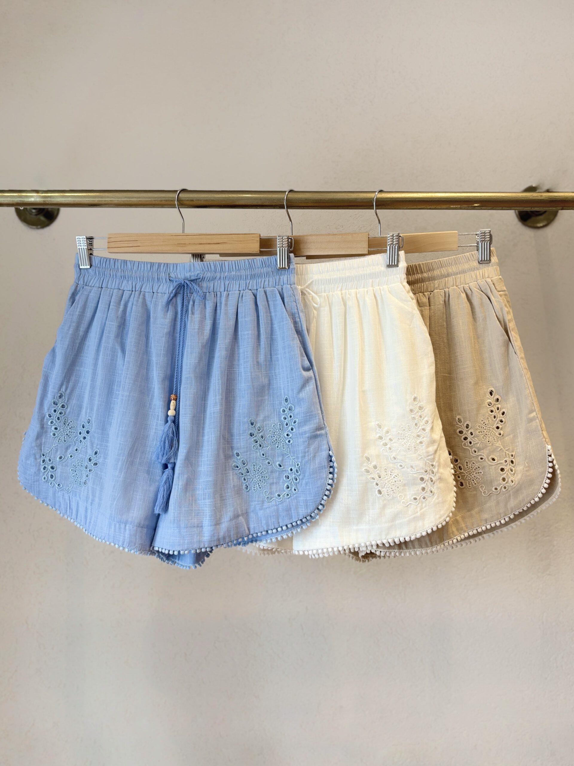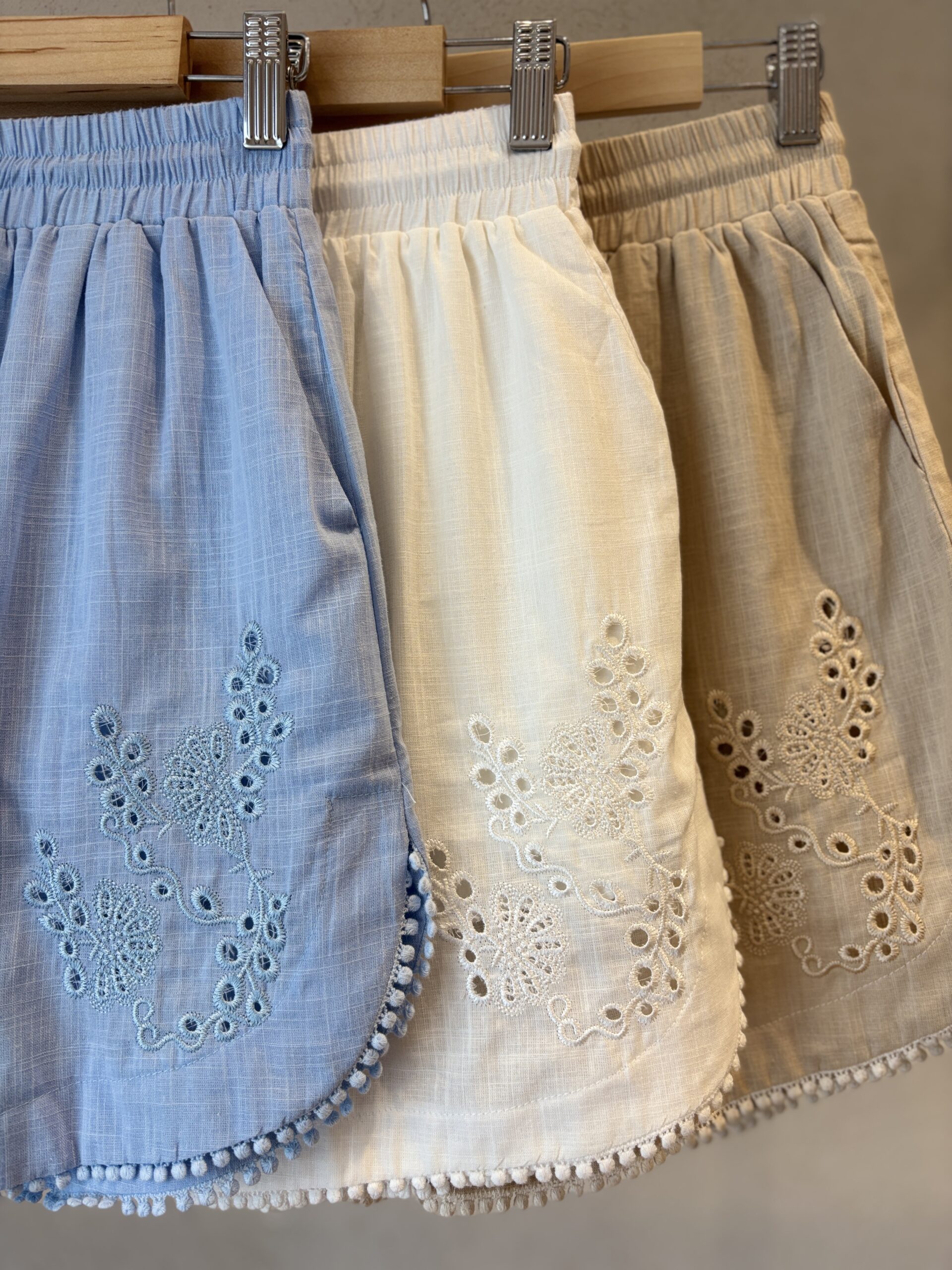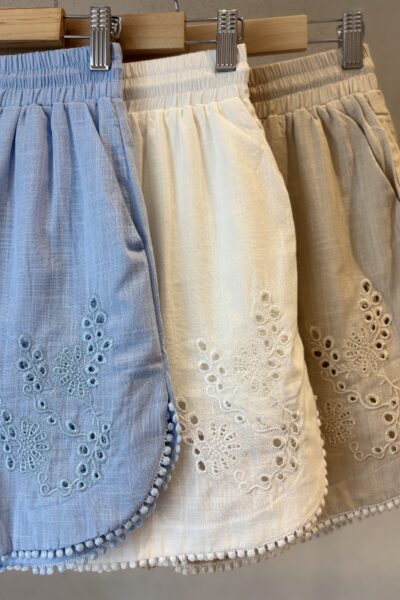 Short confeccionado en algodón con bordado. Esta forrado por dentro y tiene lazos en el cinturón para ajustar a medida.