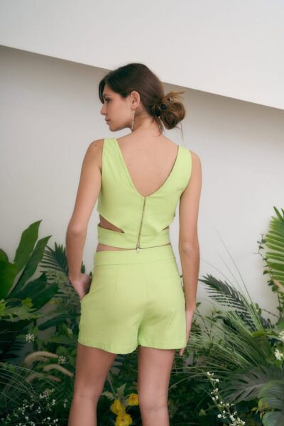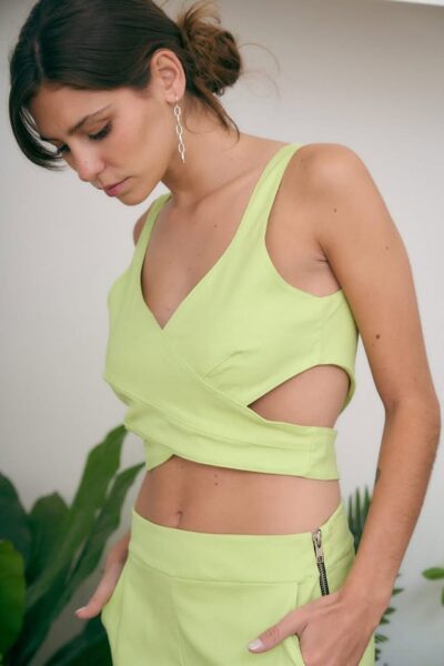 Top confeccionado en lino sastrero, con calado en los laterales y diseño cruzado en el delantero. Acceso mediante cierre en la espalda.