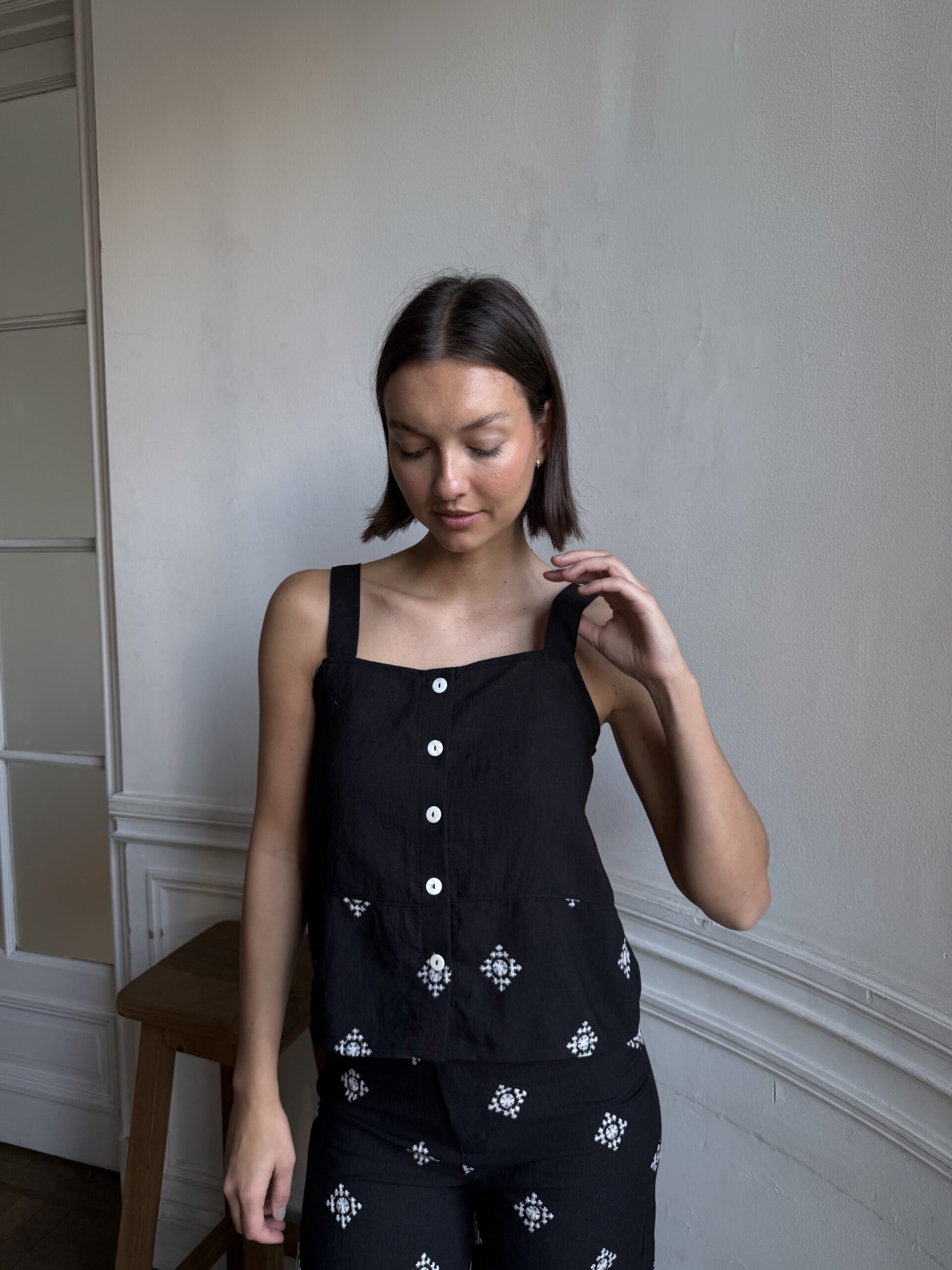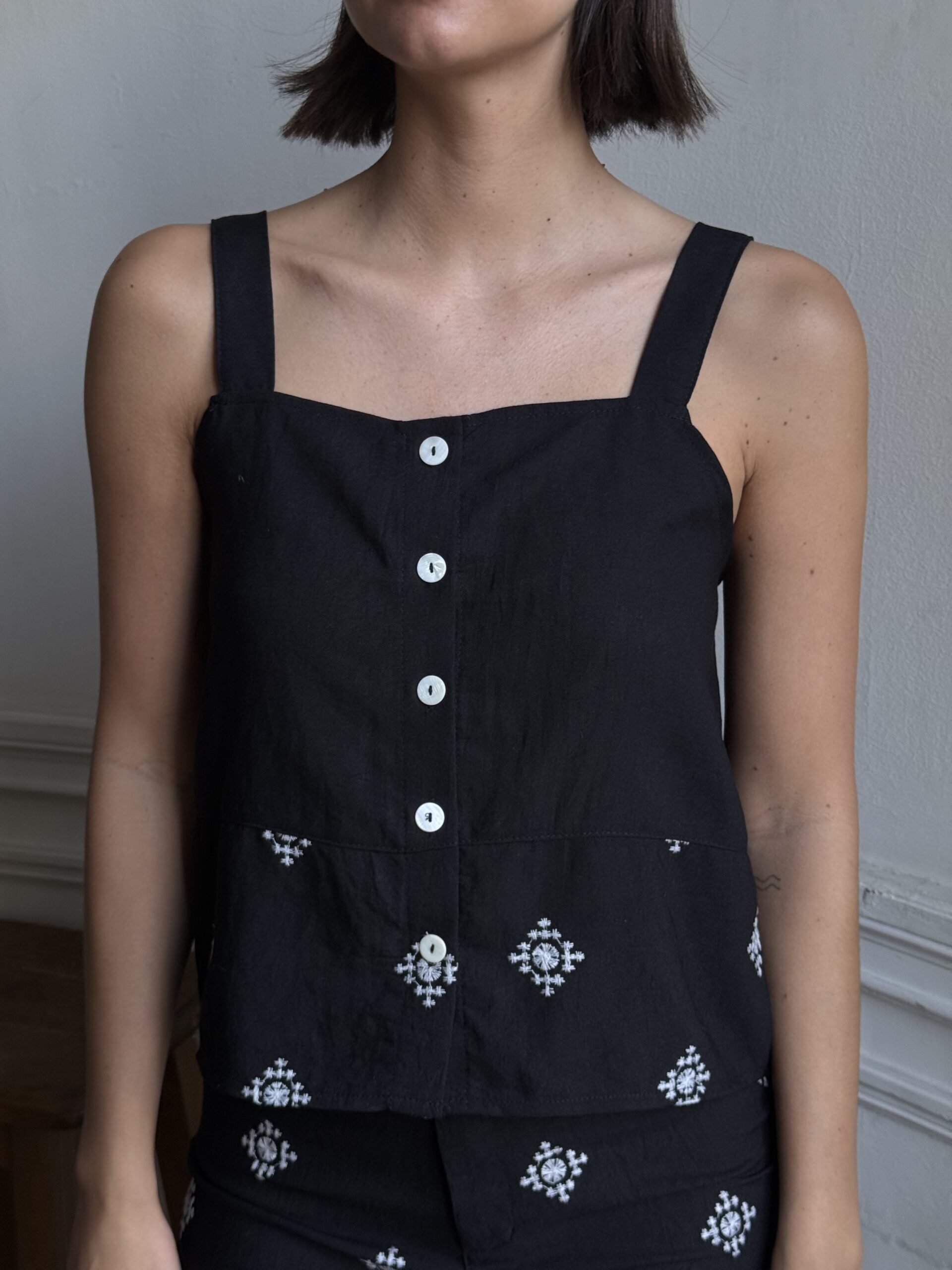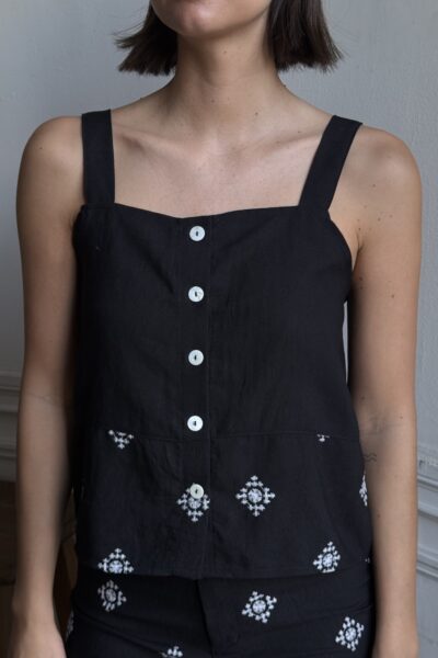 Top confeccionado en lino bordado con botones.
