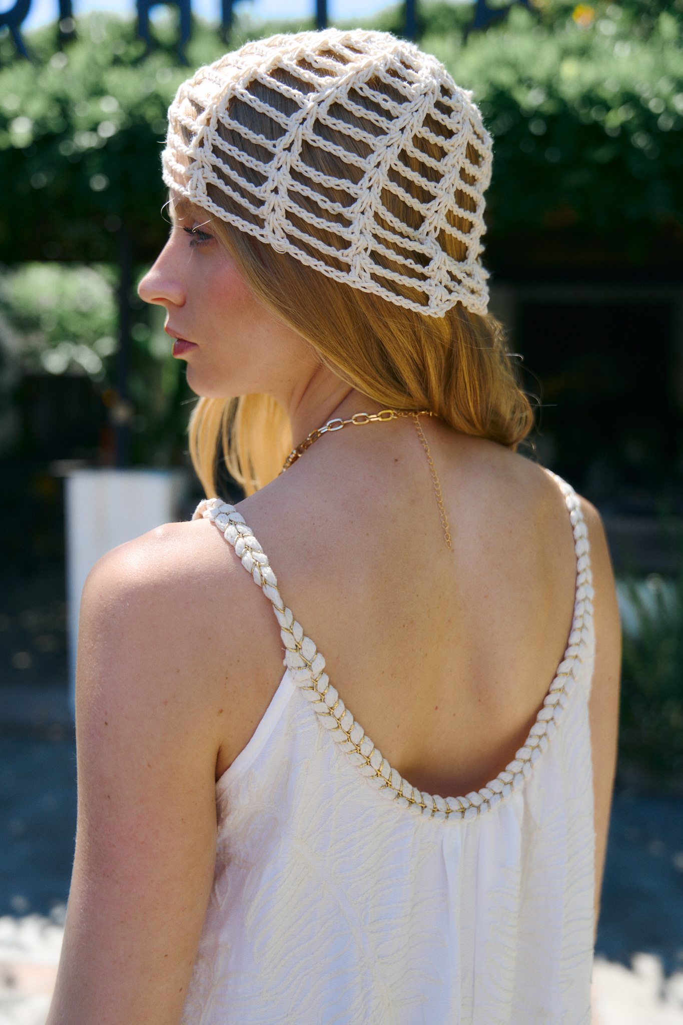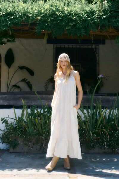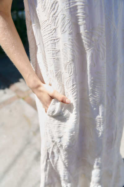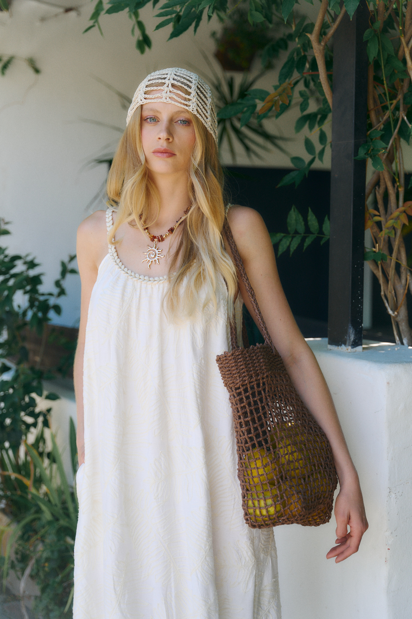 Vestido confeccionado en poliamida con viscosa bordado y tiras de cordón.