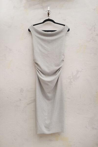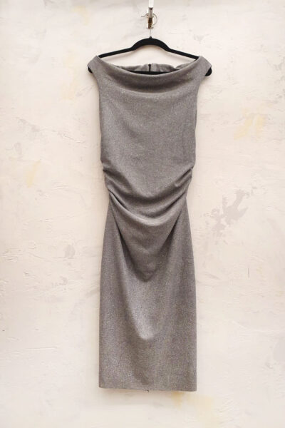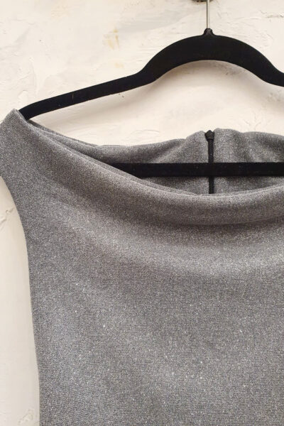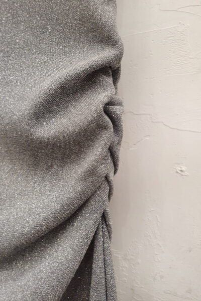Vestido de noche confeccionado en crepé con glitter. Diseño de un solo hombro, con frunces y elástico en la cintura para un mejor ajuste.